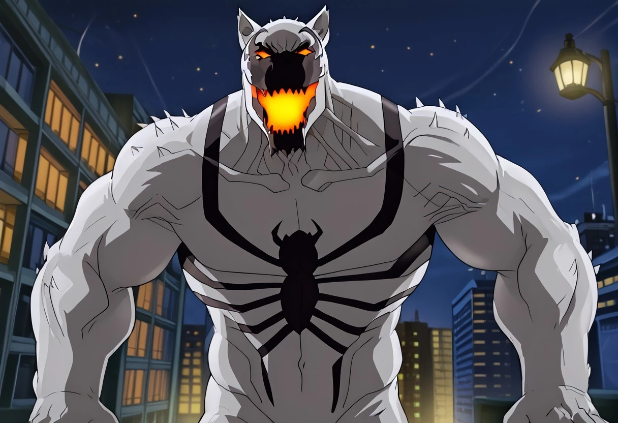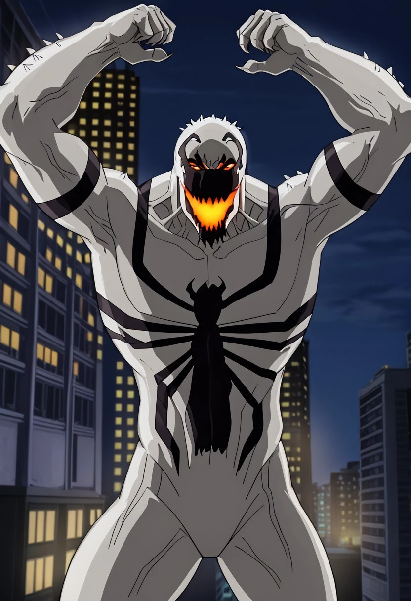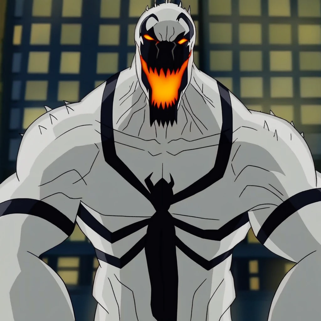 ultimate_anti-venom/(marvel)XL, symbiote, long_tongue, sharp_teeth, glowing_mouth, glowing_eyes, red_eyes, orange_eyes, claws, 1boy, solo, spiderprint, monsterboy,The Ultimate Spider-Man Series from 2012