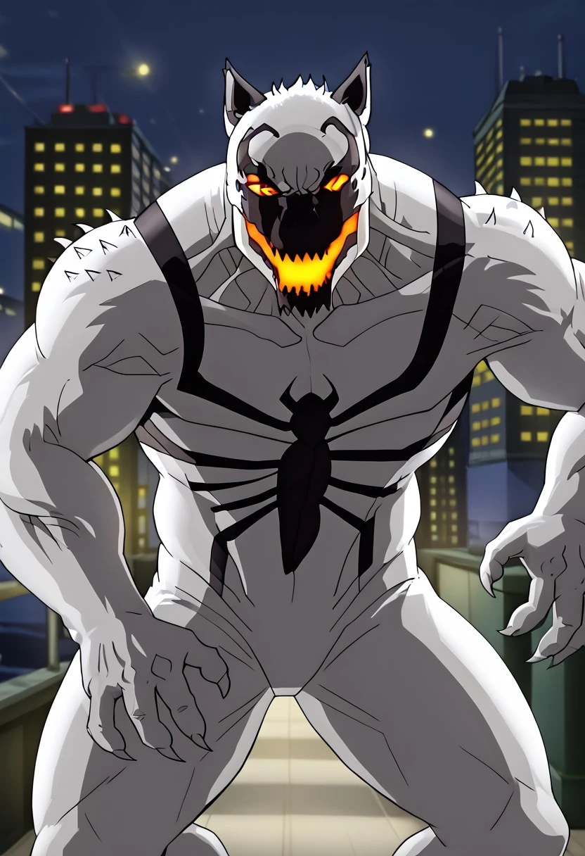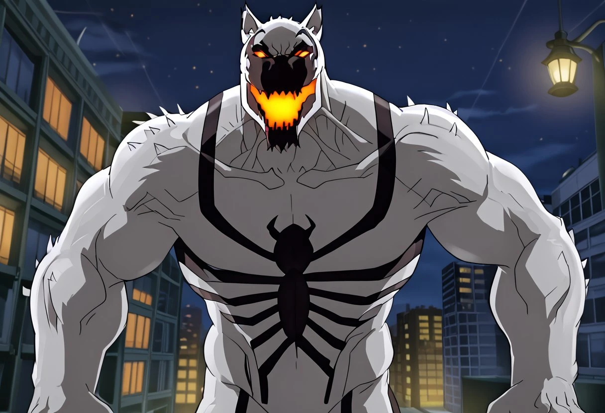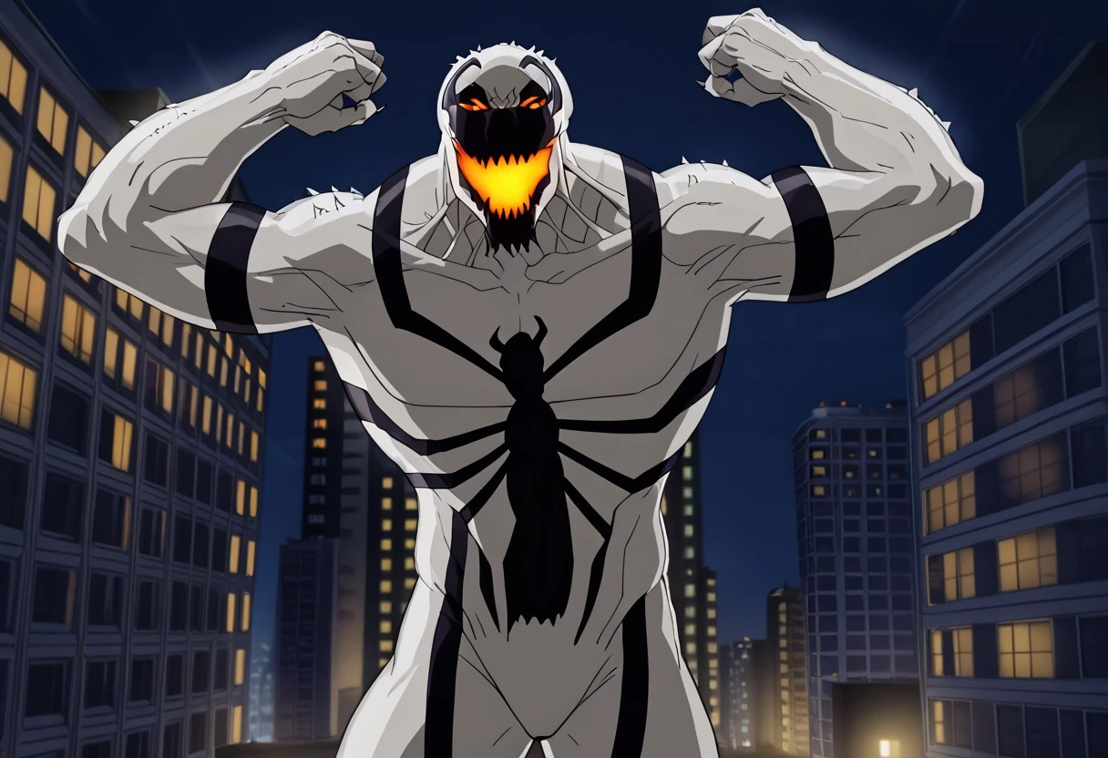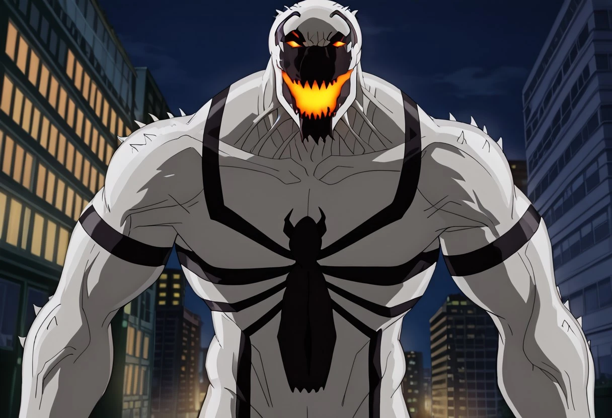 ultimate_anti-venom/(marvel)XL, symbiote, long_tongue, sharp_teeth, glowing_mouth, glowing_eyes, red_eyes, orange_eyes, claws, 1boy, solo, spiderprint, monsterboy,