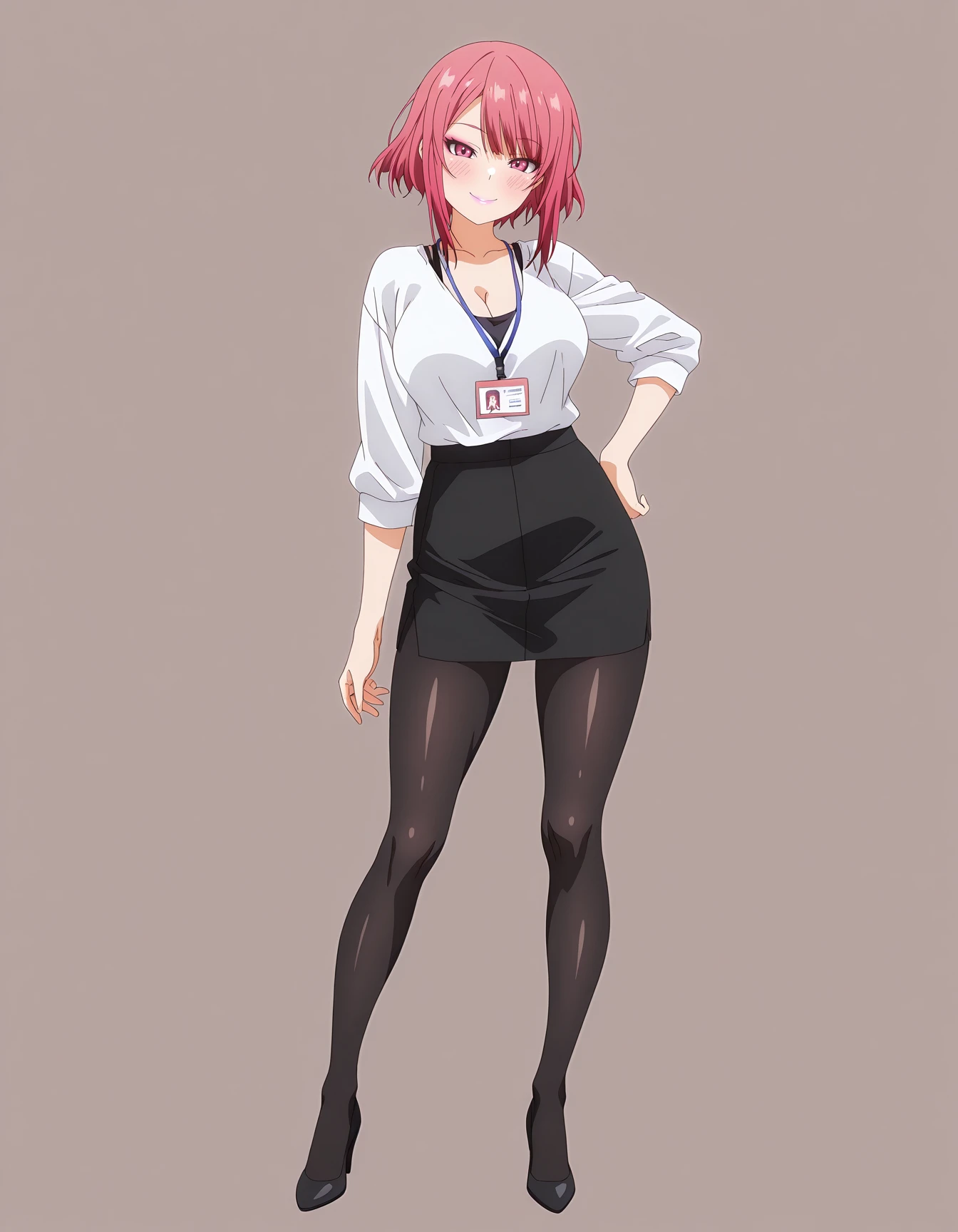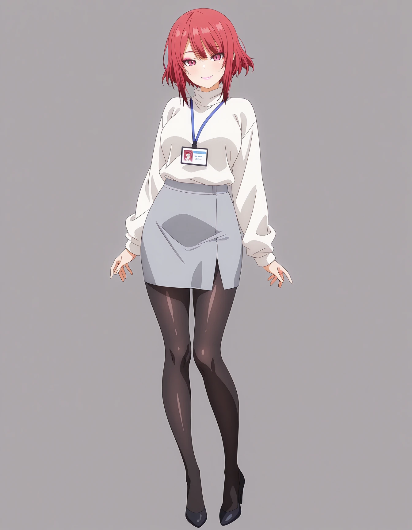 mai_kkk,mai_mihokk,short_hair,red_hair,pink_eyes,makeup,pink_lips,white_turtleneck_sweater,grey_skirt,black_pantyhose,black_high_heels,id_card,lanyard