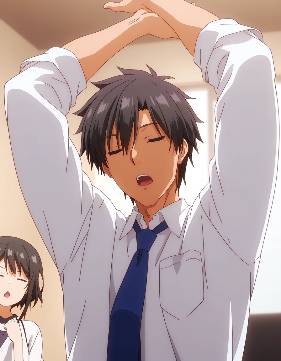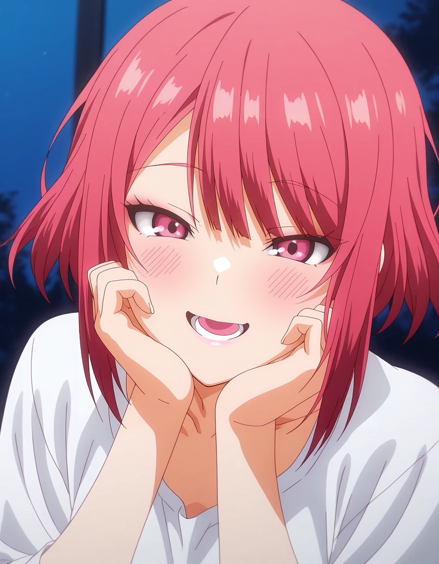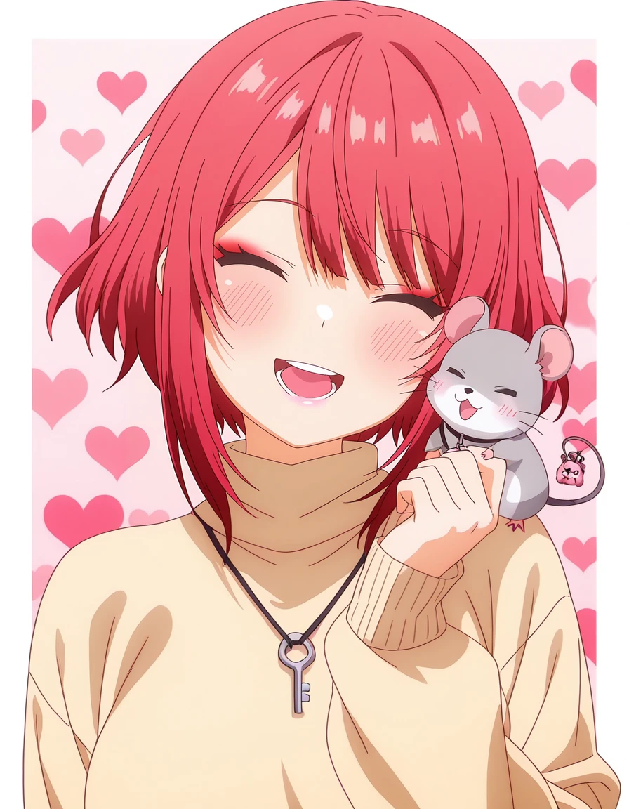 mai_kkk,mai_mihokk,short_hair,red_hair,pink_eyes,makeup,pink_lips,white_turtleneck_sweater,grey_skirt,black_pantyhose,black_high_heels,id_card,lanyardYou can also refer to the example to create the male protagonist and the supporting female character 'Shiori Nakamura 中村栞'.
