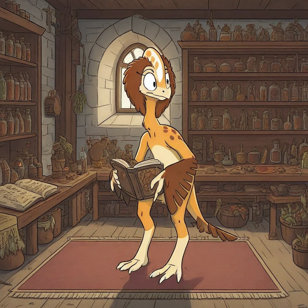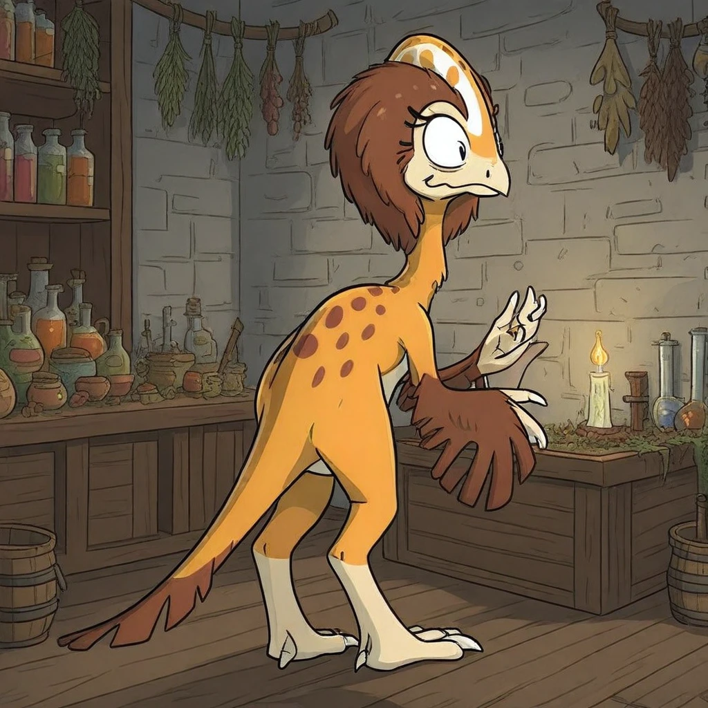Healer, caenagnathus, female, dinosaur legs, orange skin, 3 fingers, 3 toes, brown feathered, head with crest,