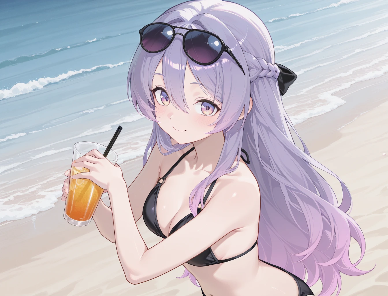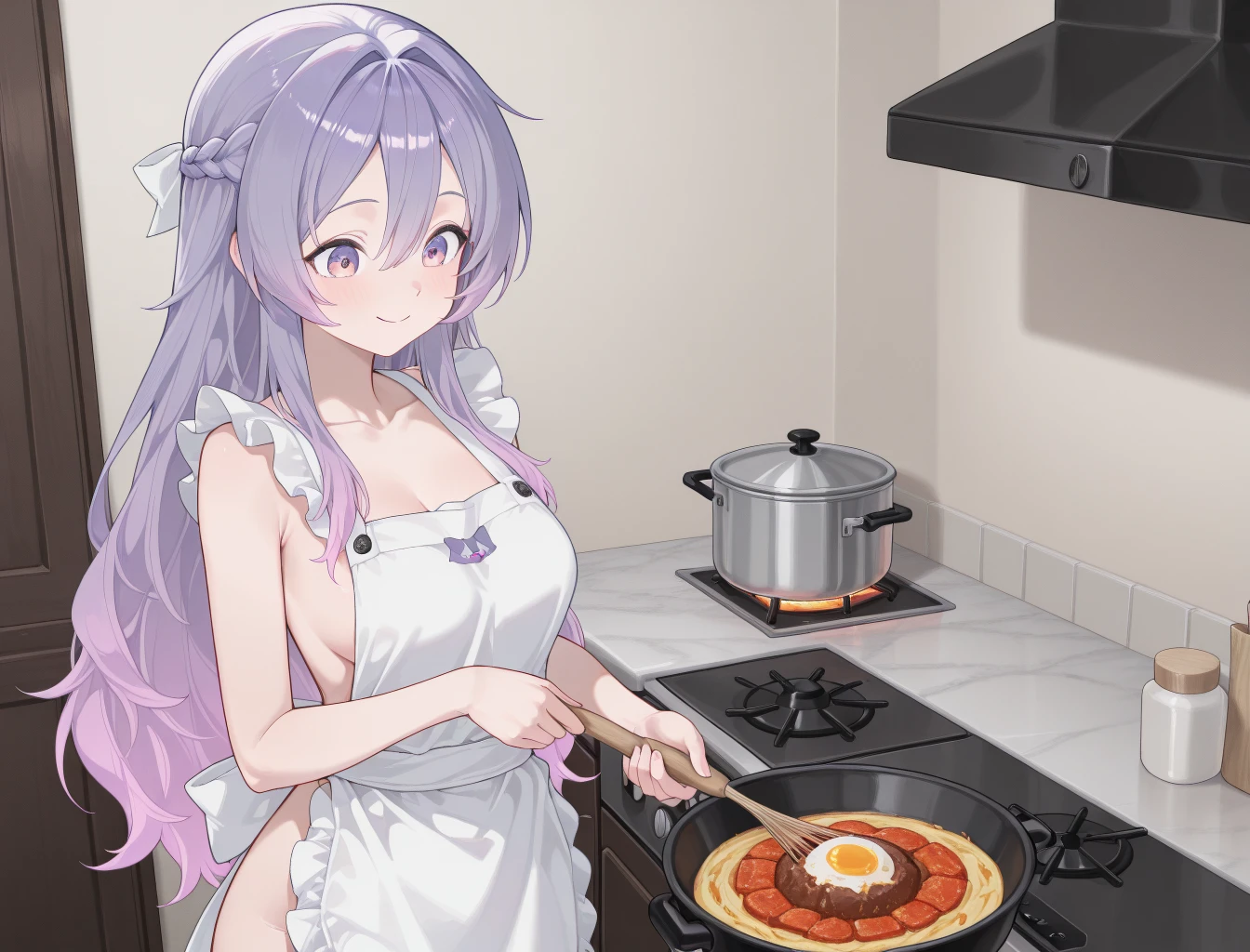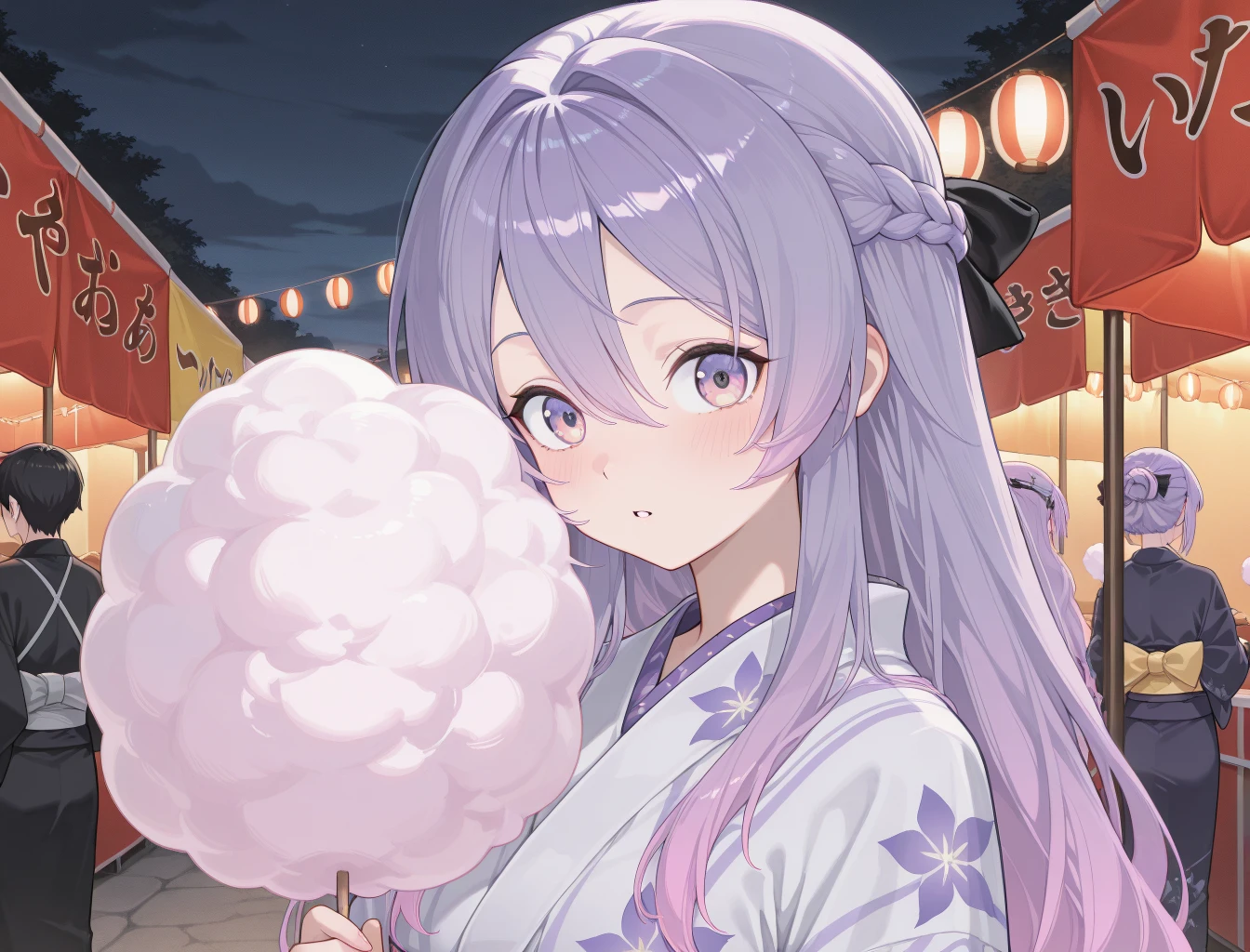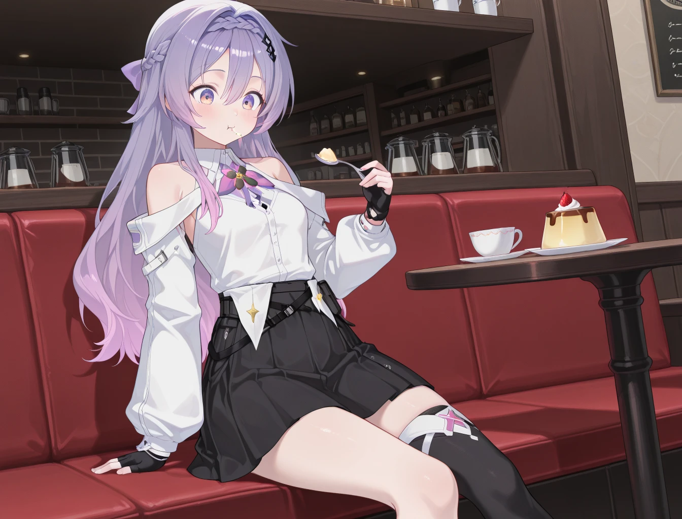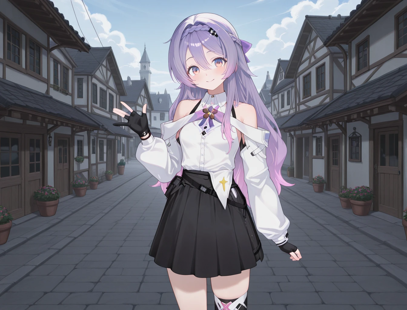 CZN_Luche, long_hair, purple_hair, bangs, braid, purple_eyes, multicolored_hair, crown_braid, multicolored_eyes, pink_hair, hair_between_eyes, gradient_hair, french_braid, very_long_hair, gloves, thighhighs, fingerless_gloves, white_shirt, skirt, shirt, black_skirt, single_thighhigh, black_gloves, long_sleeves, bare_shoulders, single_glove, black_thighhighs, jacket, asymmetrical_legwear, bow, off_shoulder, collared_shirt, hair_bow, white_jacket, hair_ornament, puffy_sleeves, clothing_cutout, puffy_long_sleeves, hairband, shoulder_cutout, headband, partially_fingerless_gloves, sleeves_past_wrists, belt, purple_bow, ribbon, thigh_strap, pleated_skirt, detached_sleeves