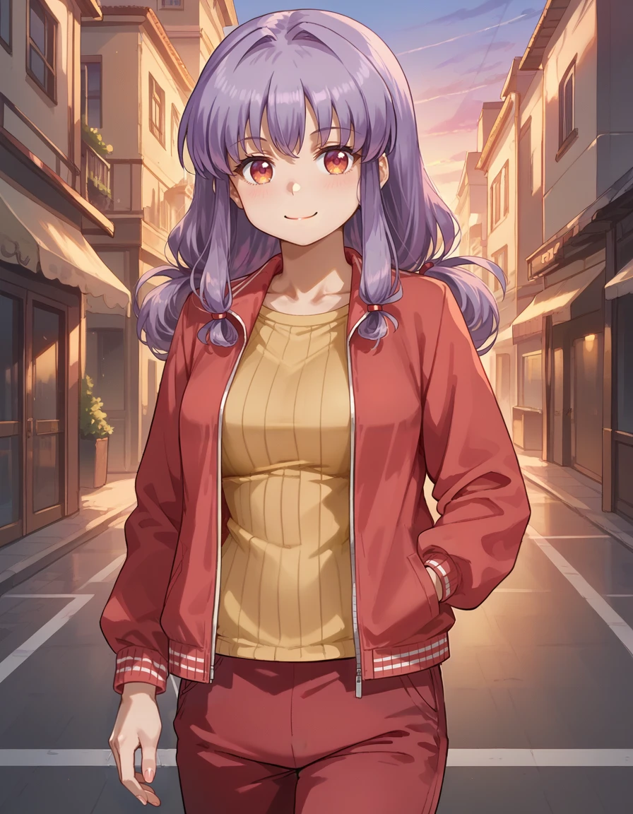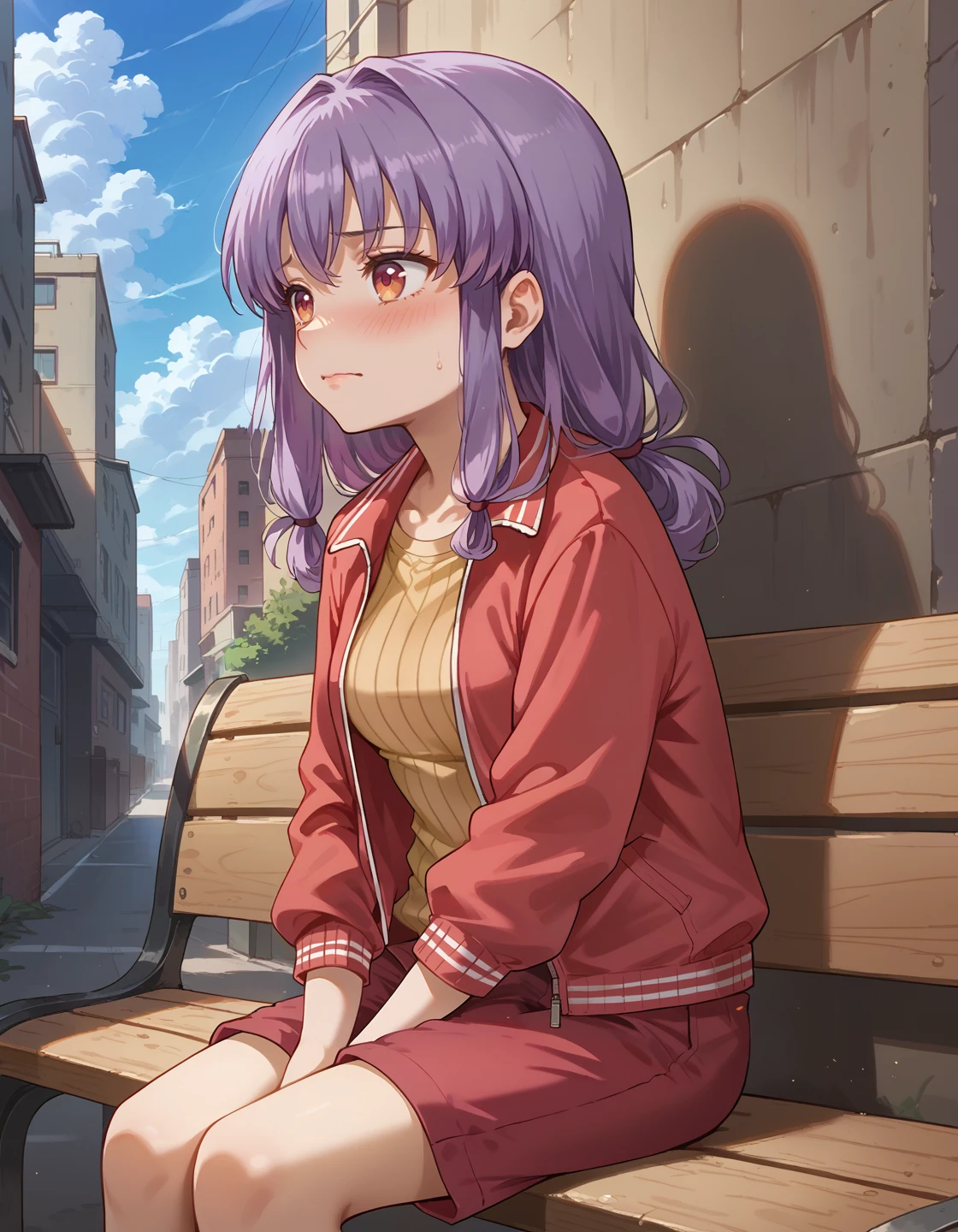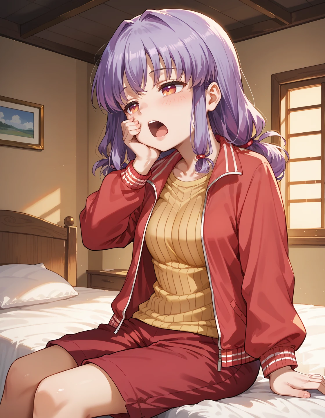 mgrcinamimitsuru, purple hair, pink eyes, red hairpins, yellow striped t-shirt, red sport jacket, red shorts