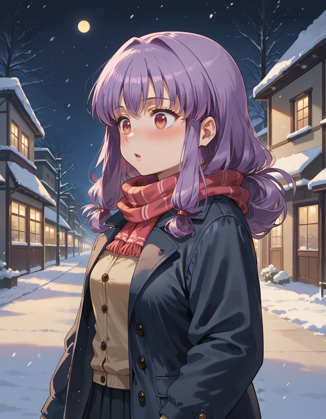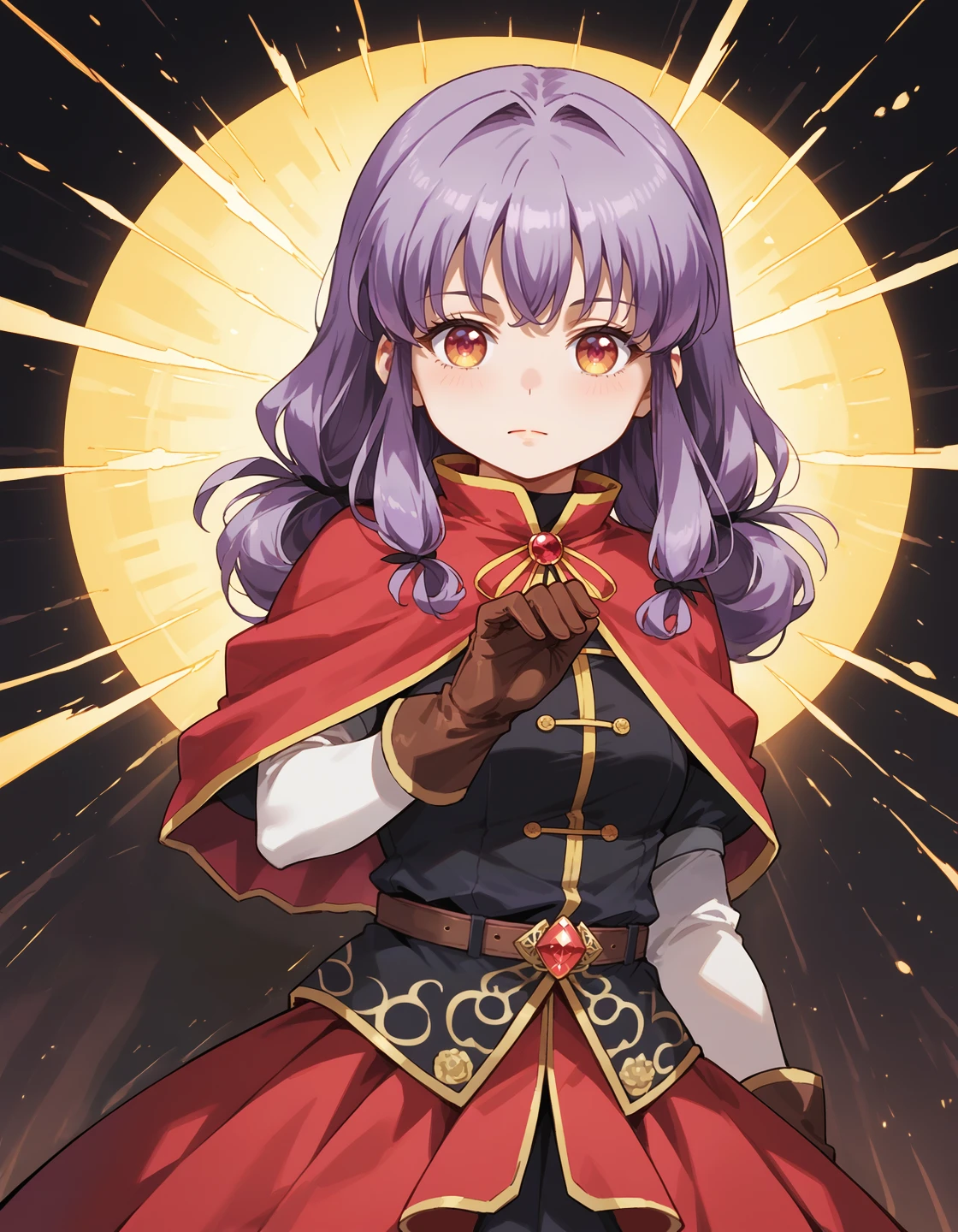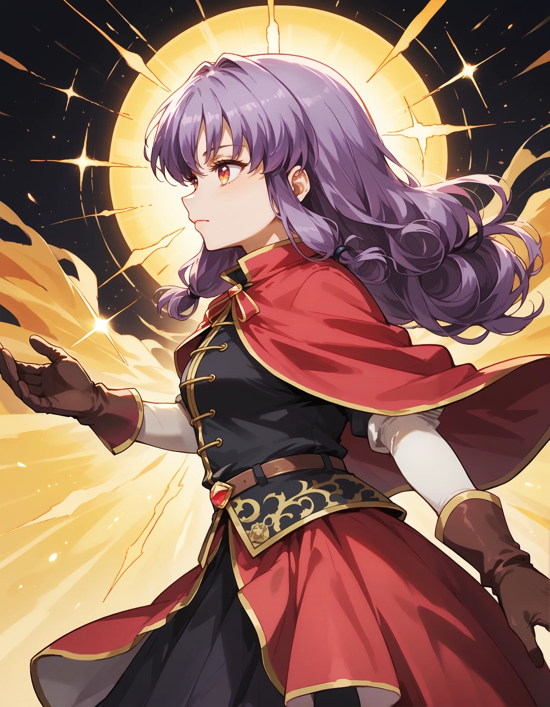 mgrcinamimitsuru, purple hair, pink eyes, black hairpins, red with yellow capelet, black with yellow shirt, belt with red gem, long white sleeves, brown gloves, black with yellow skirt, red with yellow overskirt