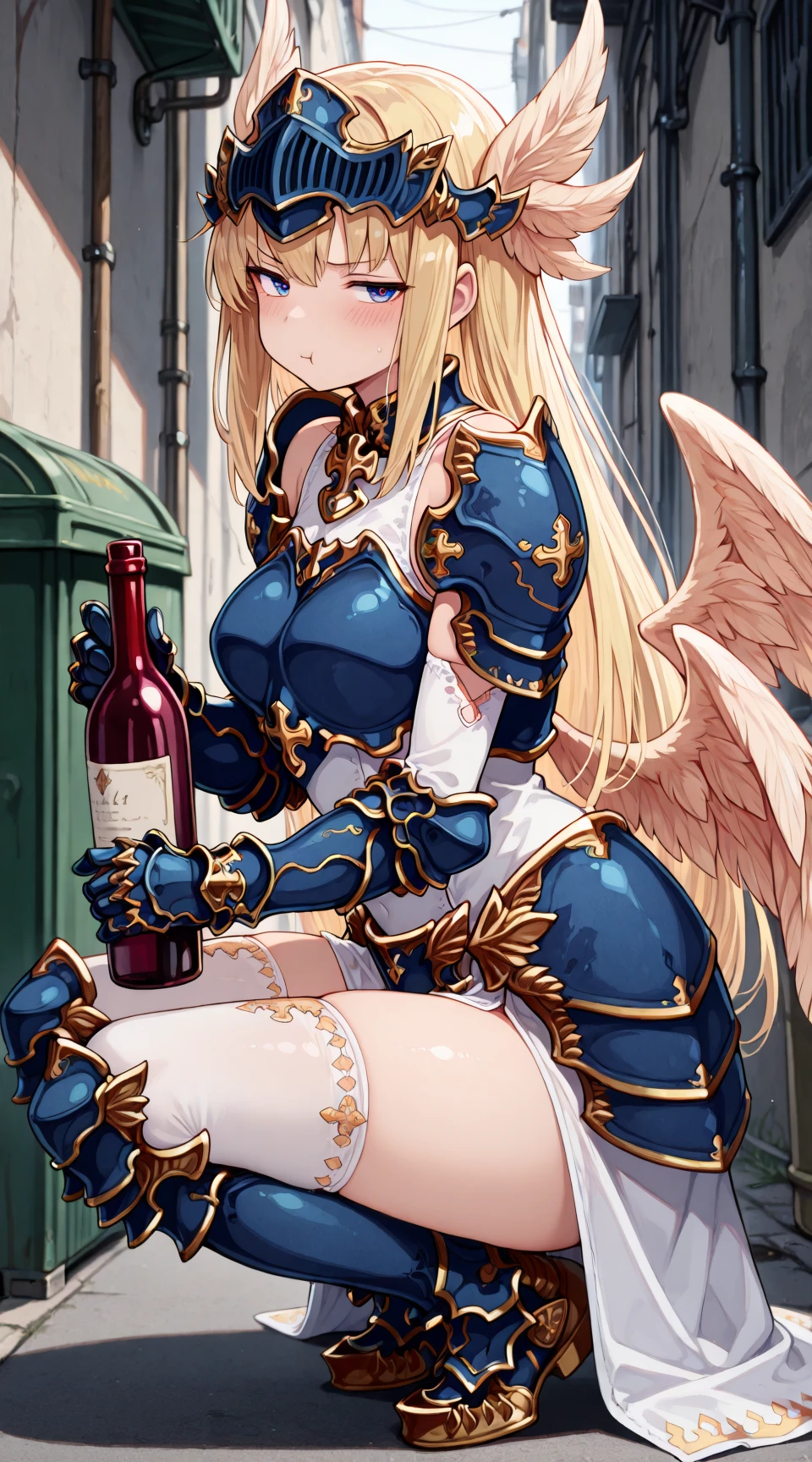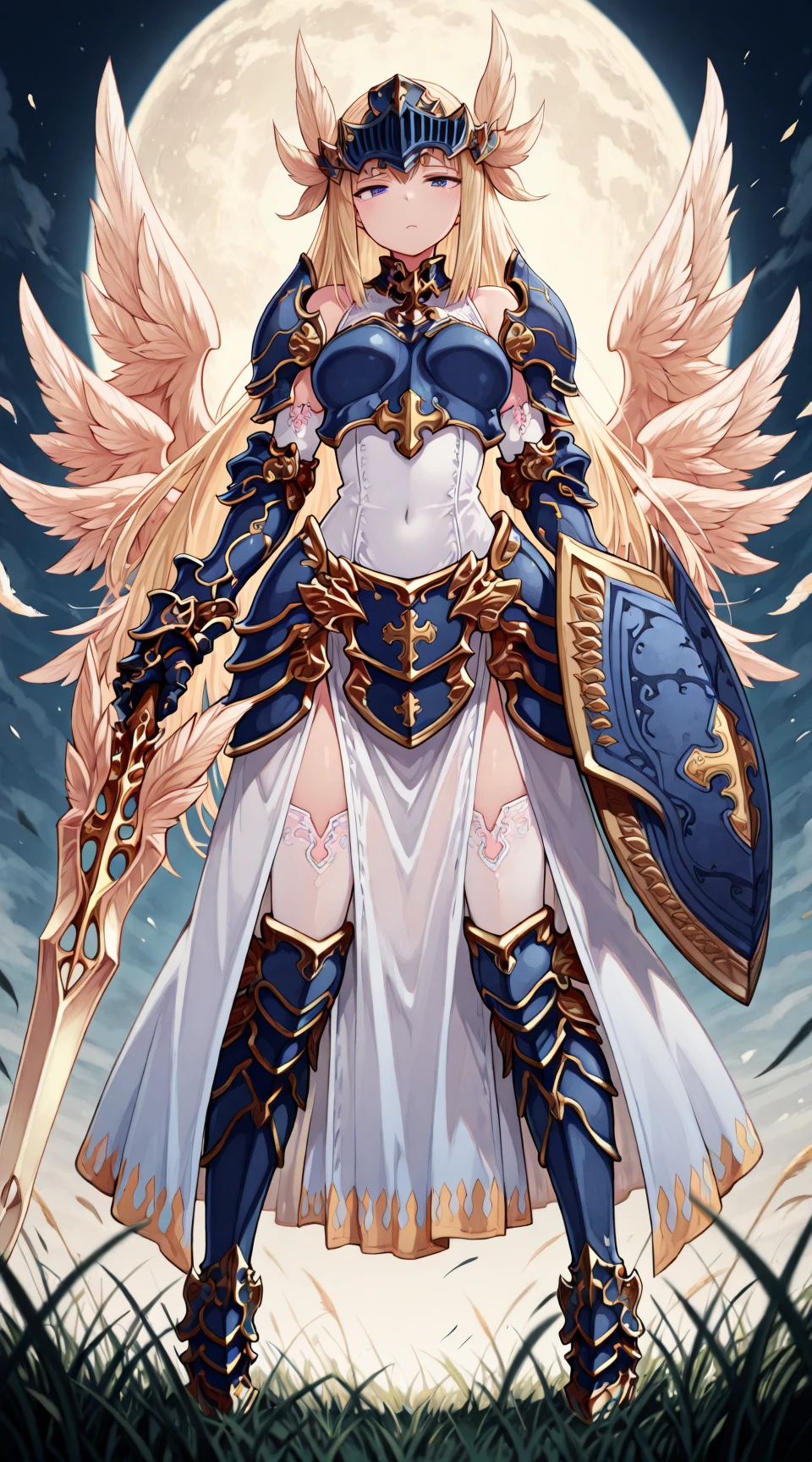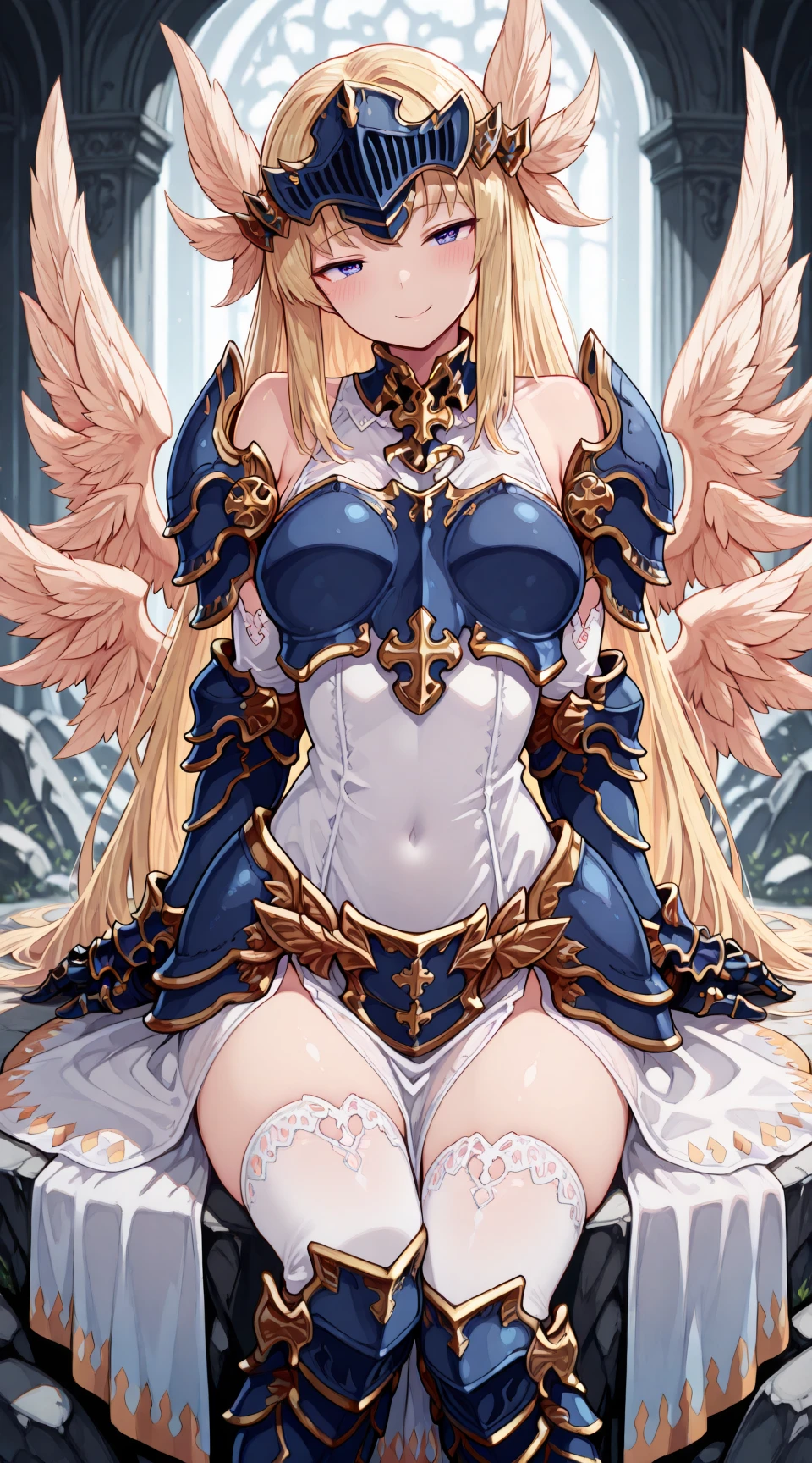 Basic prompt: valkyrie_(monster_girl_encyclopedia), battle_armor, angel_wings, helmet, four_wings, head_wings, breastplate, pauldrons, white_sleeveless_dress, white_detached_sleeves, white_thighhighs, armoured_boots, white_battle_skirt, faulds, gauntlet
