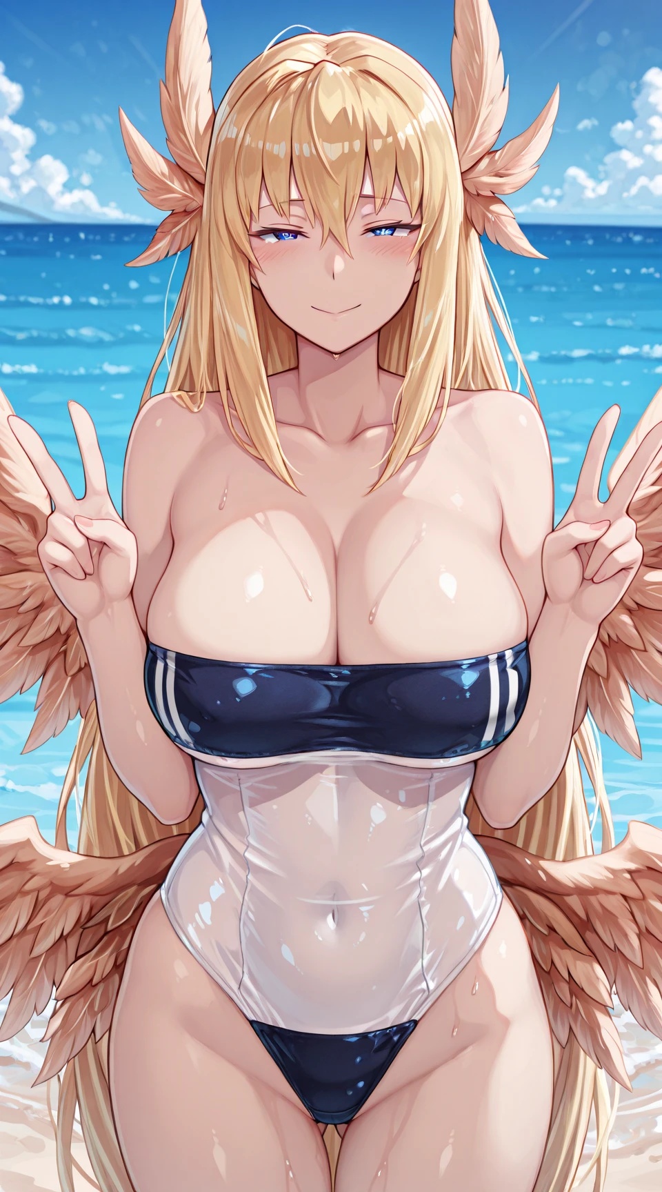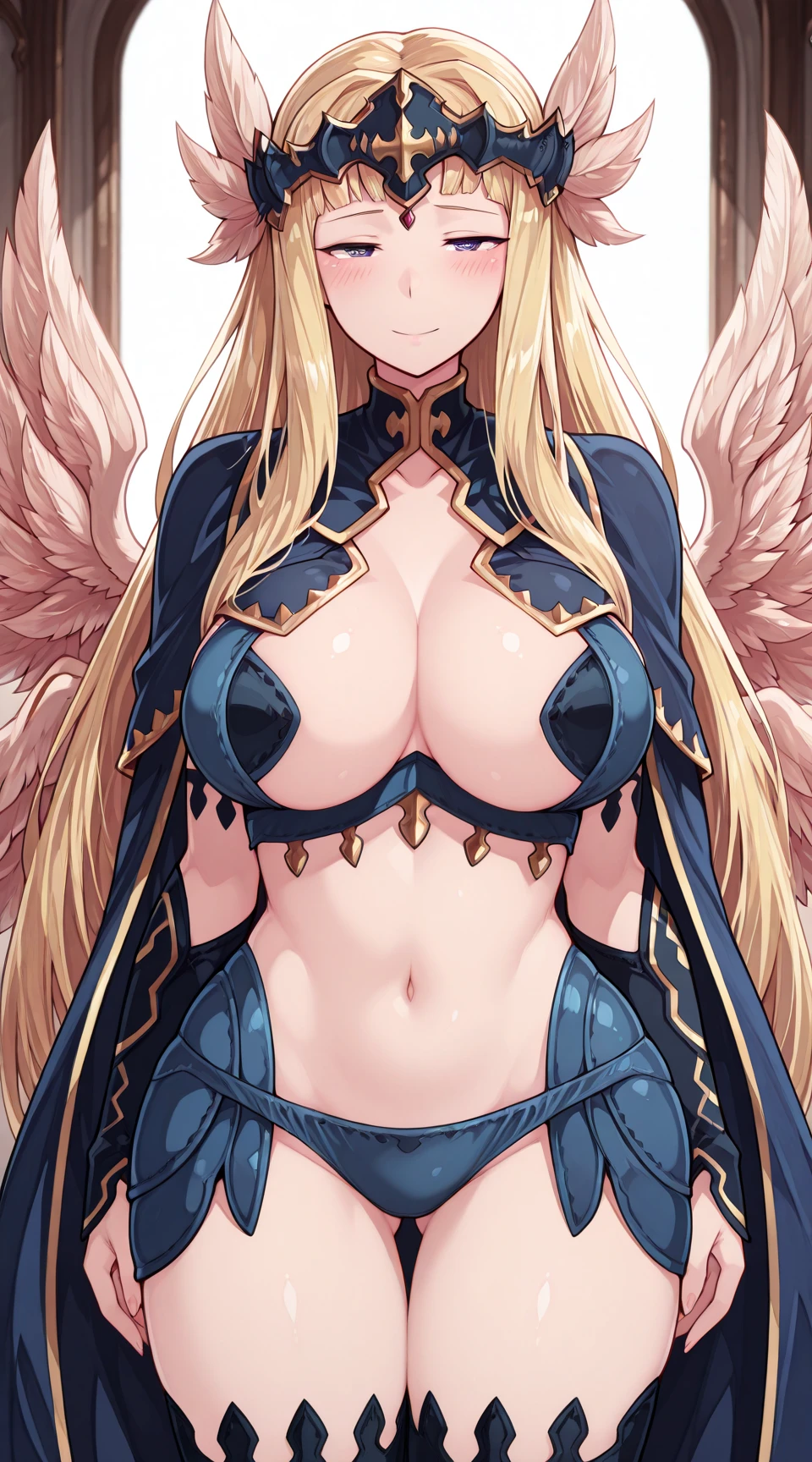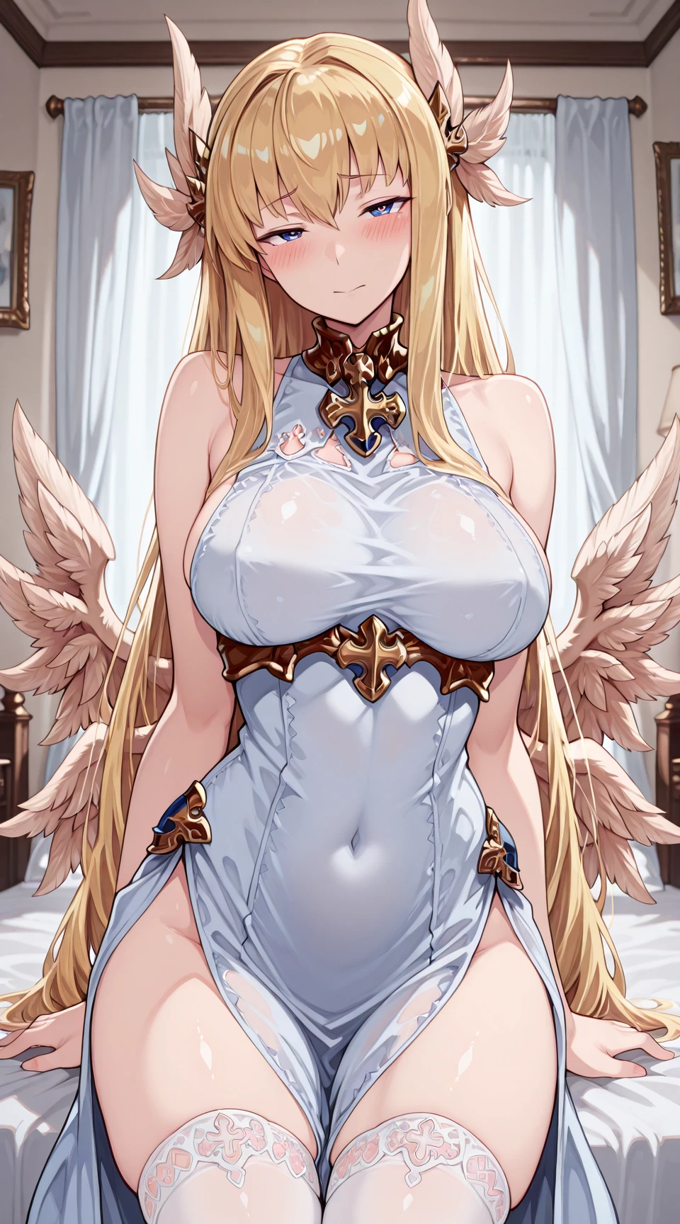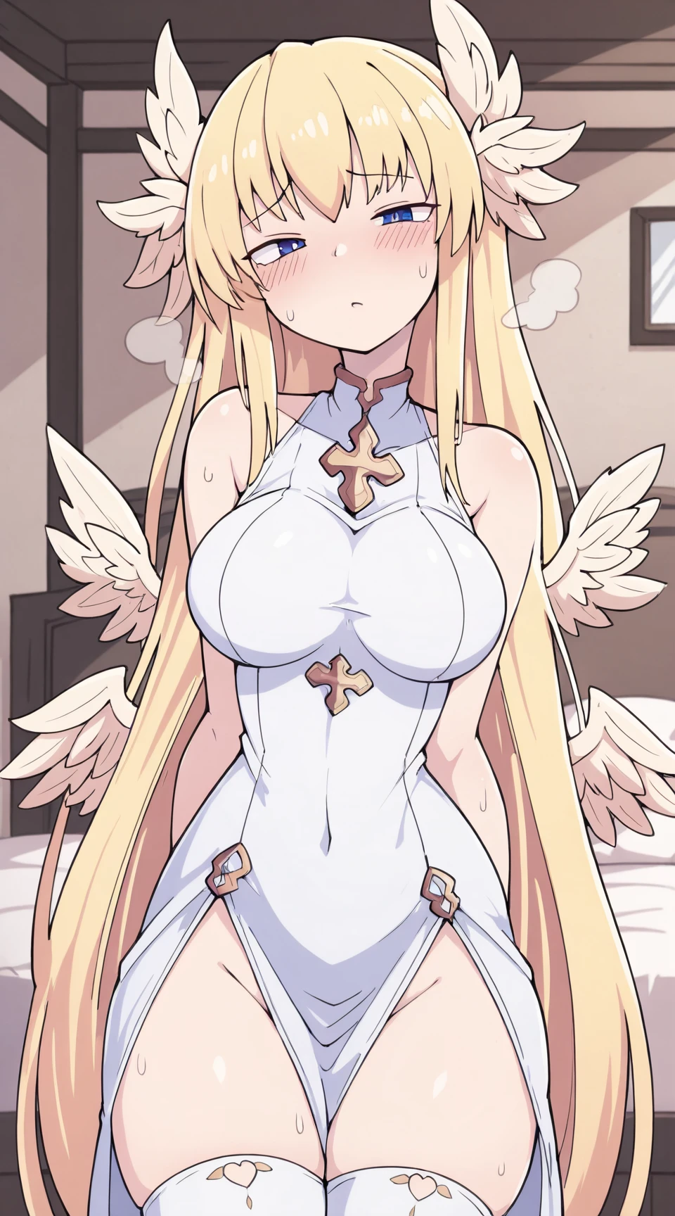 Basic prompt: valkyrie_(monster_girl_encyclopedia), battle_armor, angel_wings, helmet, four_wings, head_wings, breastplate, pauldrons, white_sleeveless_dress, white_detached_sleeves, white_thighhighs, armoured_boots, white_battle_skirt, faulds, gauntlet