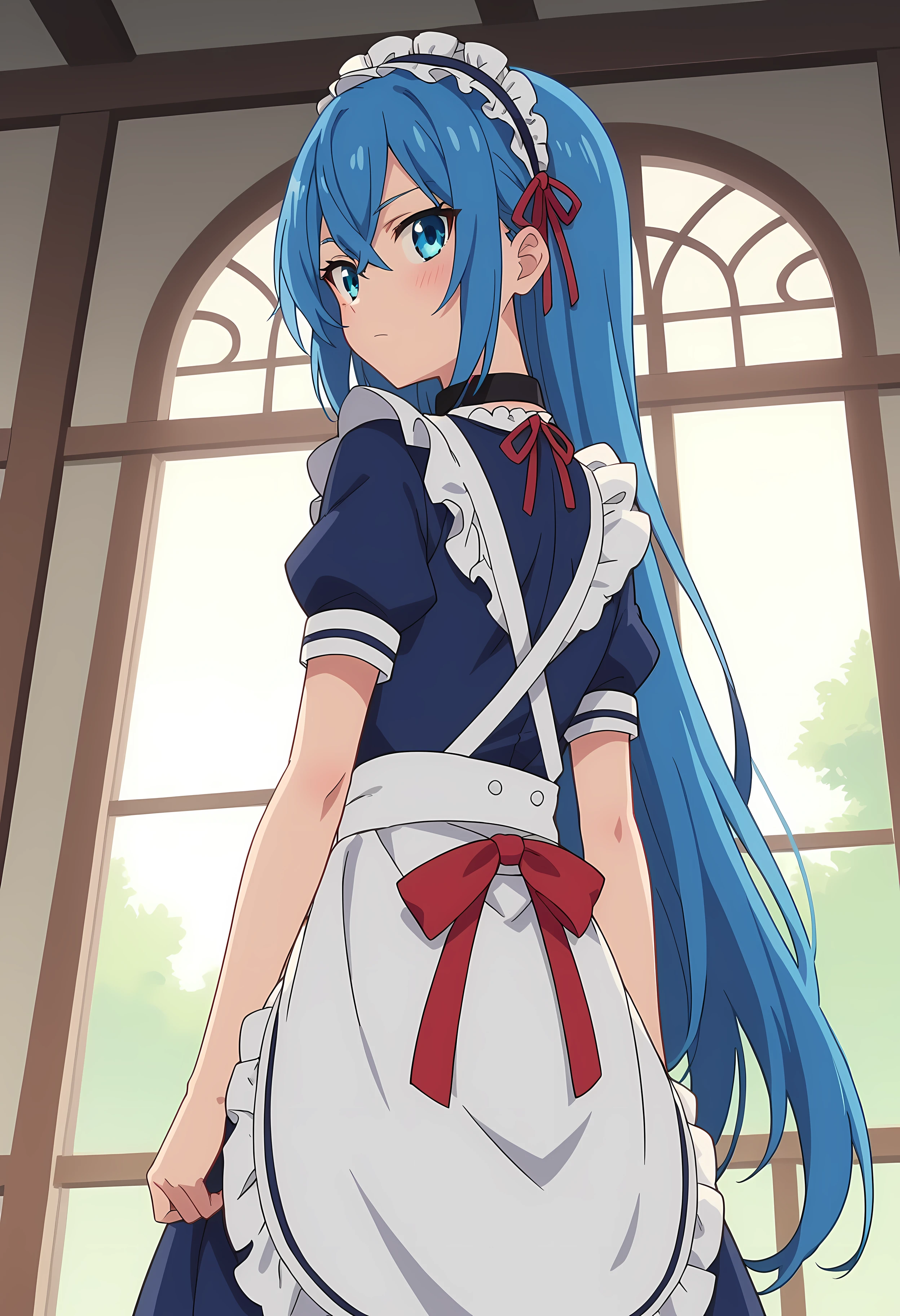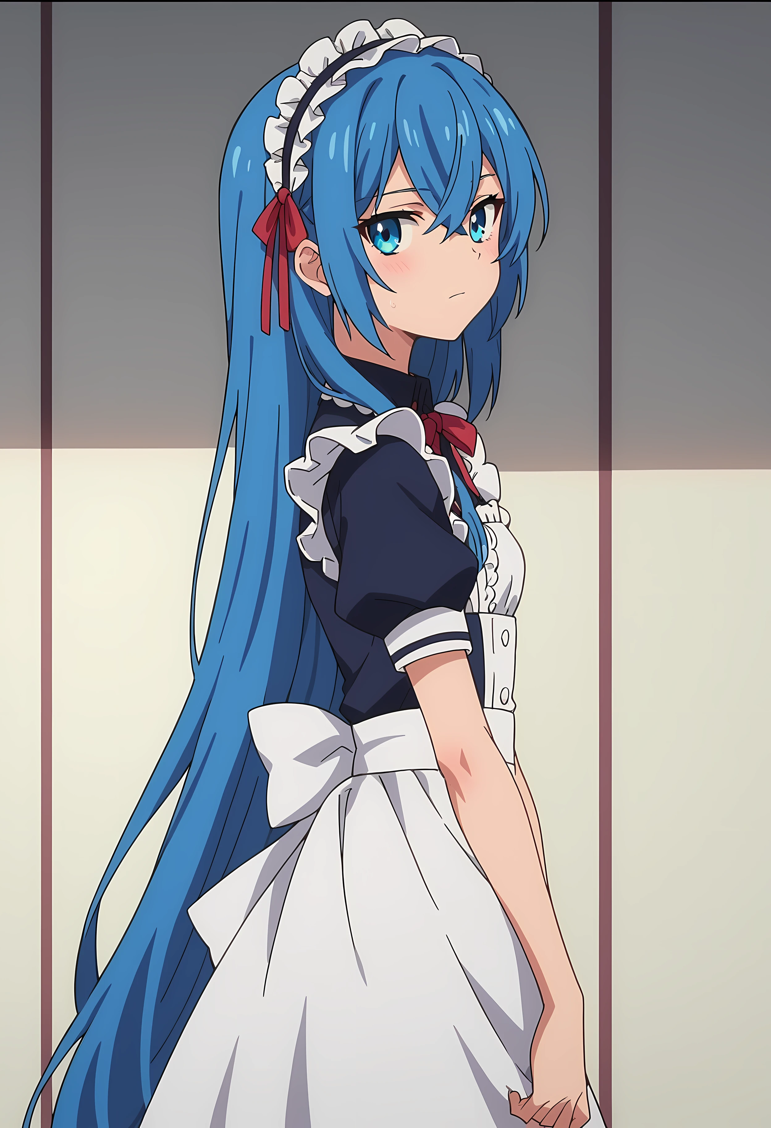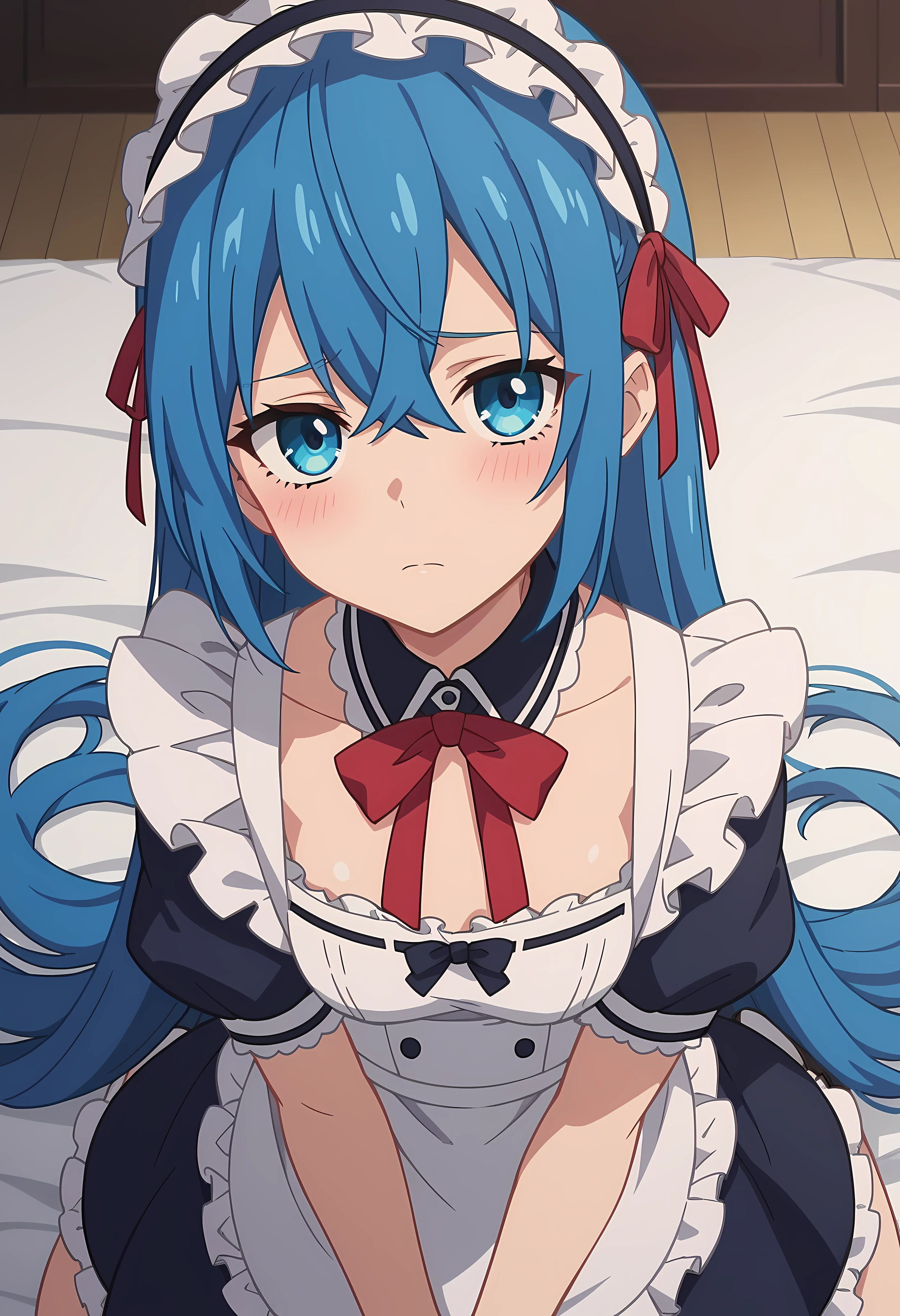 maid hairband, red ribbon, black collar, white maid outfit, blue outfit, white armband, short sleeve,