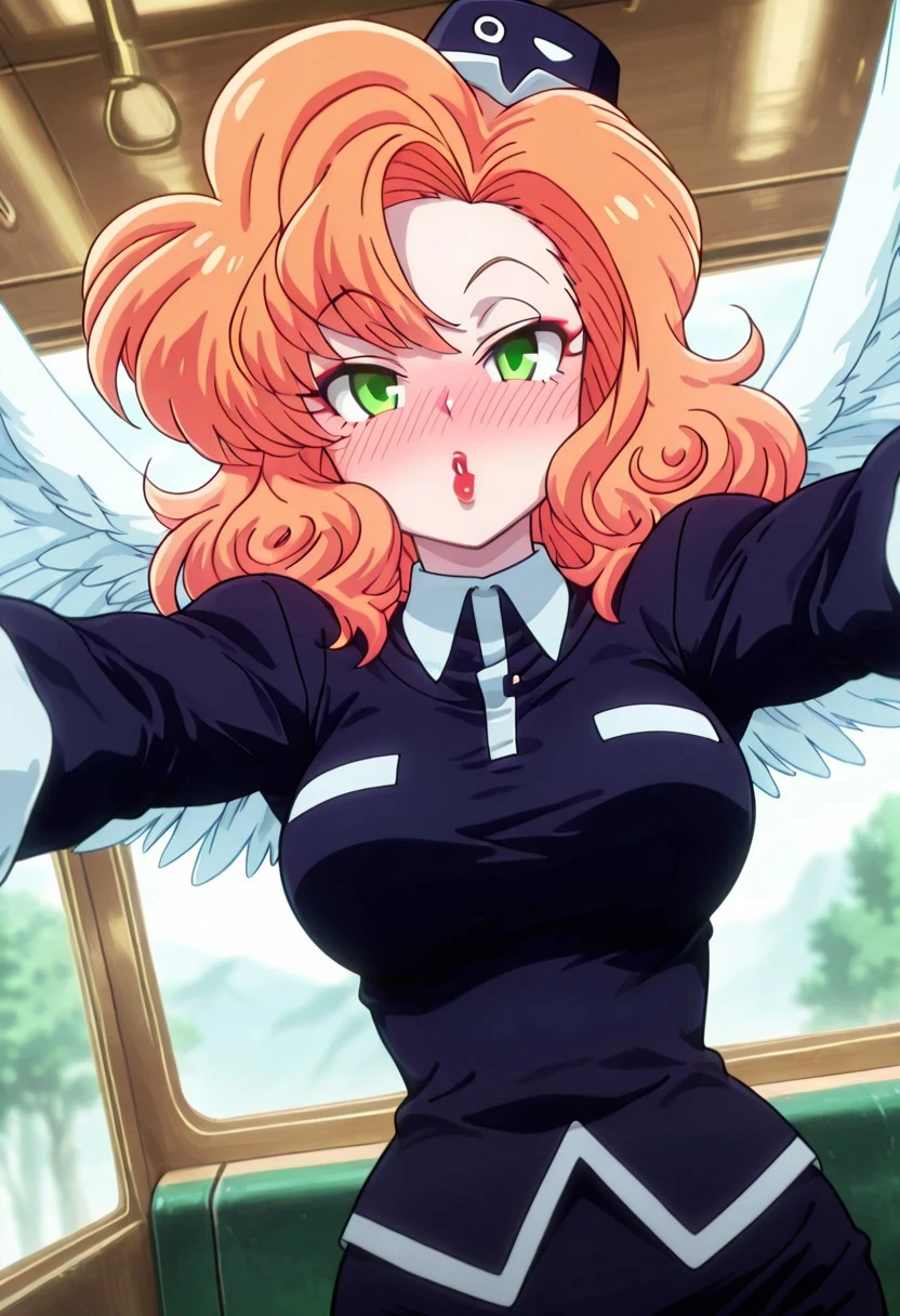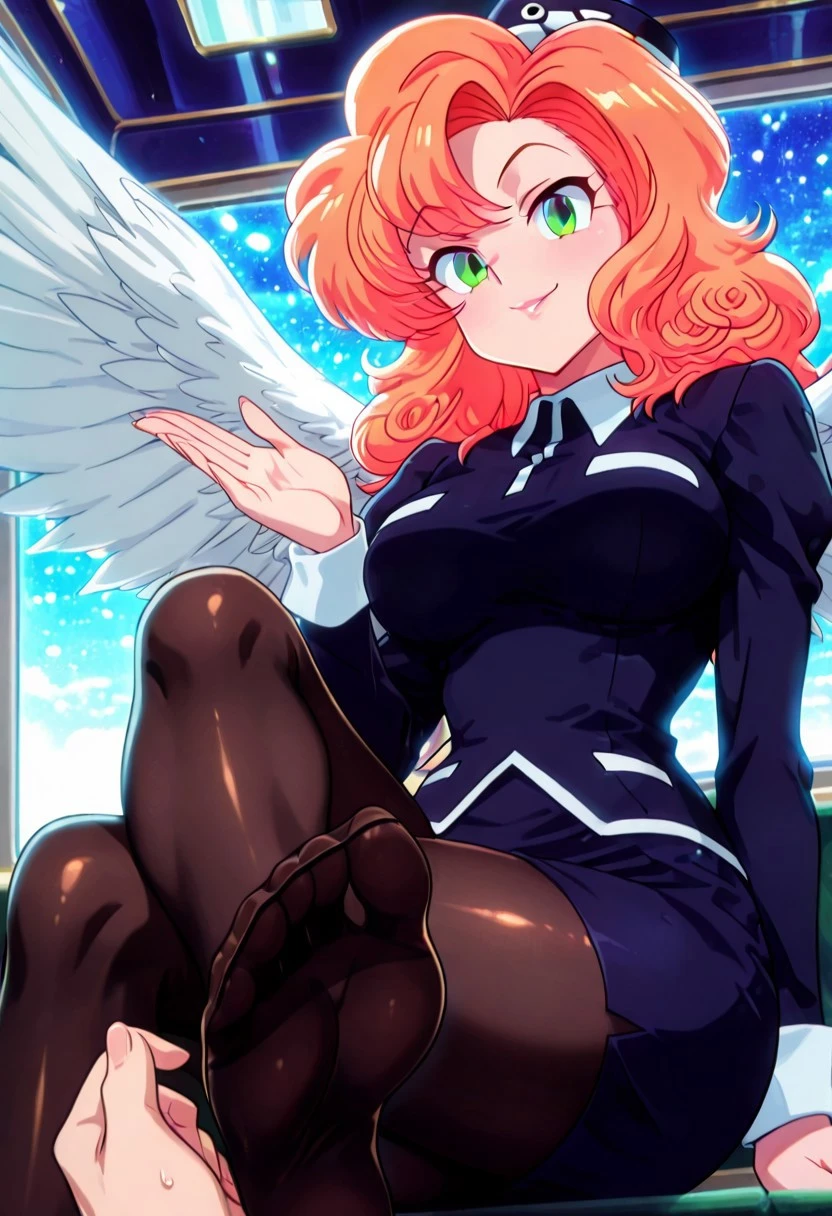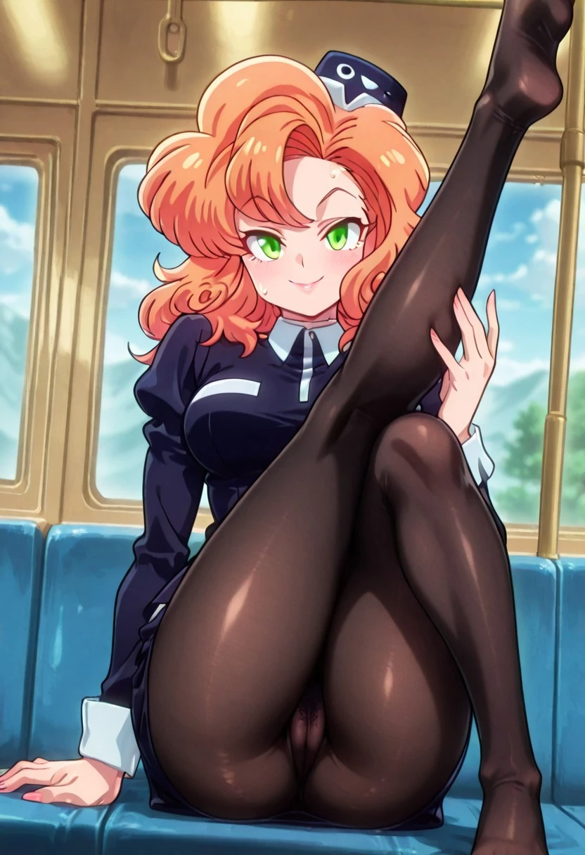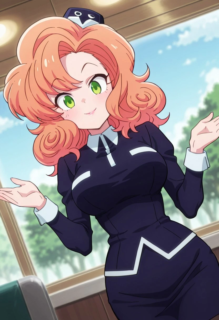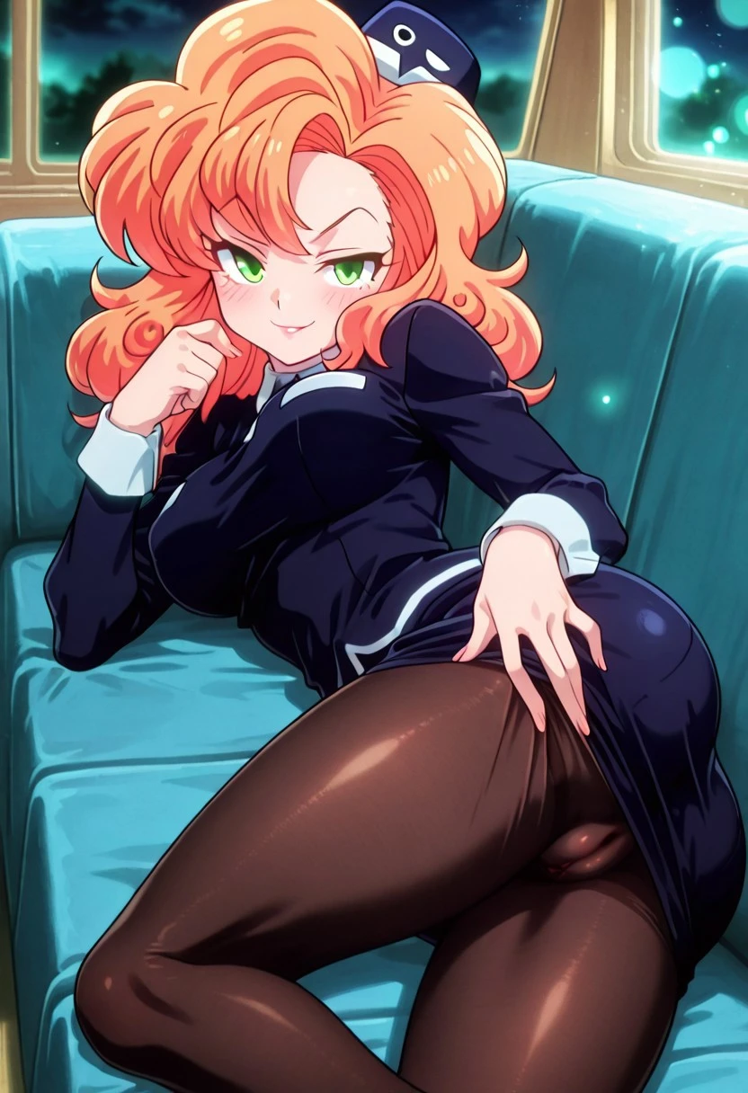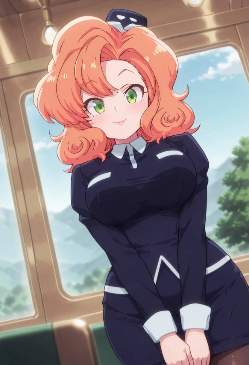 CocoLooHxH, 1girl, solo, voluptuous figure, orange hair, curly messy hair, blue hat, green eyes, lips, white wing collar, blue bus tour guide uniform, blue shirt, large breast, long sleeves, white cuffs, blue pencil skirt, large butt, thick thighs, brown pantyhose, blue shoes,