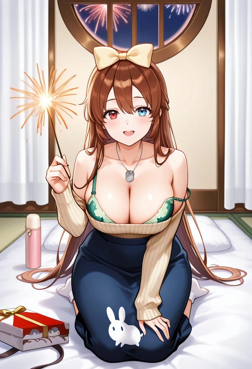 valkyriemidsummer\(last origin\), long sleeve sweater, breasts, blue skirt, heterochromia, brown hair, long skirt, smile, bow, brown footwear, purple eyes, hair bow, bow on top of the head,