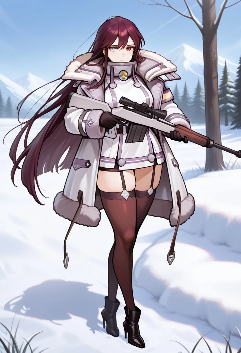valkyriebase\(last origin\), gun, weapon, thighhighs, rifle, holding_rifle, high heels, sniper rifle, holding weapon, full body, fur trim, coat, holding, heterochromia,