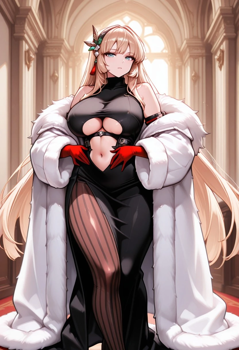 leonaboss (last_origin), fur_coat, legs_apart, jewelry, long_dress, dress, flower, gloves, underboob, standing, blonde_hair, long_hair, tachi-e, turtleneck_dress, side_slit, striped_pantyhose, elbow_gloves, high_heels, red_gloves, very_long_hair, clothing_cutout, underboob_cutout, black_dress, navel, bare_shoulders, black_footwear, pantyhose, stomach_cutout, coat, large_breasts, taut_dress, taut_clothes, vertical-striped_pantyhose,