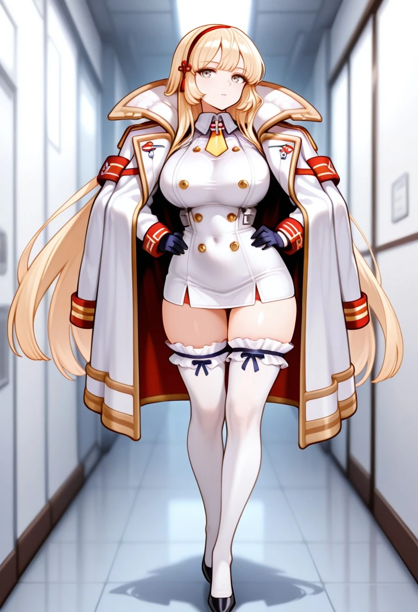 leonabase\(last_origin\), grey eyes, blonde hair, gloves, jacket, full body, white thighhighs, white dress, jacket on shoulders, double-breasted dress, headband, yellow tie, thigh-high socks with ruffles, very long hair, tight_dress, short_dress, frilled_thighhighs,