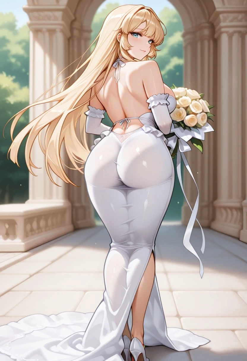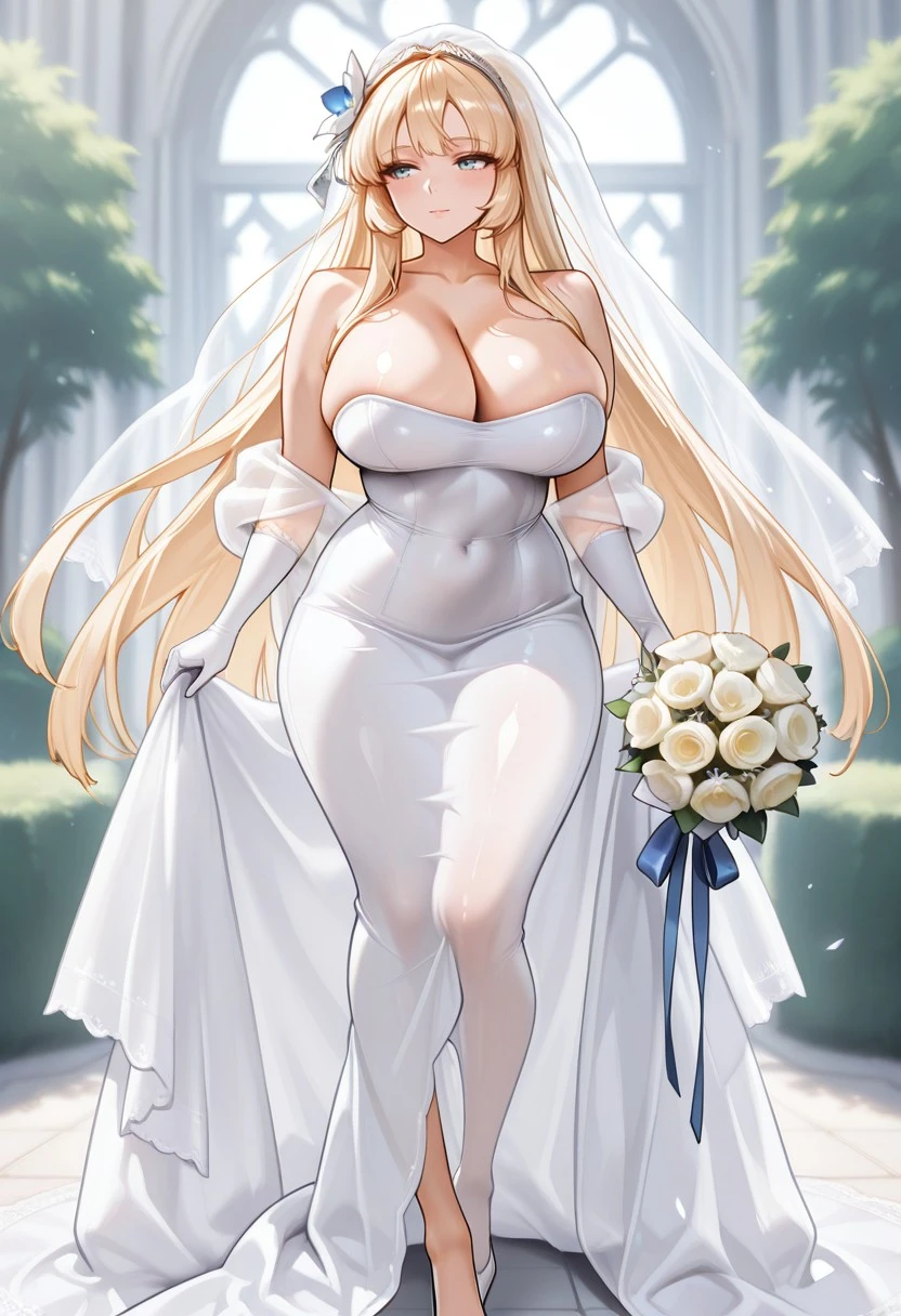 leonabride\(last_origin\), breasts, dress, bouquet, blonde hair, long hair, flower, cleavage, wedding dress, gloves, veil, white footwear, white dress, holding, tight_dress,