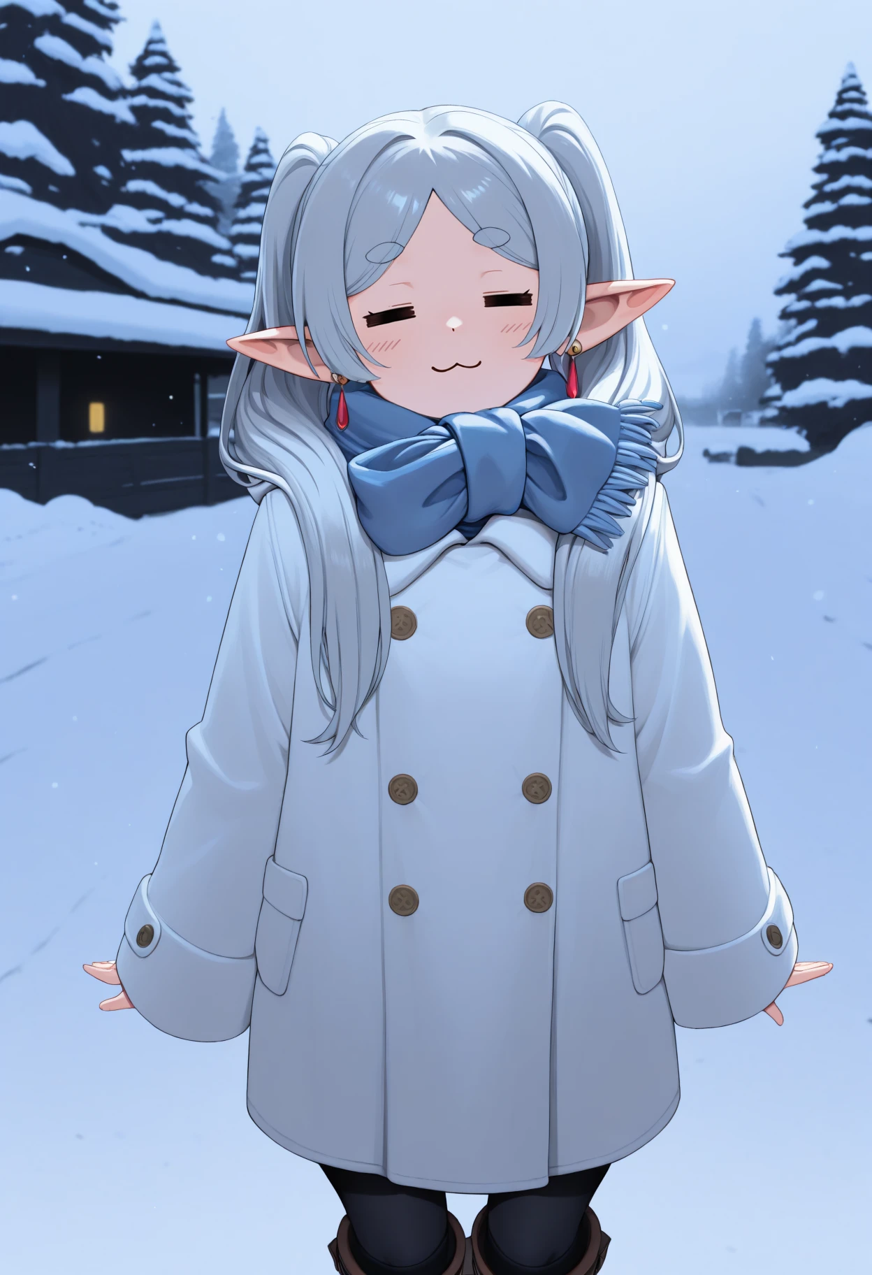 Fri3r3nWntr, green eyes, grey hair, long hair, twintails, thick eyebrows, earrings, pointy ears, blue scarf, white coat, buttons, black pantyhose, brown bootsSleepwear outfit: