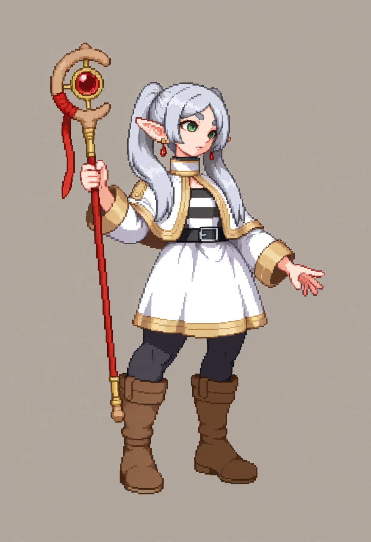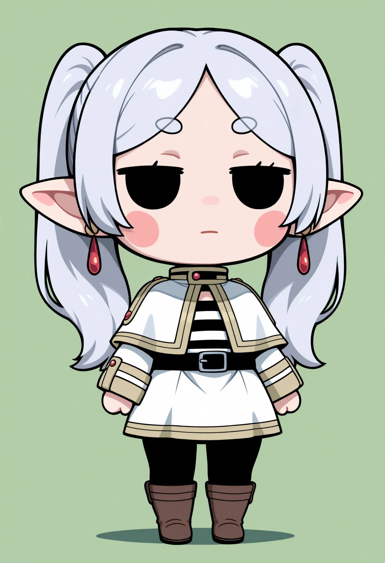 Fri3r3nDef, green eyes, grey hair, long hair, twintails, thick eyebrows, earrings, pointy ears, white capelet, striped shirt, long sleeves, black belt, white skirt, black pantyhose, brown boots