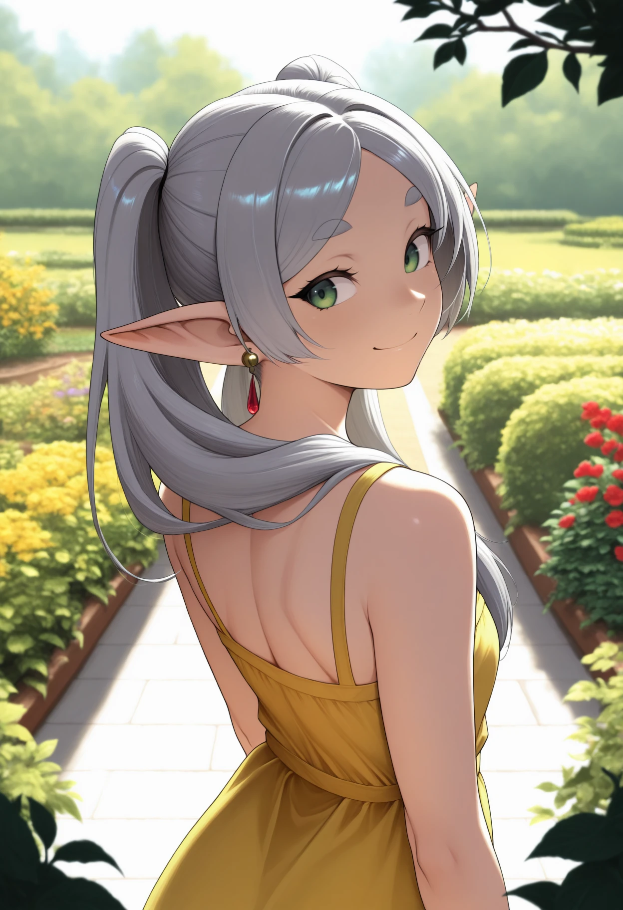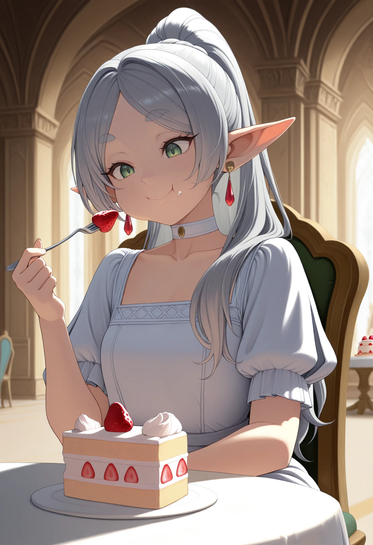 Fri3r3nDrss, green eyes, grey hair, long hair, high ponytail, thick eyebrows, pointy ears, earrings, white choker, white dress, short sleevesLet me know if you have any issues.