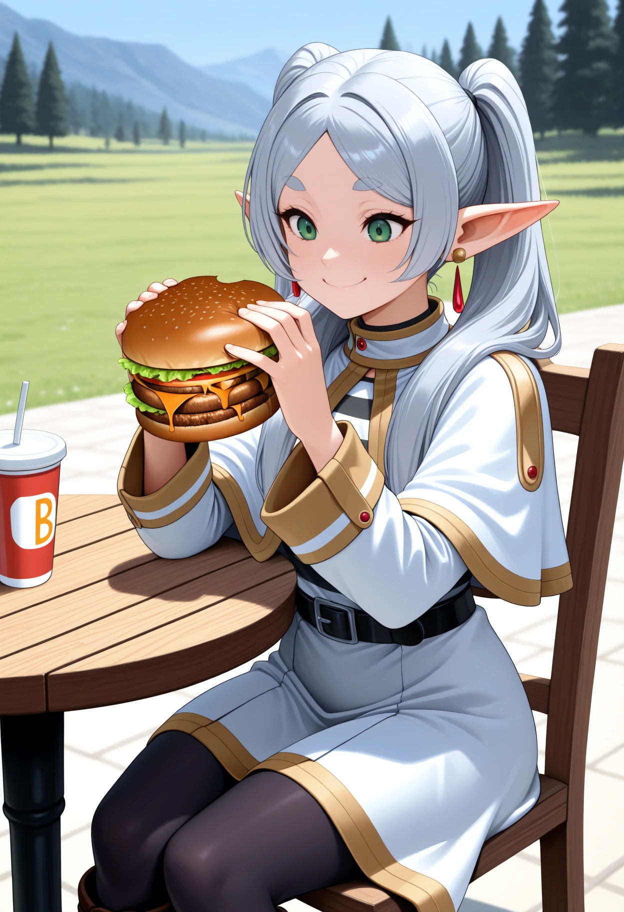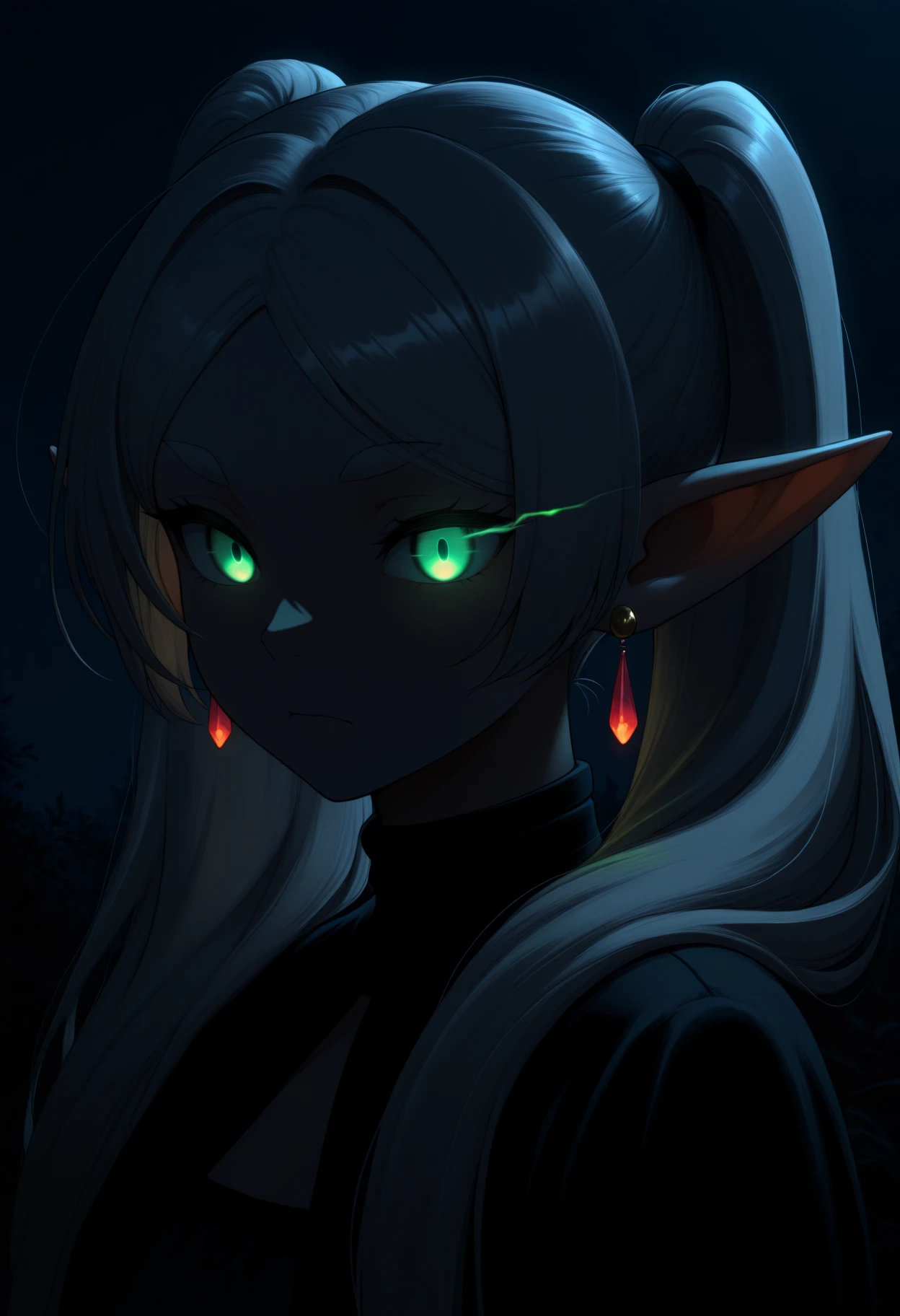 Fri3r3n, green eyes, grey hair, long hair, twintails, thick eyebrows, pointy ears, earringsDefault outfit: