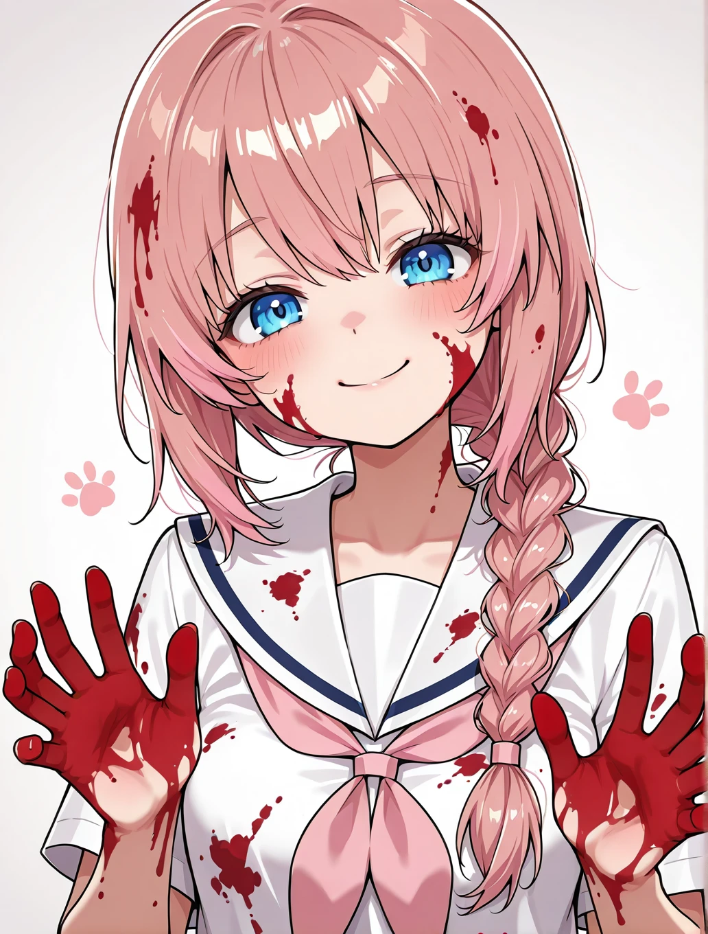 blue eyes,single braid,pink hair,white sailor collar,neckerchief,short sleeves,blood on face,blood on clothes,blood on hands,blood in hair,kawaii,adorable_girl,