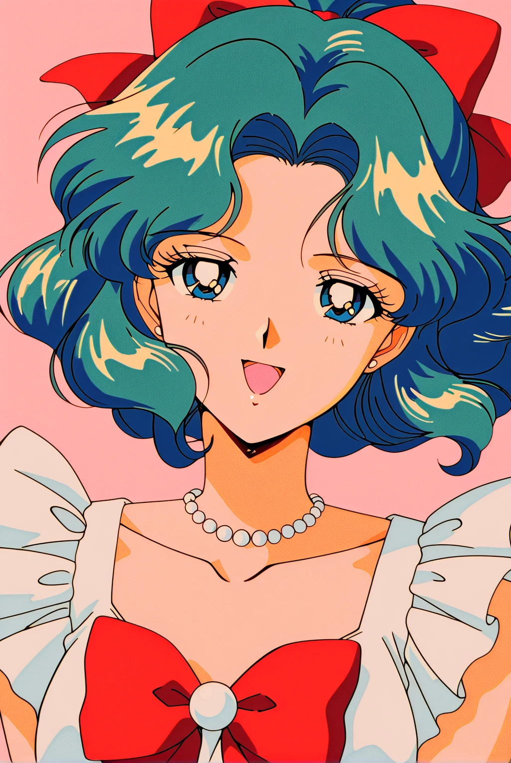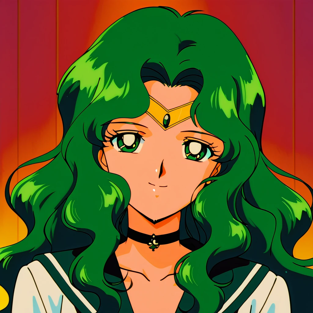 1girl, Michiru, long wavy hair, green hair, blue eyes, happy expression, tiara, choker, sailor uniform, white shirt, green shoulder, white gloves, green skirt, blue bowtie on chest,