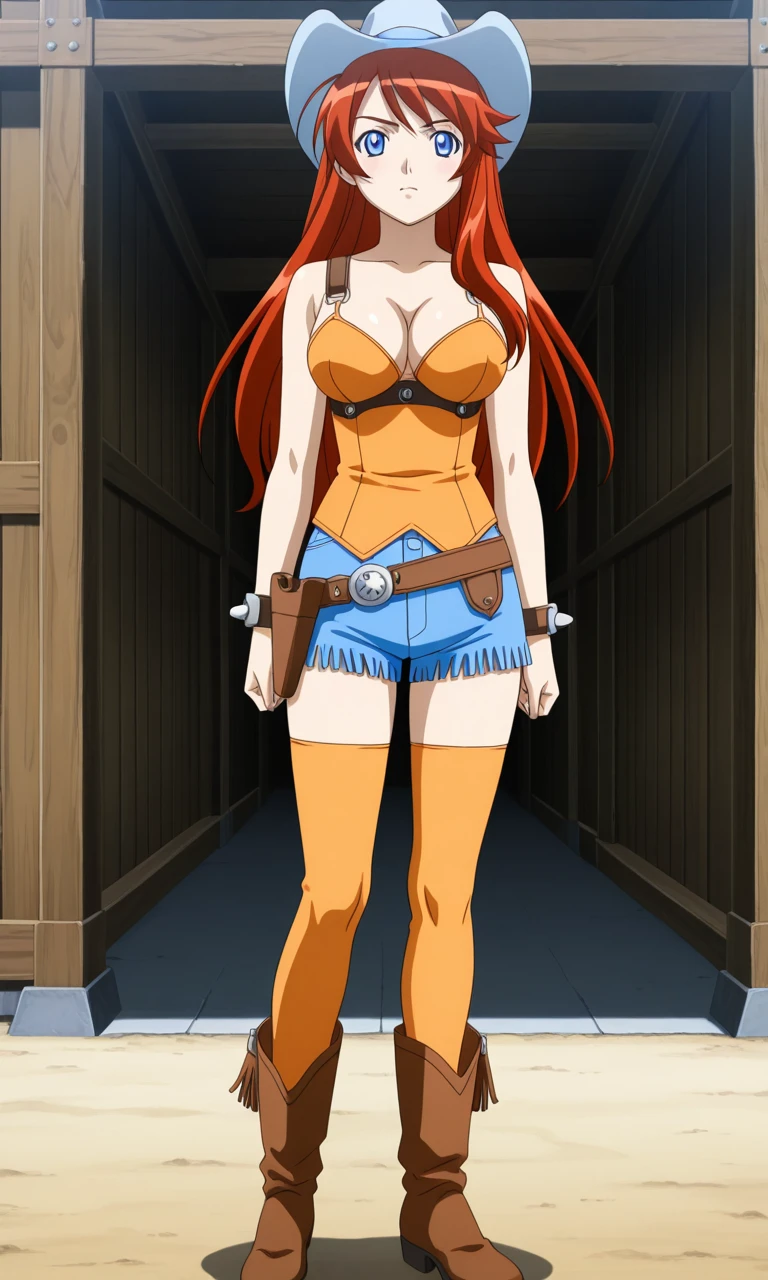 1girl, cowboy western, solo, fringe trim, breasts, red hair, blue eyes, boots, thighhighs, long hair, cleavage, large breasts, shorts, anime coloring, anime screencap, cleavage,covered nipples