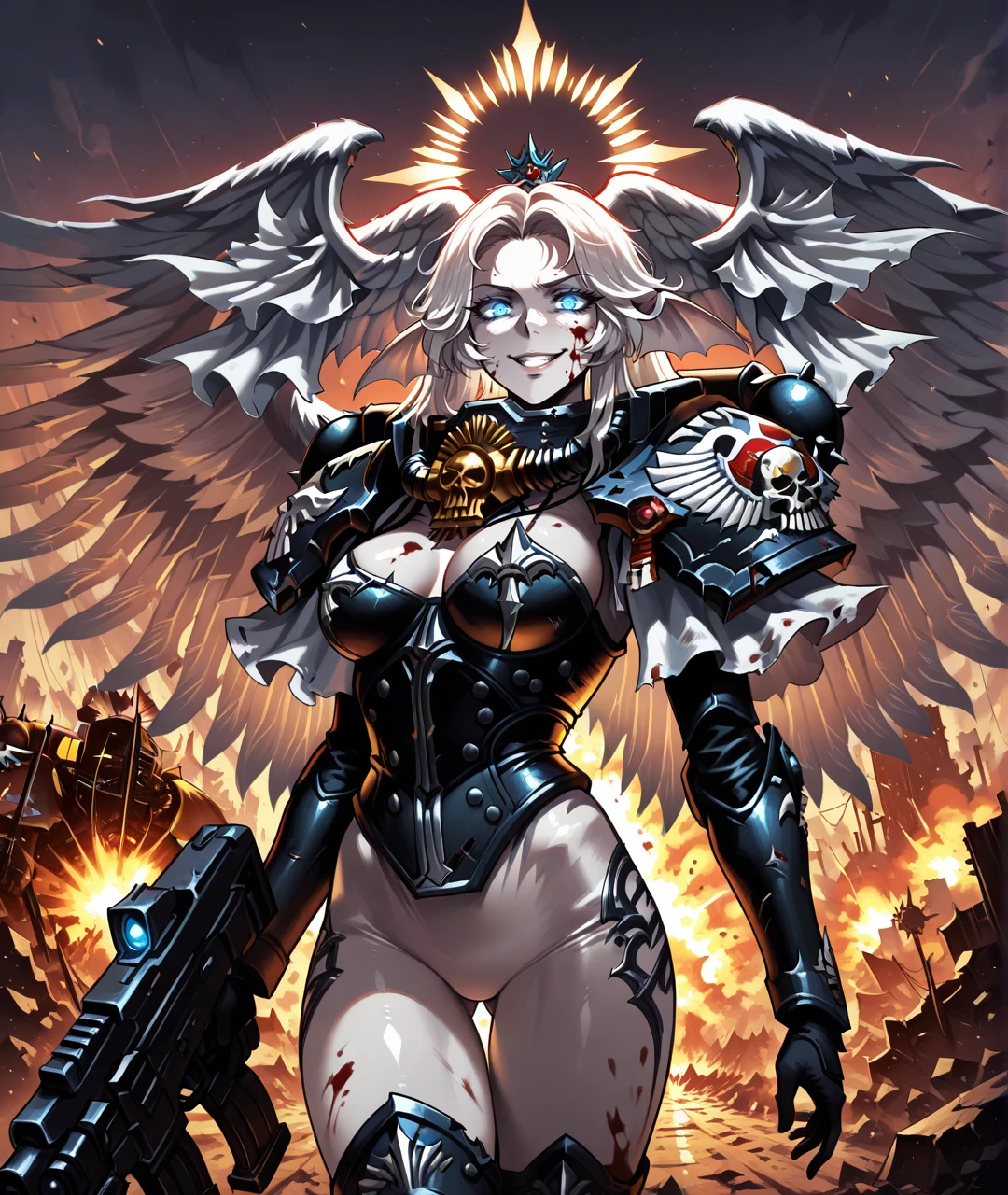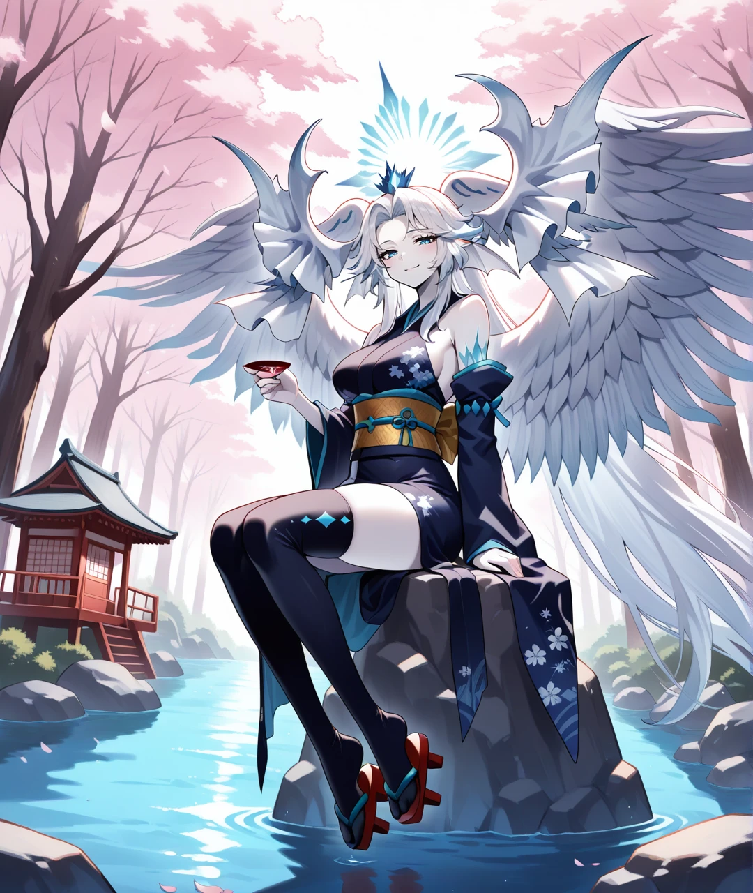 Tags: HydaelynBase, pale skin, colored skin, white skin, white wings, multiple wings, feathered wings, head wings, halo, glowing, blue eyes, white hair, long hair, crown, crystal, head fins, white shawl, bare shoulders, collarbone, medium breasts, cleavage, revealing clothes, navel, blue body markings, bare legs, armored boots, blue high heels,