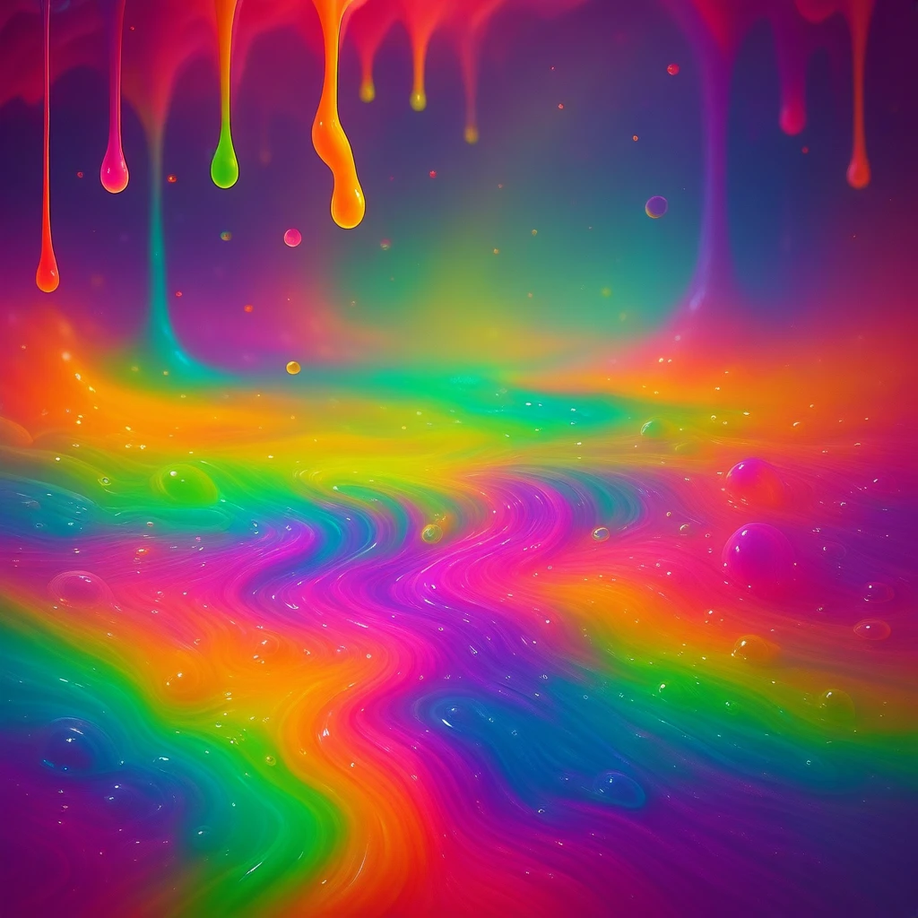 rainbow slime, multicolor liquid, iridescent colors, hyper-saturated colors, glossy surface, liquid blobs, dripping fluid, viscous material, surreal 3d style, smooth organic shapes, melting forms, fluid simulation look, vibrant neon colors, candy-like texture, soft reflections, high gloss finish, colorful gradients, abstract liquid art, dreamlike atmosphere, playful surrealism, fantasy material, liquid sculpture, volumetric lighting, macro detail look, cinematic lighting, soft depth of field, ultra smooth shading, digital art render, stylized realism, high detail 3d