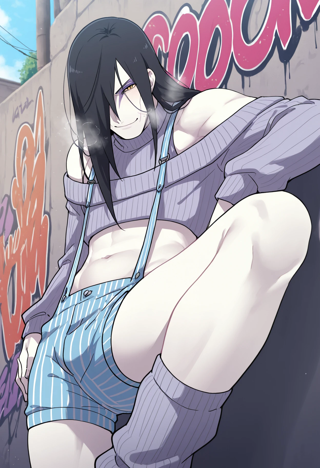 Trigger words are: oroshimaru,Orochi,black hair,long hair,yellow eyes,slit pupils,hair,light purple eye shadow,eye makeup,pale skin,mature,