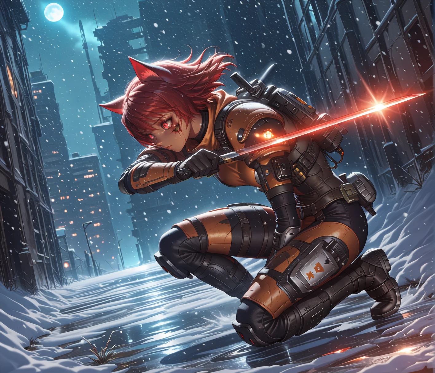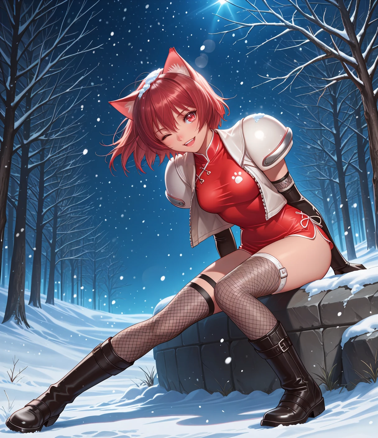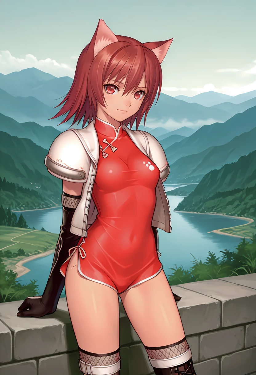 maalt, red eyes, red hair, short hair, animal ears, medium breasts, paw print, red china dress, short dress, side slit, shoulder pads, shoulder armor, white jacket, , cropped jacket, white thigh strap, fishnets, fishnet thighhighs, black knee boots,