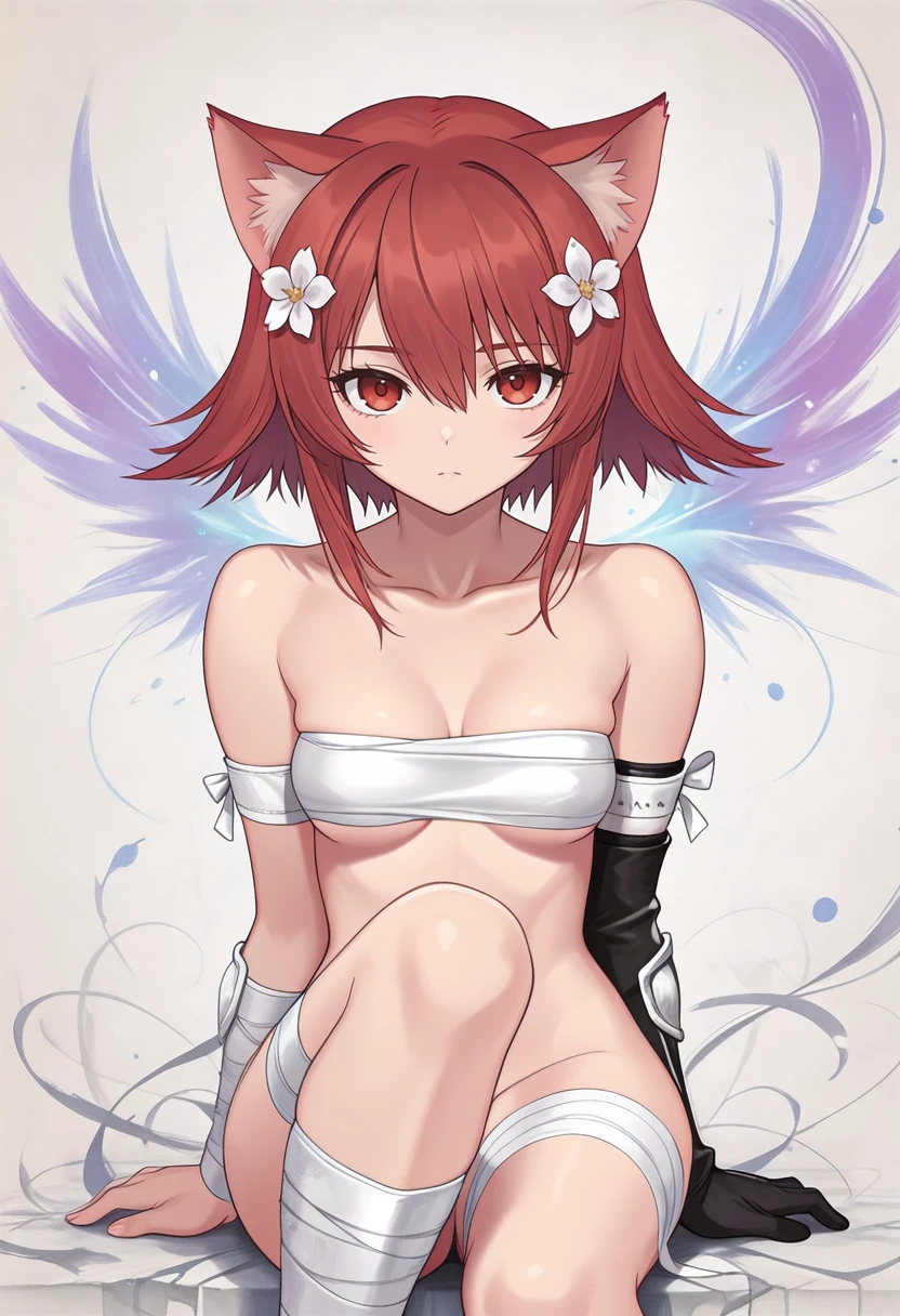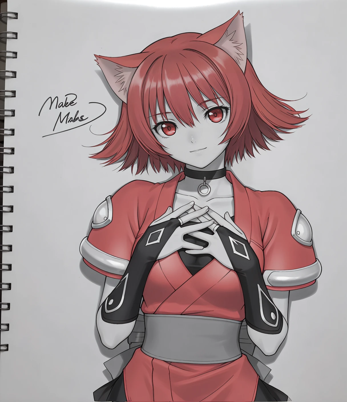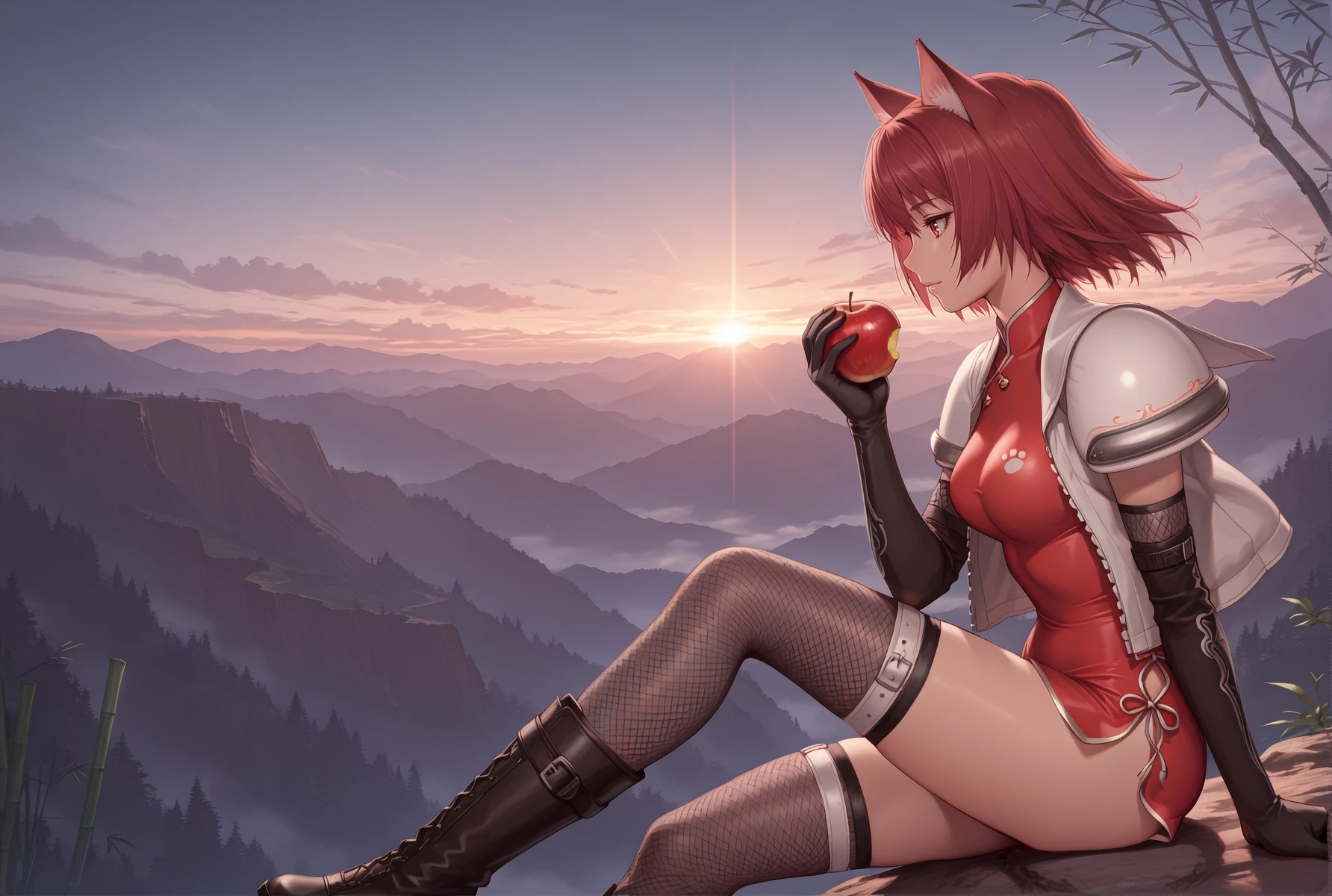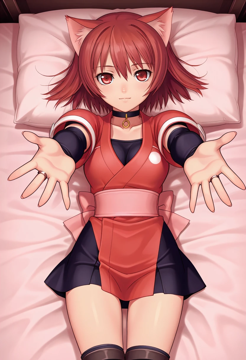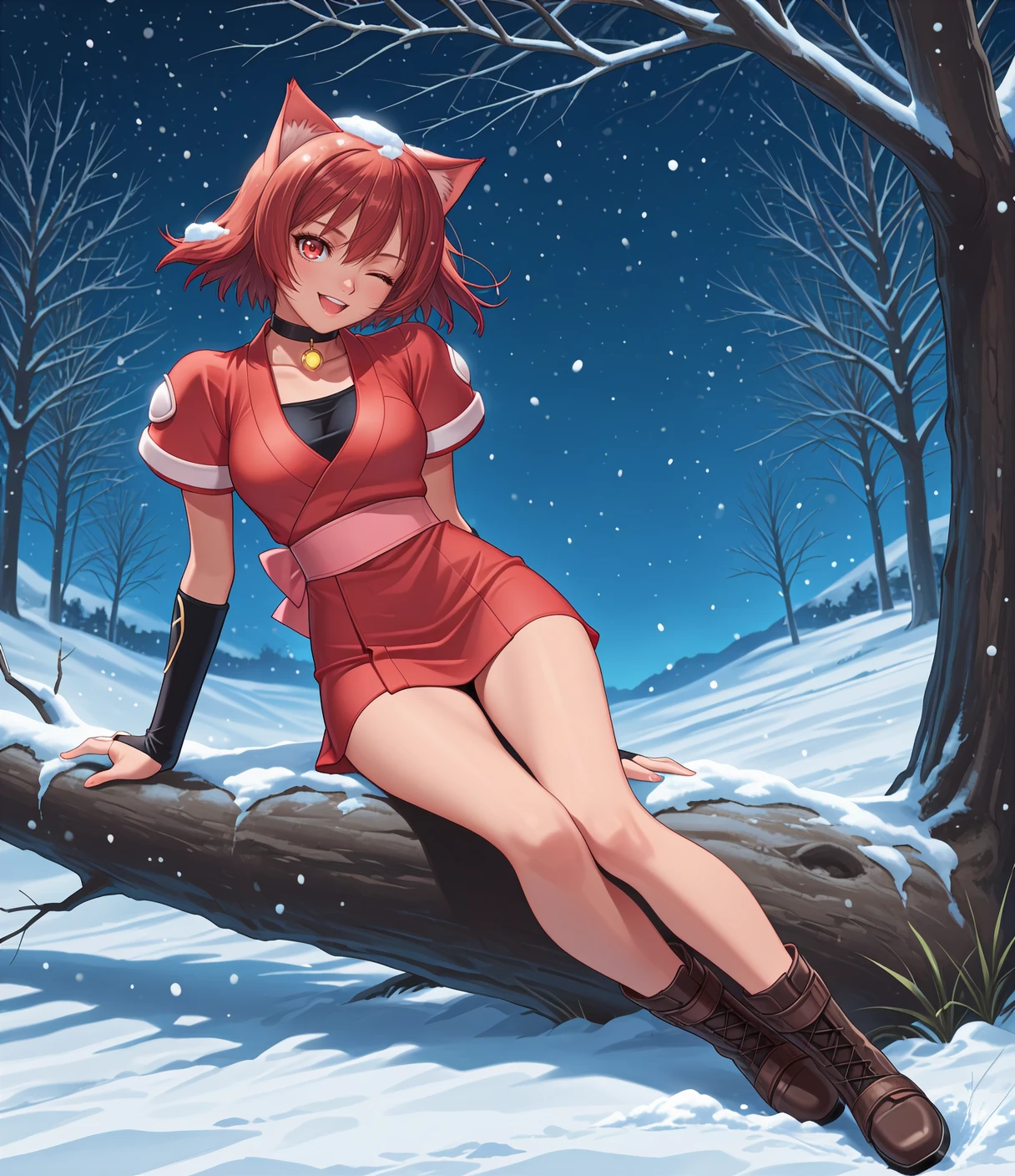 mabase, red eyes, red hair, short hair, animal ears, medium breasts, black collar, pendant, black bridal gauntlets, obi, bow, red short kimono, short sleeves, white trim, black shirt, black miniskirt, brown boots,