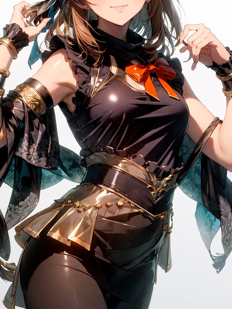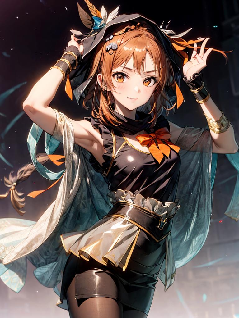 others :black dress,black skirt,brown hair,hagoromo,hair ornament,hood,long hair,orange bowtie,pantyhose,pencil skirt,see-through,sleeveless dress,