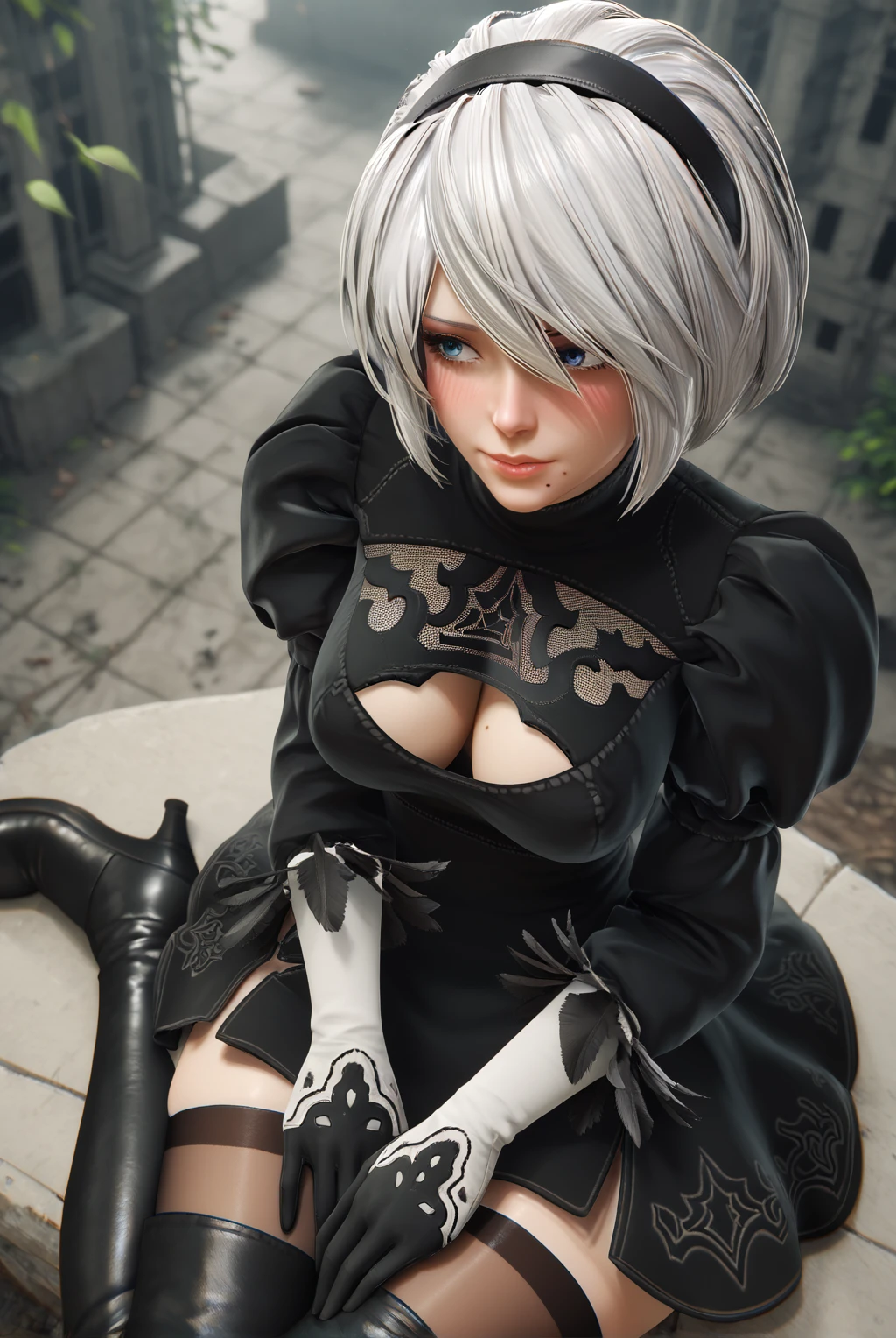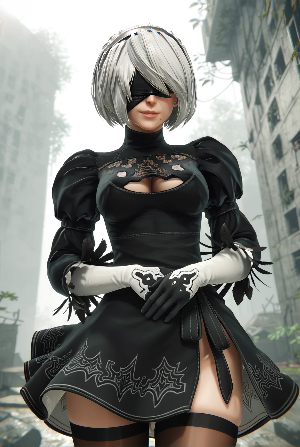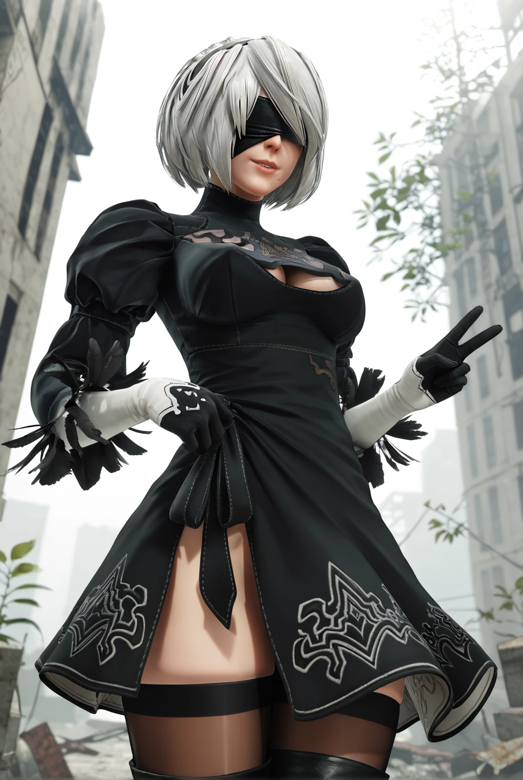 2b (nier:automata), short hair, white hair, black blindfold, hairband, mole under mouth, long sleeves, gloves, turtleneck, black gloves, puffy sleeves, black thighhighs, black footwear, black dress, leotard, high heels, clothing cutout, thigh boots, cleavage cutout, black hairband, juliet sleeves, high heel boots, vambraces, covered eyes, thighhighs under boots, feather trim, feather-trimmed sleeves, lace cleavage cutout, upskirt, fluffy dress, fluffy skirt, side slit