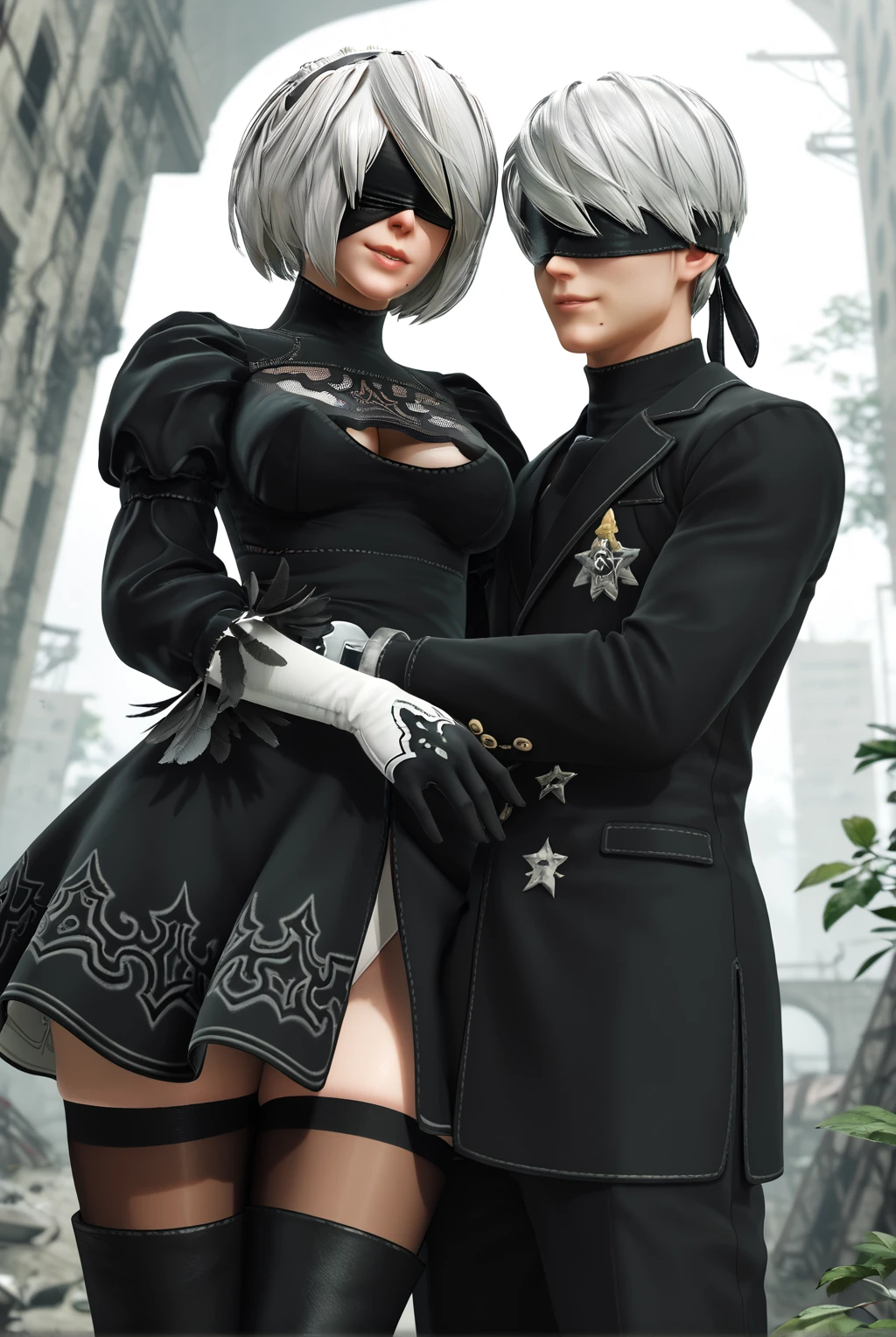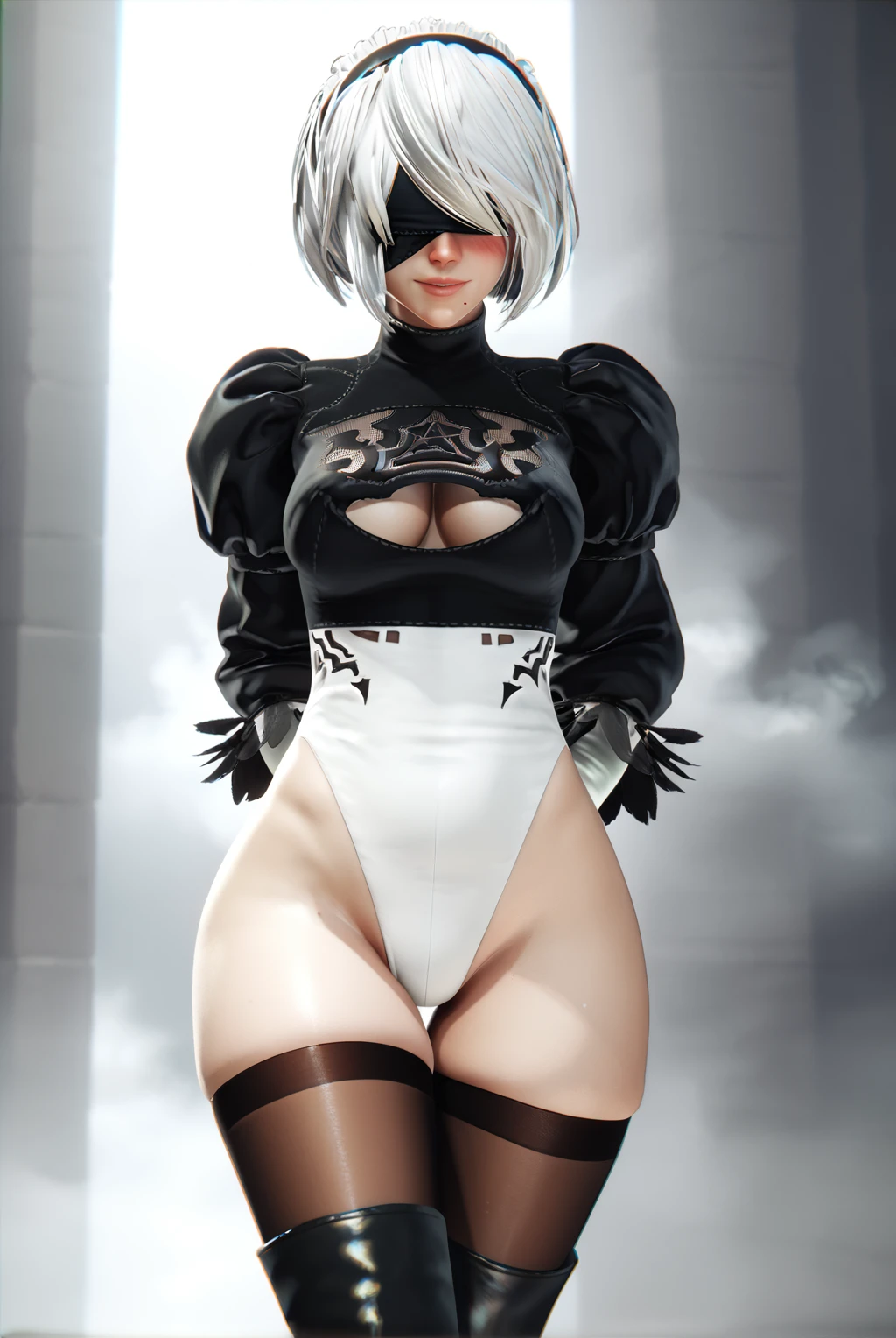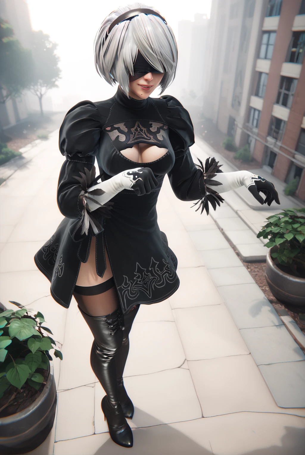 2b (nier:automata), short hair, white hair, black blindfold, hairband, mole under mouth, long sleeves, gloves, turtleneck, black gloves, puffy sleeves, black thighhighs, black footwear, black dress, leotard, high heels, clothing cutout, thigh boots, cleavage cutout, black hairband, juliet sleeves, high heel boots, vambraces, covered eyes, thighhighs under boots, feather trim, feather-trimmed sleeves, lace cleavage cutout, upskirt, fluffy dress, fluffy skirt, side slit