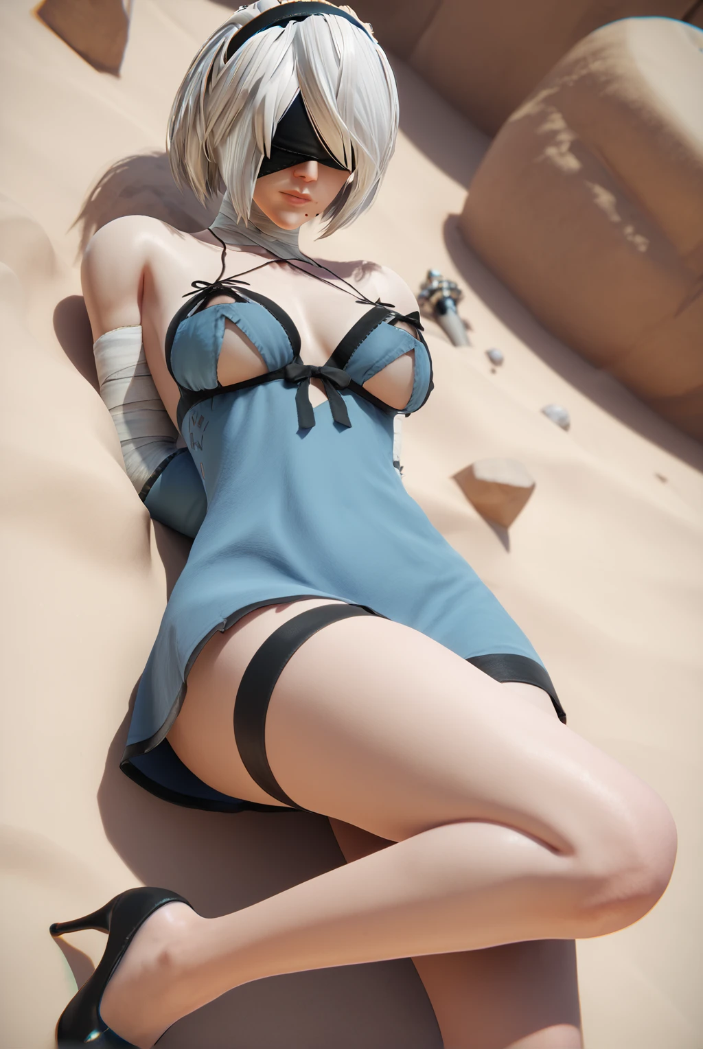 2b (nier:automata), short hair, white hair, black blindfold, hairband, mole under mouth, covered eyes, leavage, bare shoulders, elbow gloves, sword, high heels, legs, thigh strap, blue gloves, negligee, kaine oufit, underboob, bandages, bandaged arm, bandaged leg, bandaged neck, asymmetrical clothes, underboob cutout, clothing cutout, criss-cross halter, blue negligee, backless panties, ass visible through panties, criss-cross panties, laced panties, backless negligee