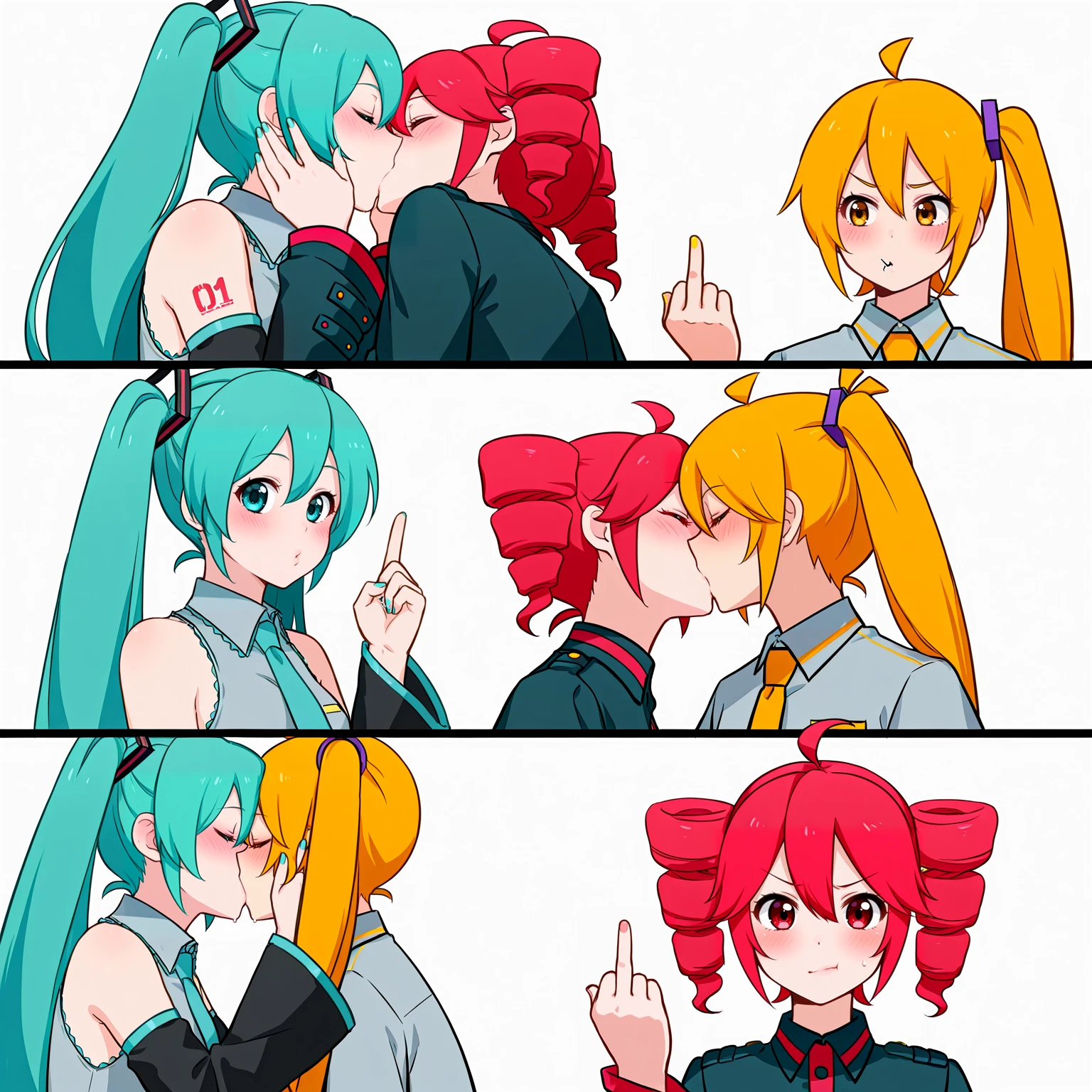 elite_throuple_kiss, 3koma, comic, {character gender}, upper body, (character 2, character 3, kiss), (character 1, looking at looking at viewer, middle finger),<lora:elite_throuple_kiss_meme:0.4>
