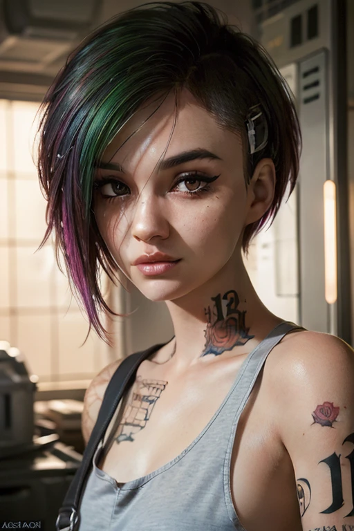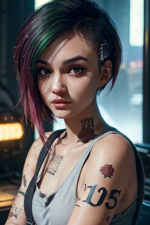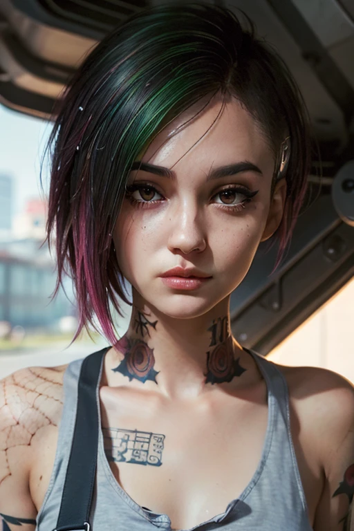 Prompt: A stunning and intricate full color portrait in Ultra-HD, 24 year old girl, short multicolored hair, brown eyes, makeup, detailed face, tattoos, tank top, epic character composition, alessio albi. nina masic, sharp focus, natural lighting, subsurface dispersion, f2, 35mm,