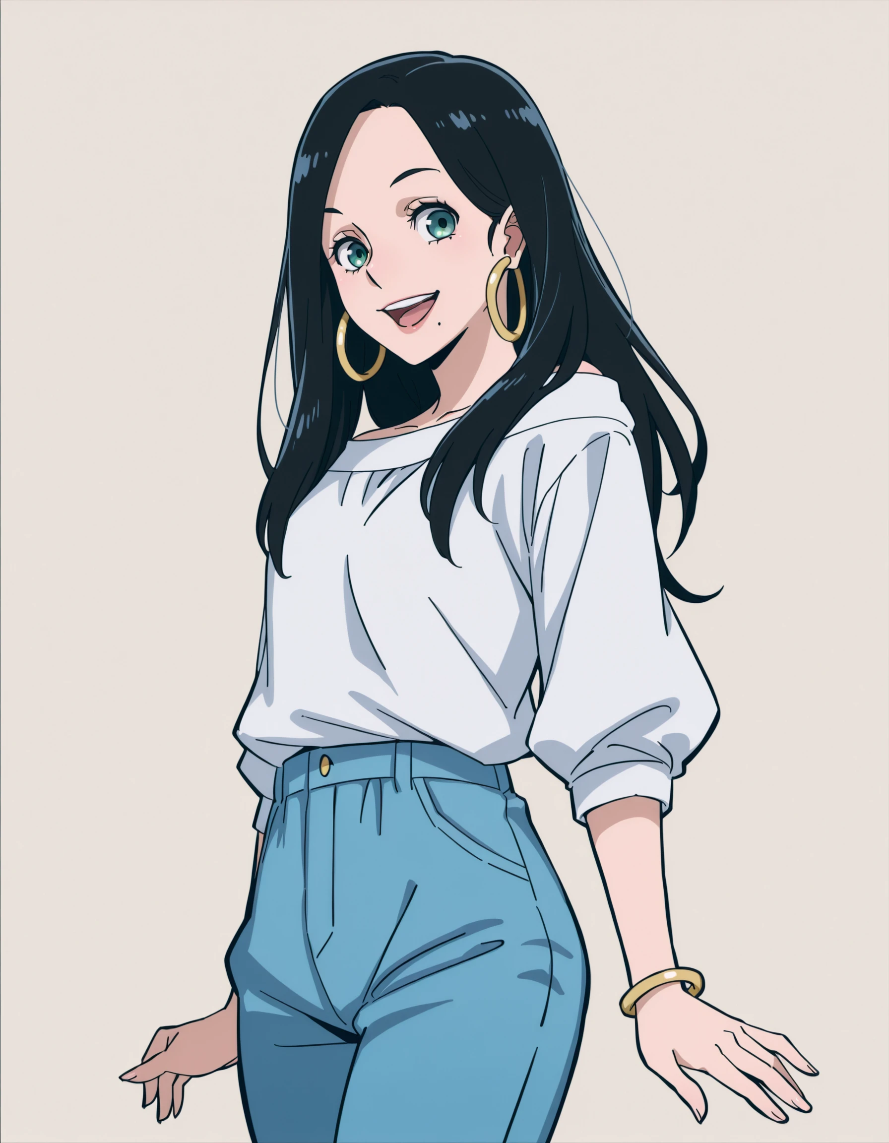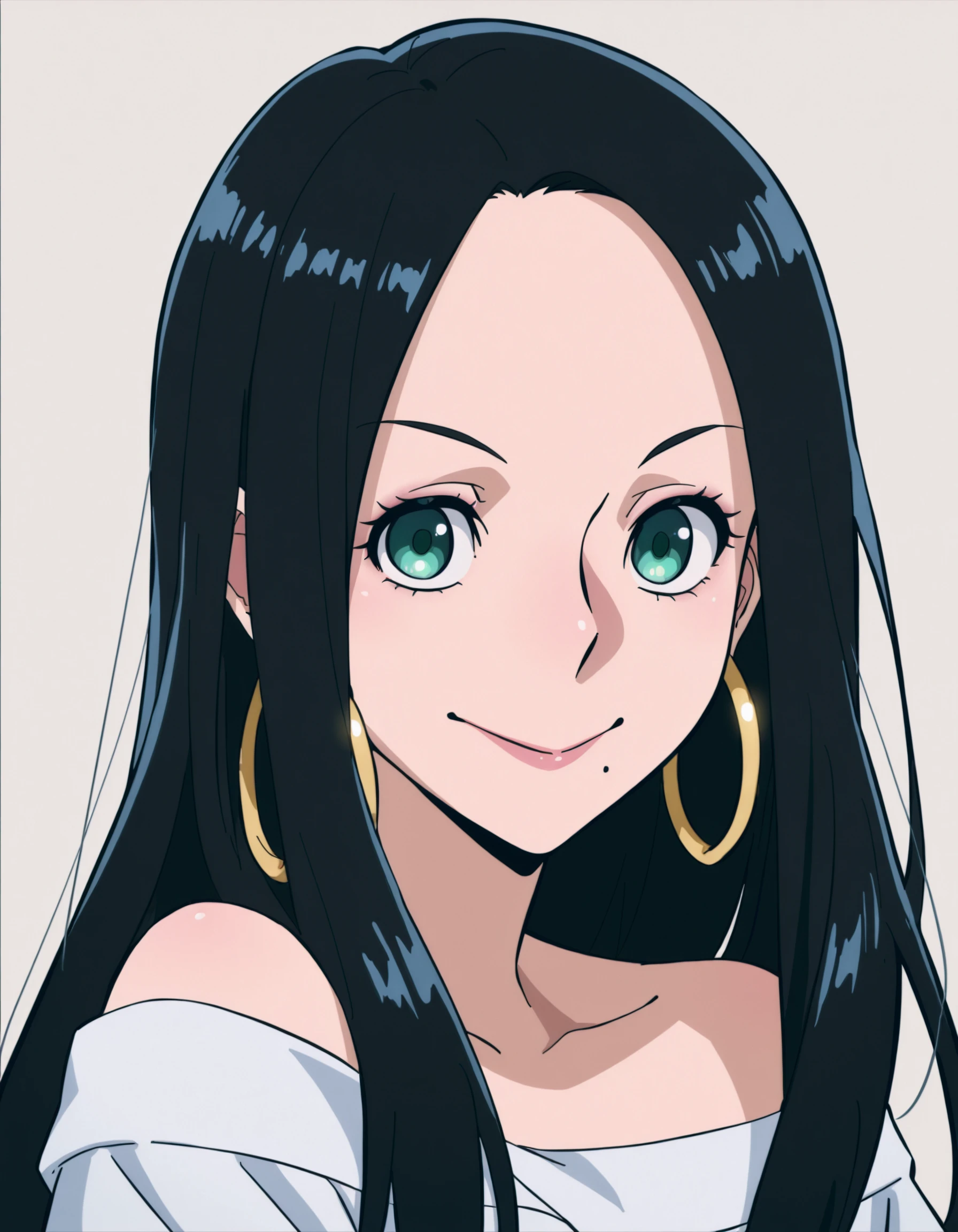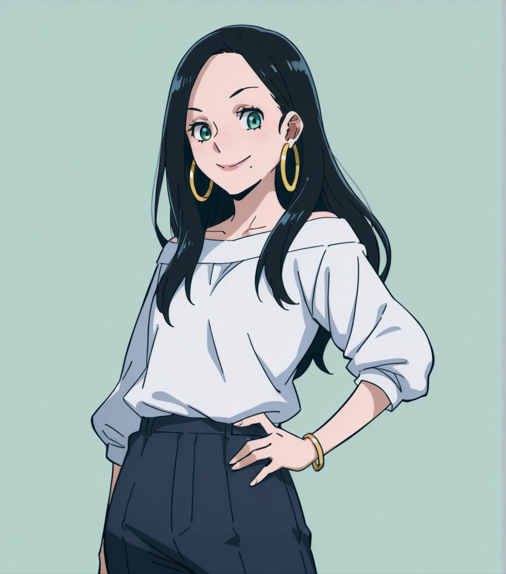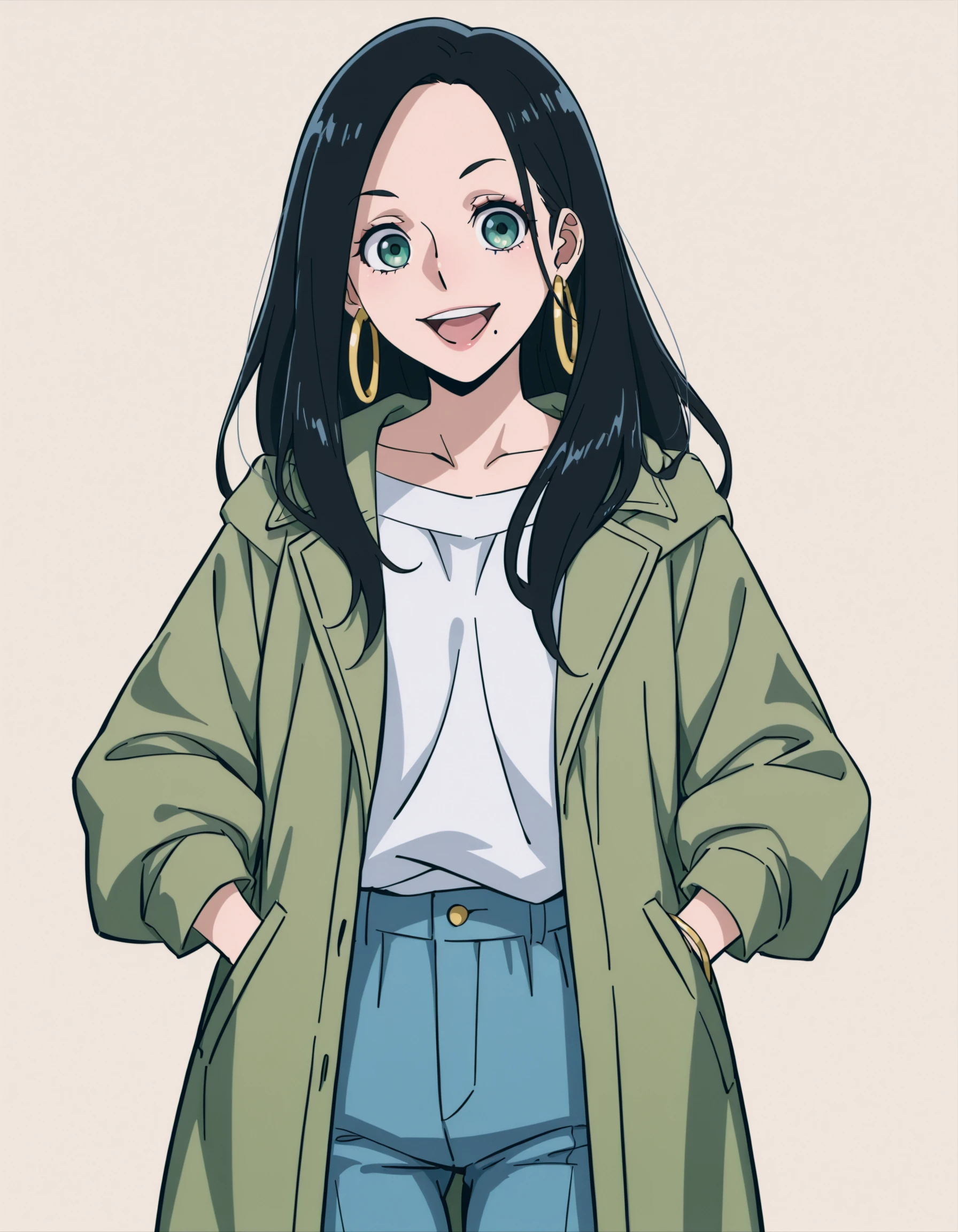 makokotsukauchi, black hair, long hair, 1girl, smile, mole, jewelry, solo, green eyes,