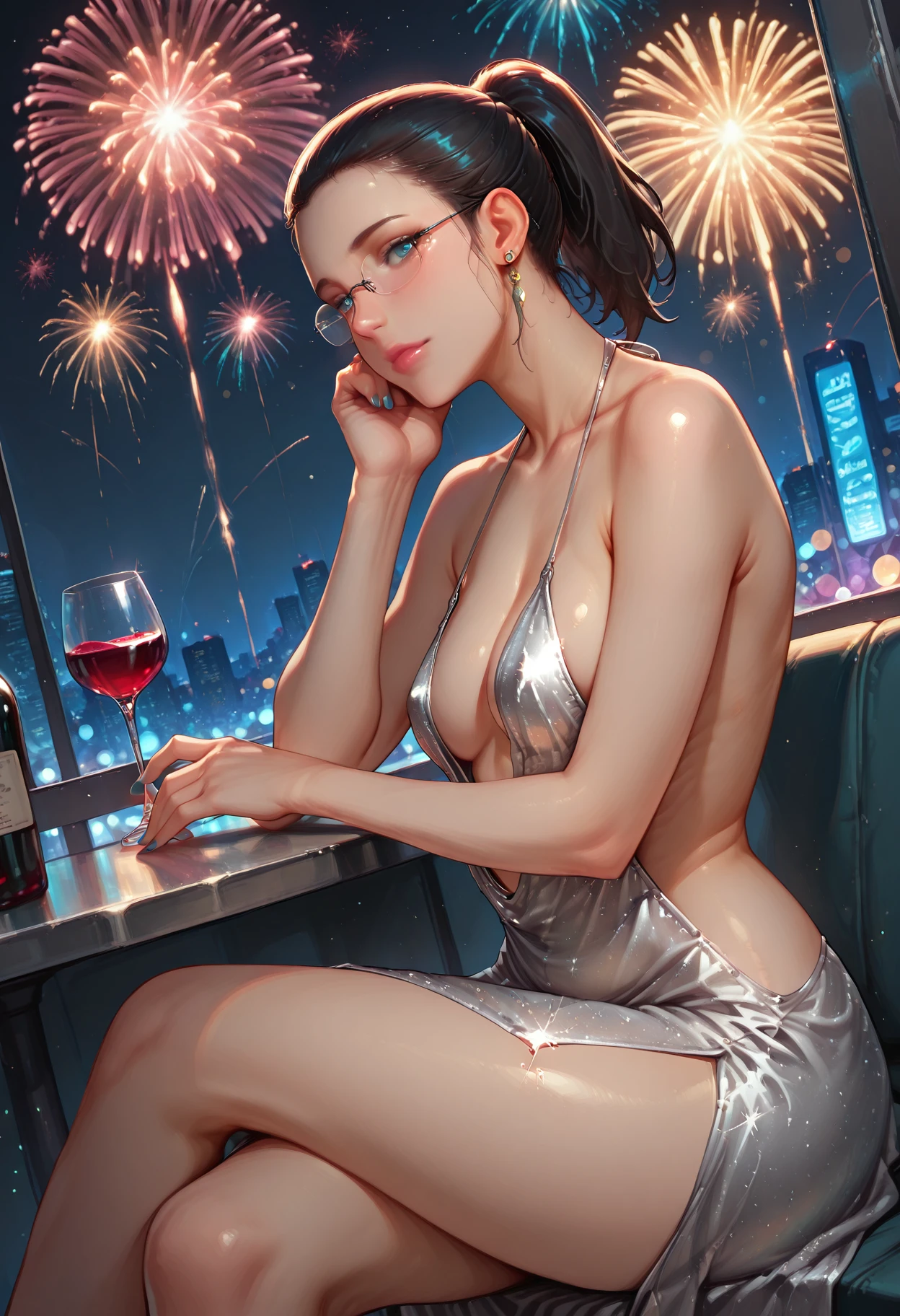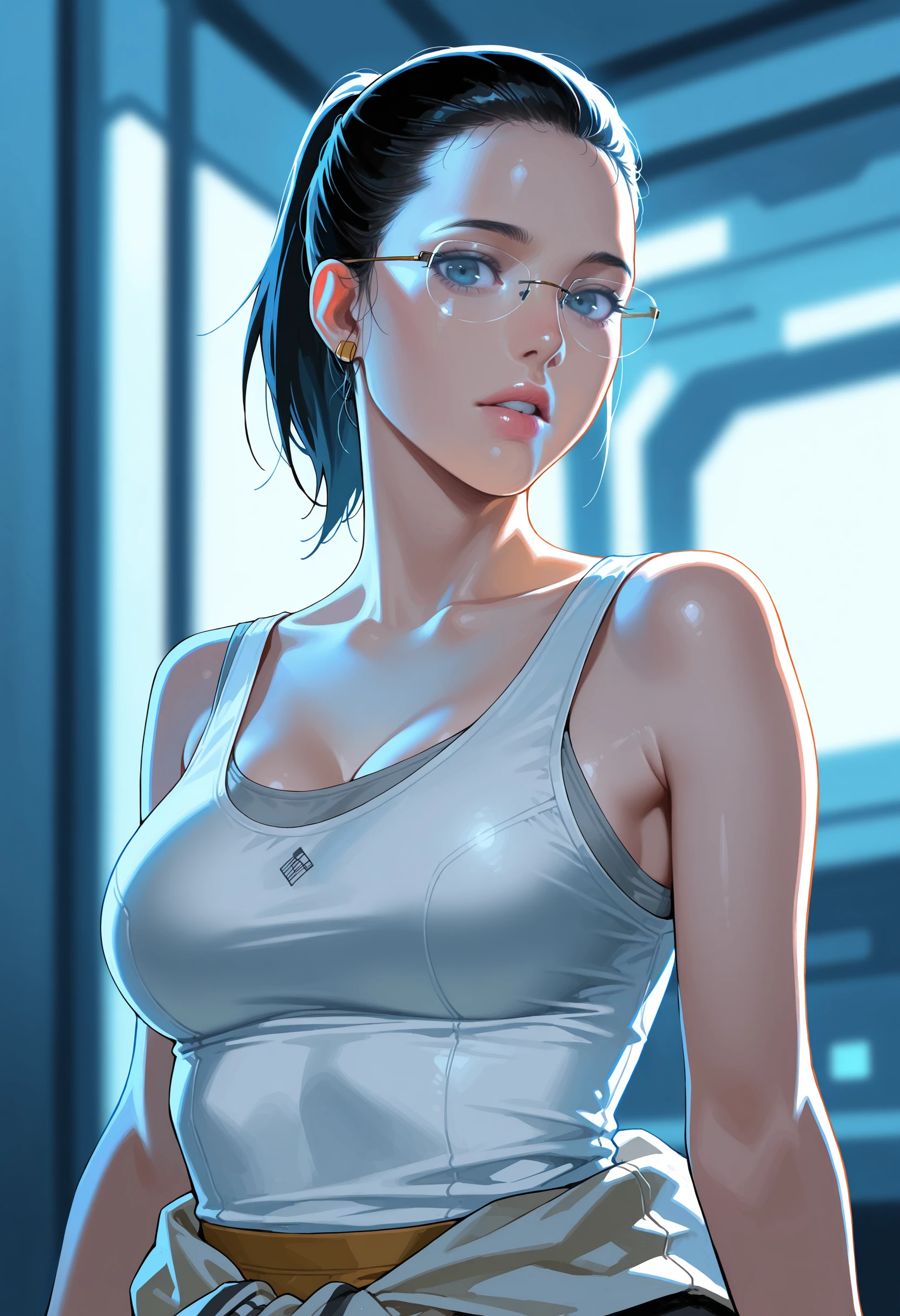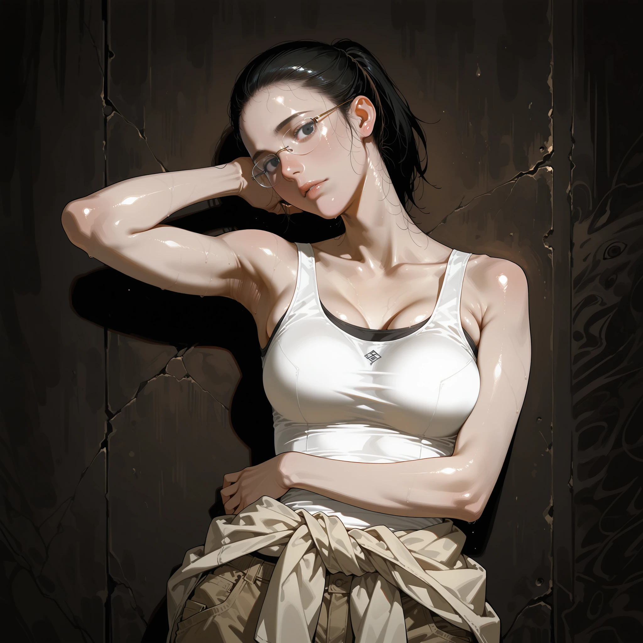 mamads, black hair, ponytail, glasses, earrings, rimless eyewear, medium breasts, brown pants, cargo pants, clothes around waist, white tank top