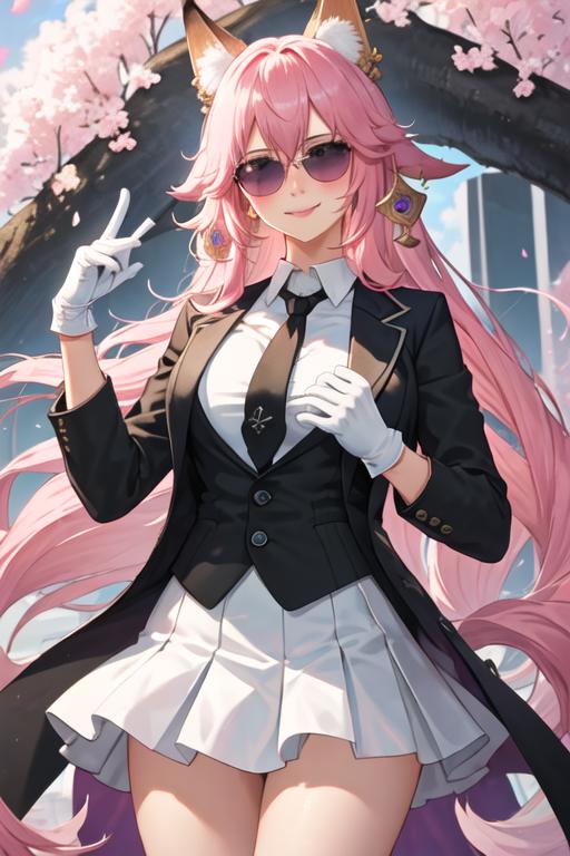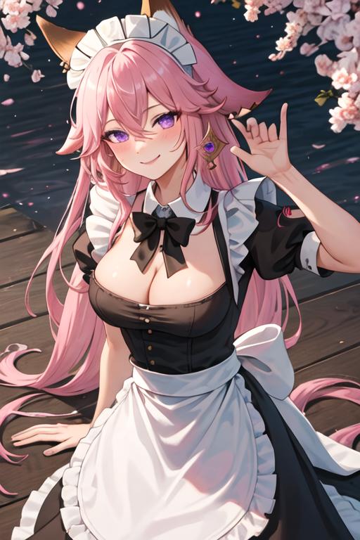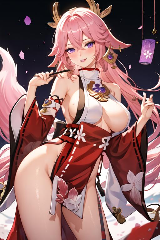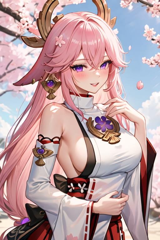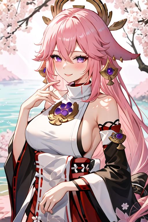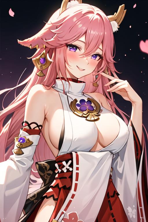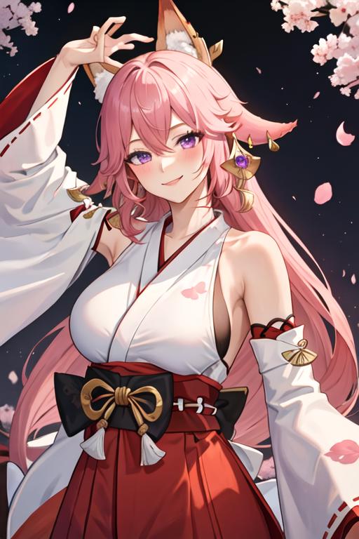 The trigger word is yae_miko_genshin, and the recommended tags are masterpiece, best quality, highres, solo, {yae_miko_genshin:1.10}, long_hair, pink_hair, purple_eyes, bangs, breasts, animal_ears, fox_ears, hair_between_eyes, jewelry, earrings, hair_ornament, smile, large_breasts, thighs, very_long_hair, blush, floppy_ears.