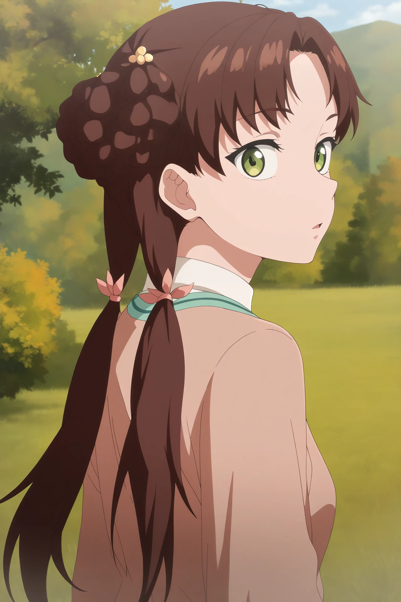 幼女琉璃:LiuLi2,1girl,solo,solo,aged down,female child,loli,cute girl,green eyes,brown hair,short hair,double bun,parted bangs,braid