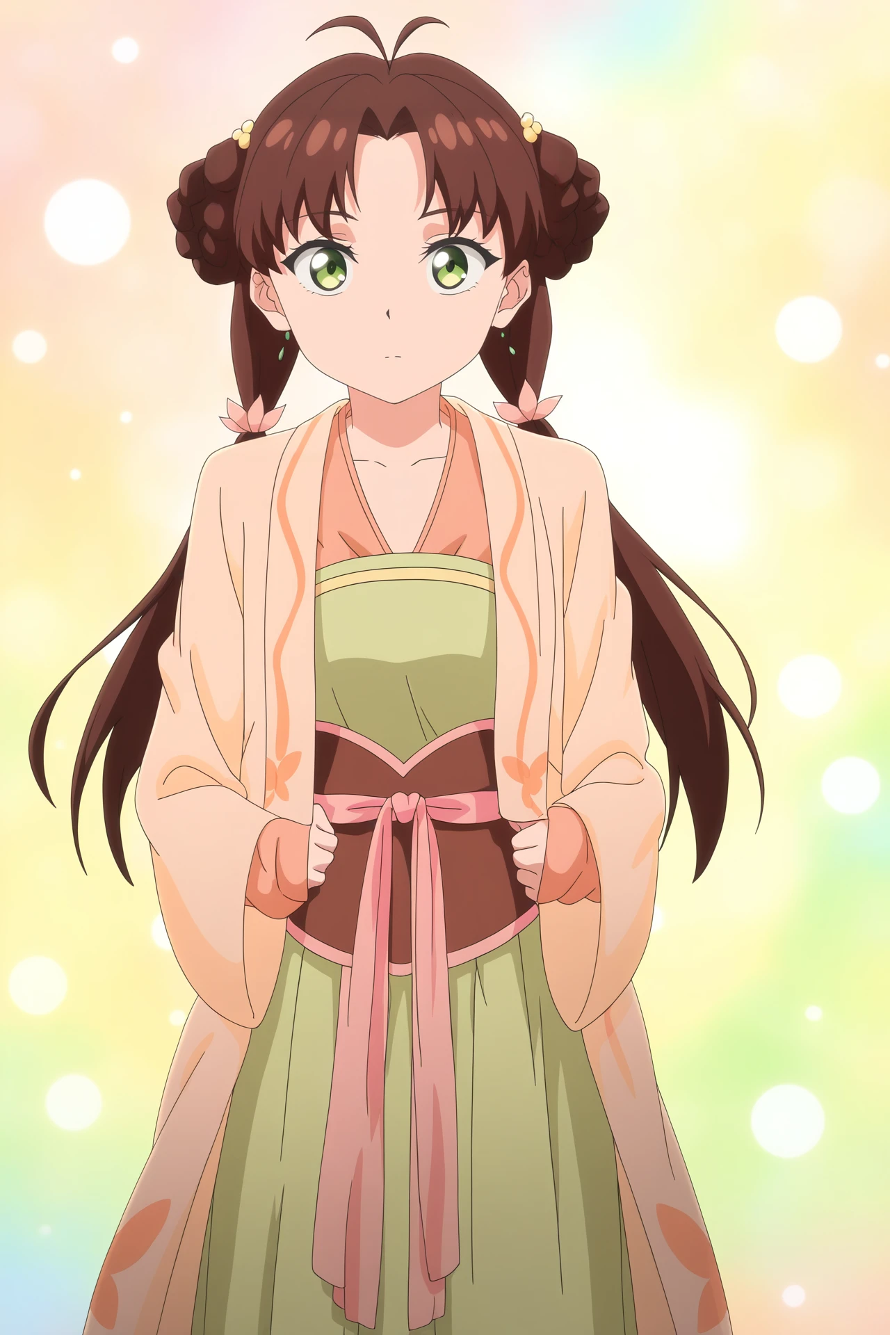 LiuLi,1girl,solo,brown hair,twintails,braid bun,double bun,parted bangs,green eyes,hair ornament,hair rings,ahoge