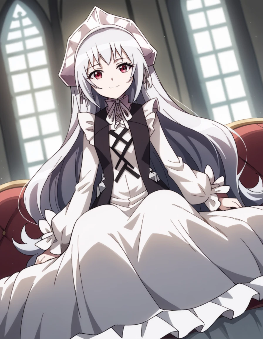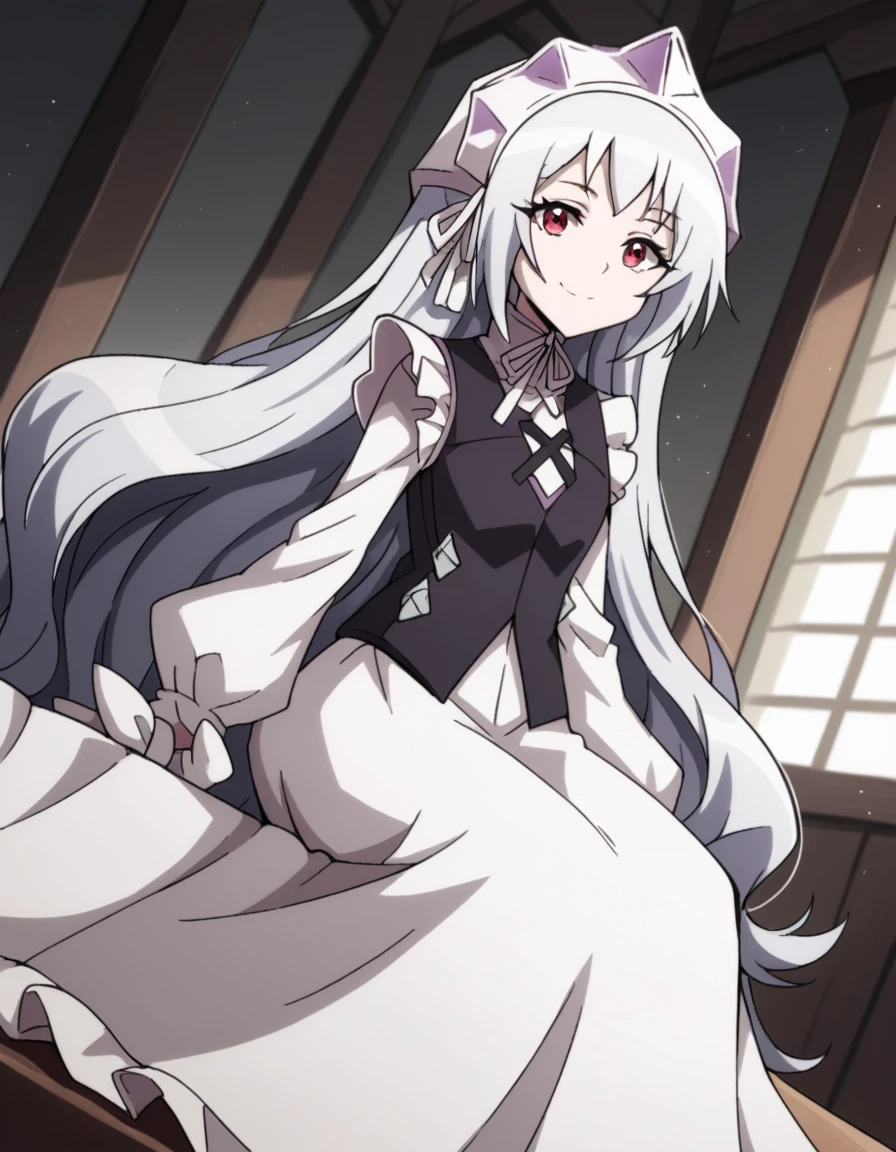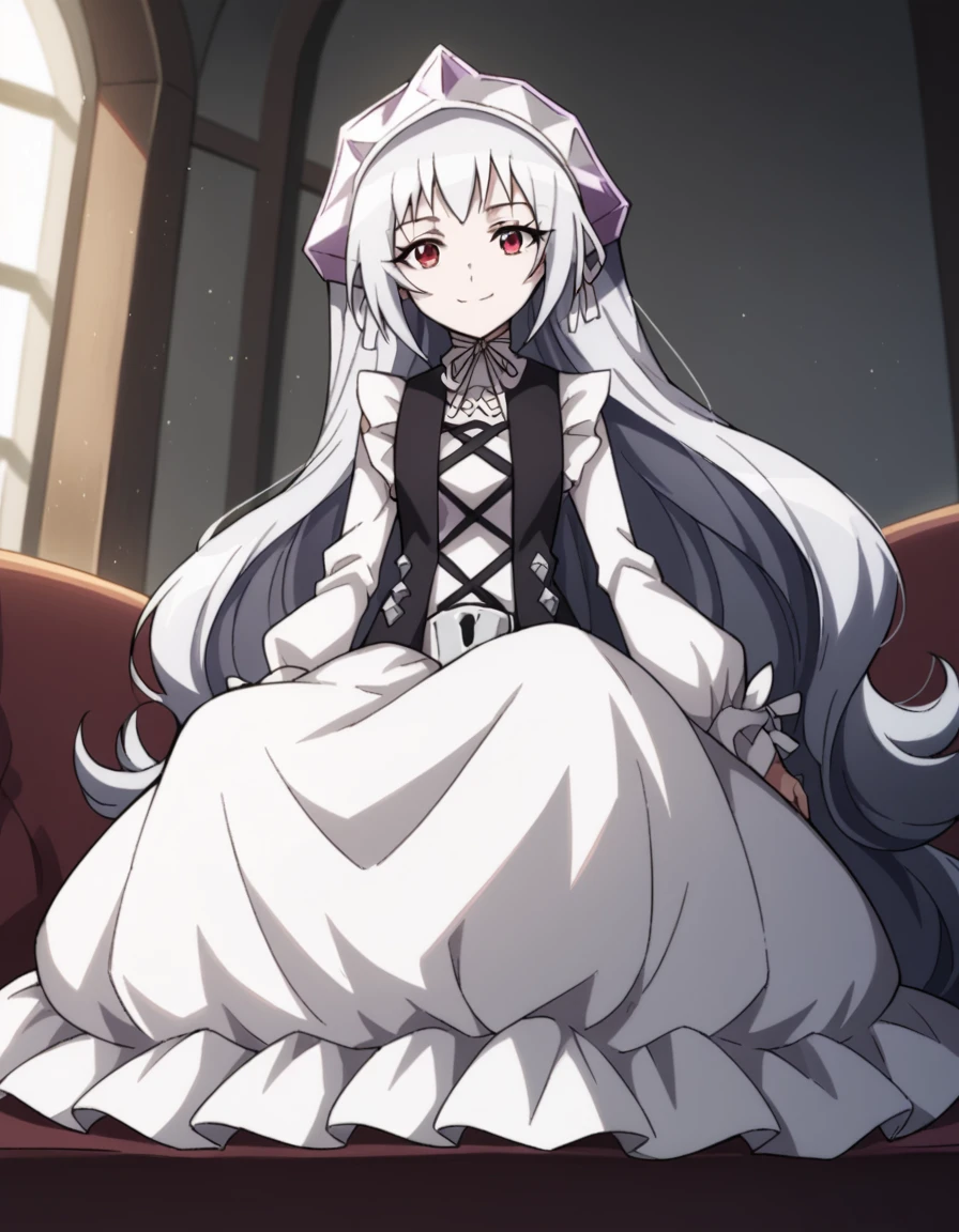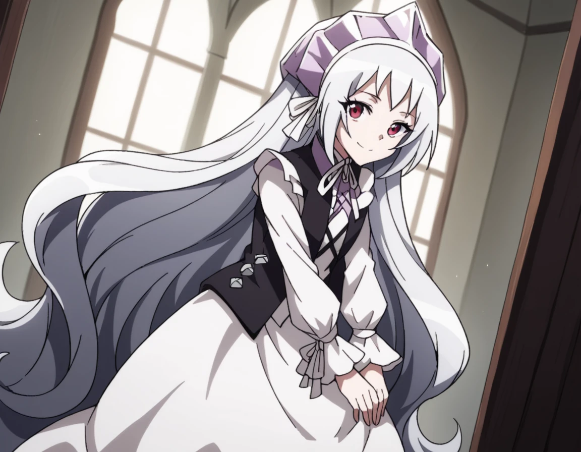 dress, frills, white dress, frilled sleeves, long sleeves, ribbon, headdress, white headdress, black vest, criss-cross straps,