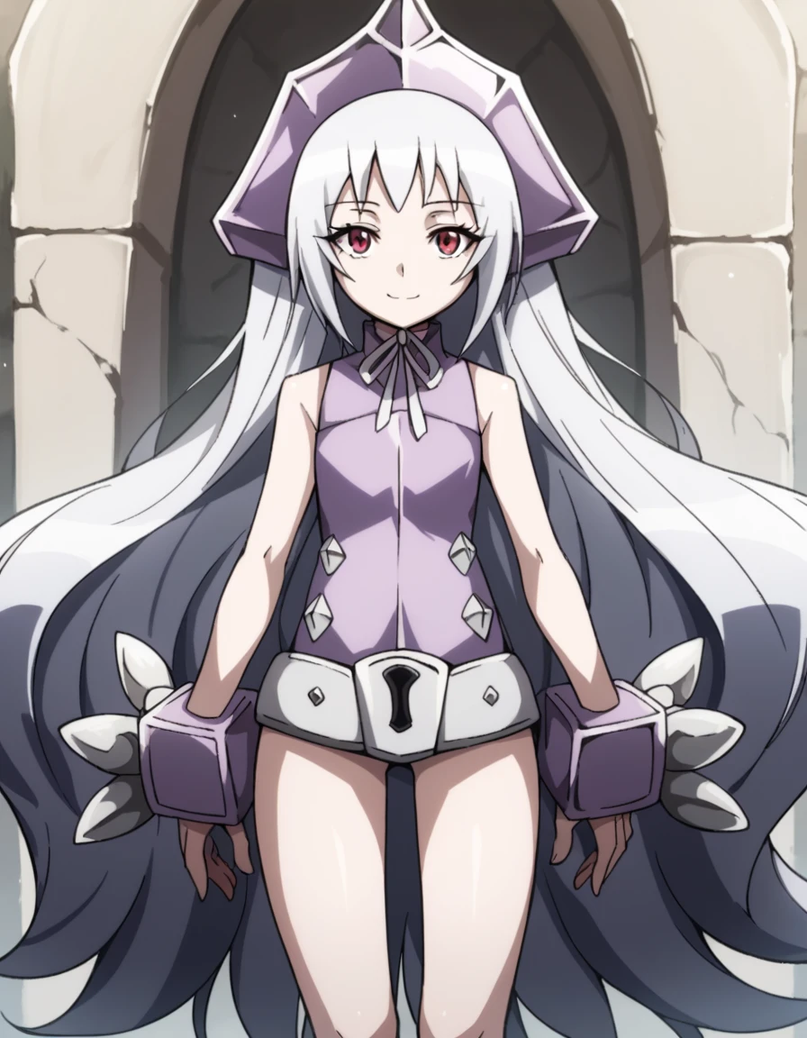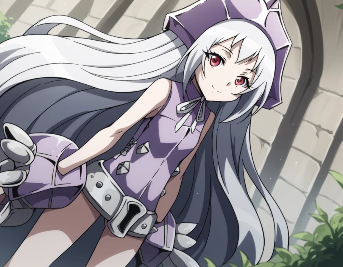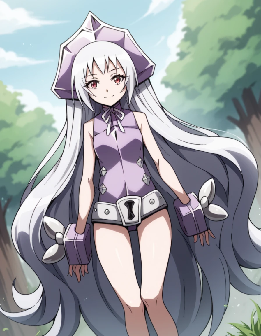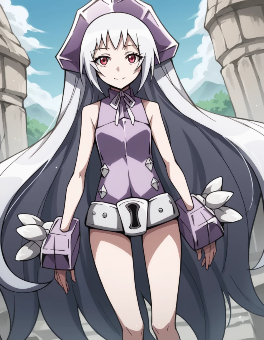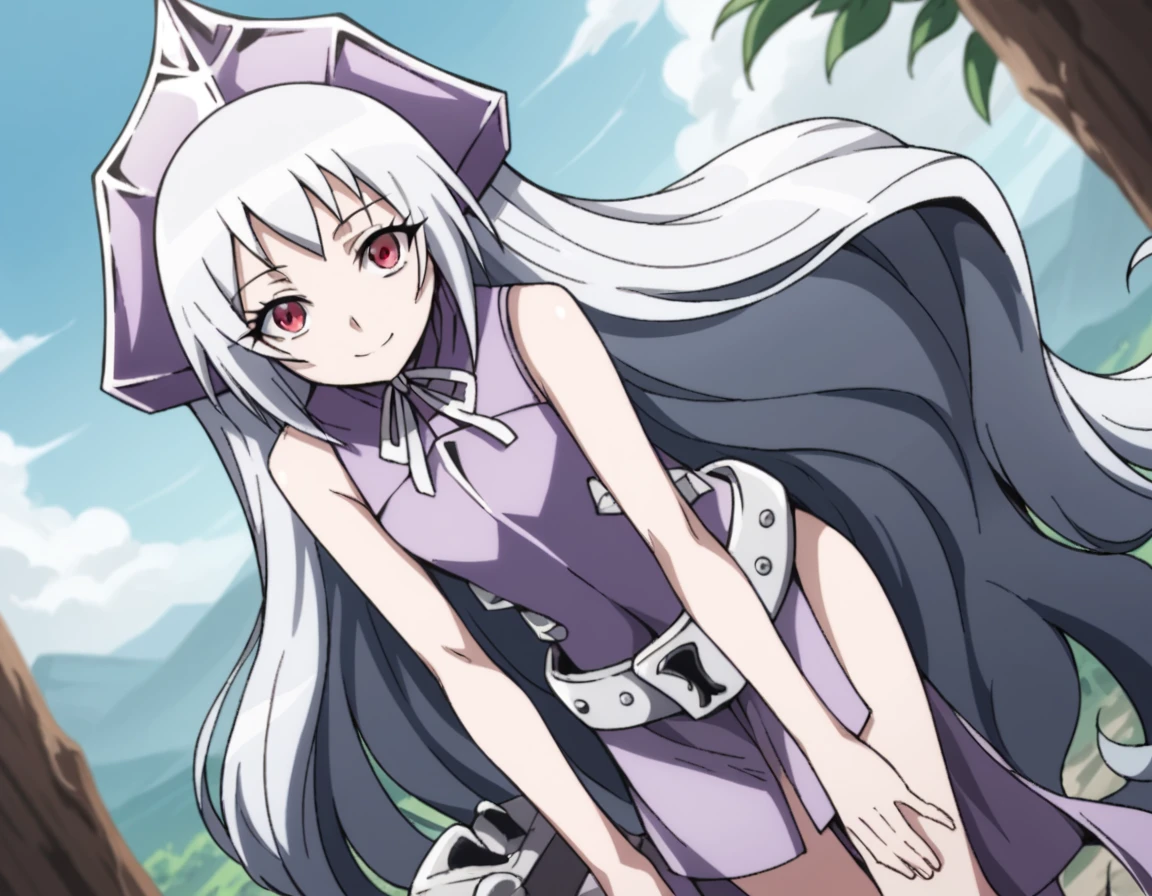 dress, sleeveless, purple dress, ribbon, headgear, hat, belt, bare shoulders, legs, bare legs,