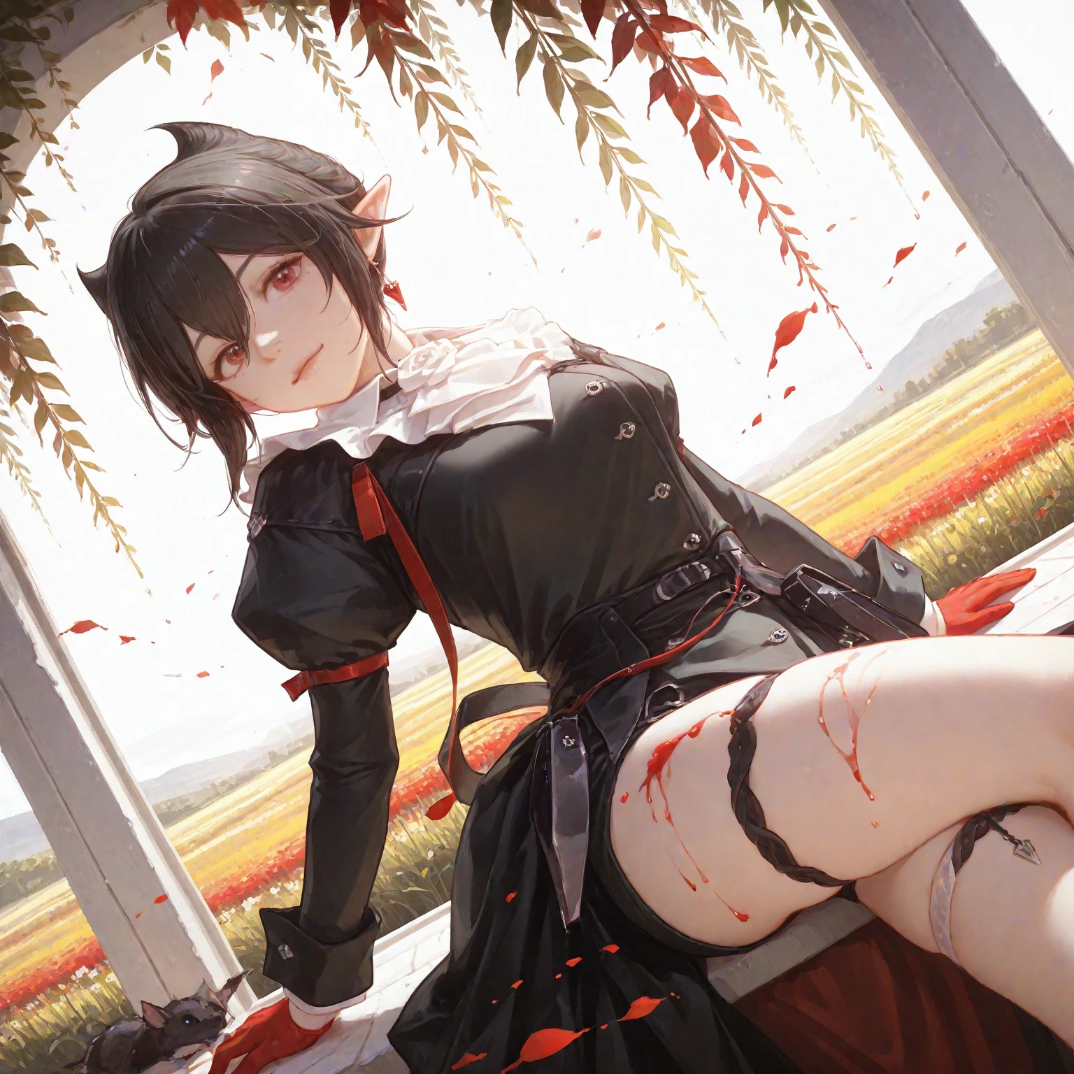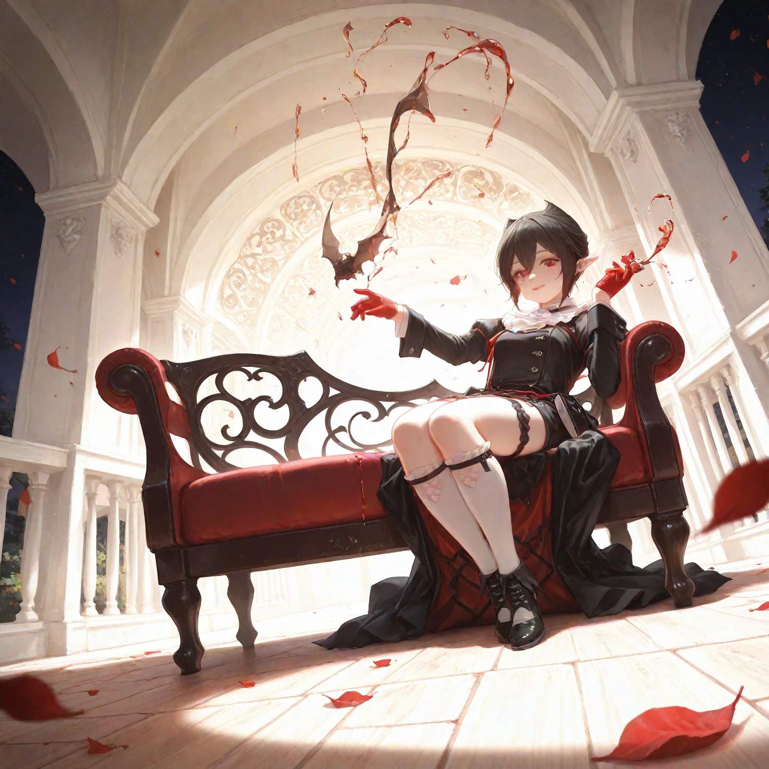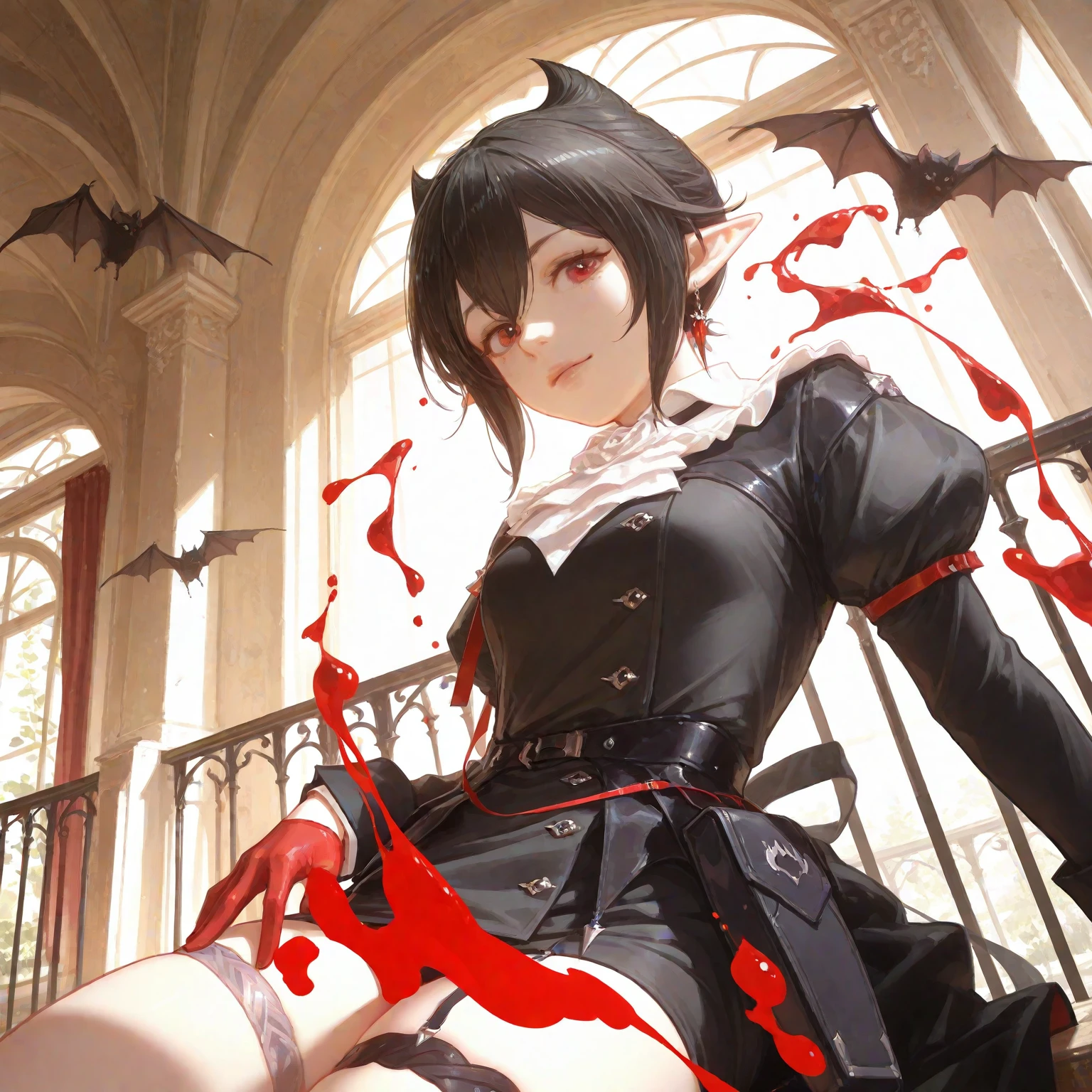 appearance: red eyes, black star-shaped pupils, pointy ears, black hair, short hair, vampire,