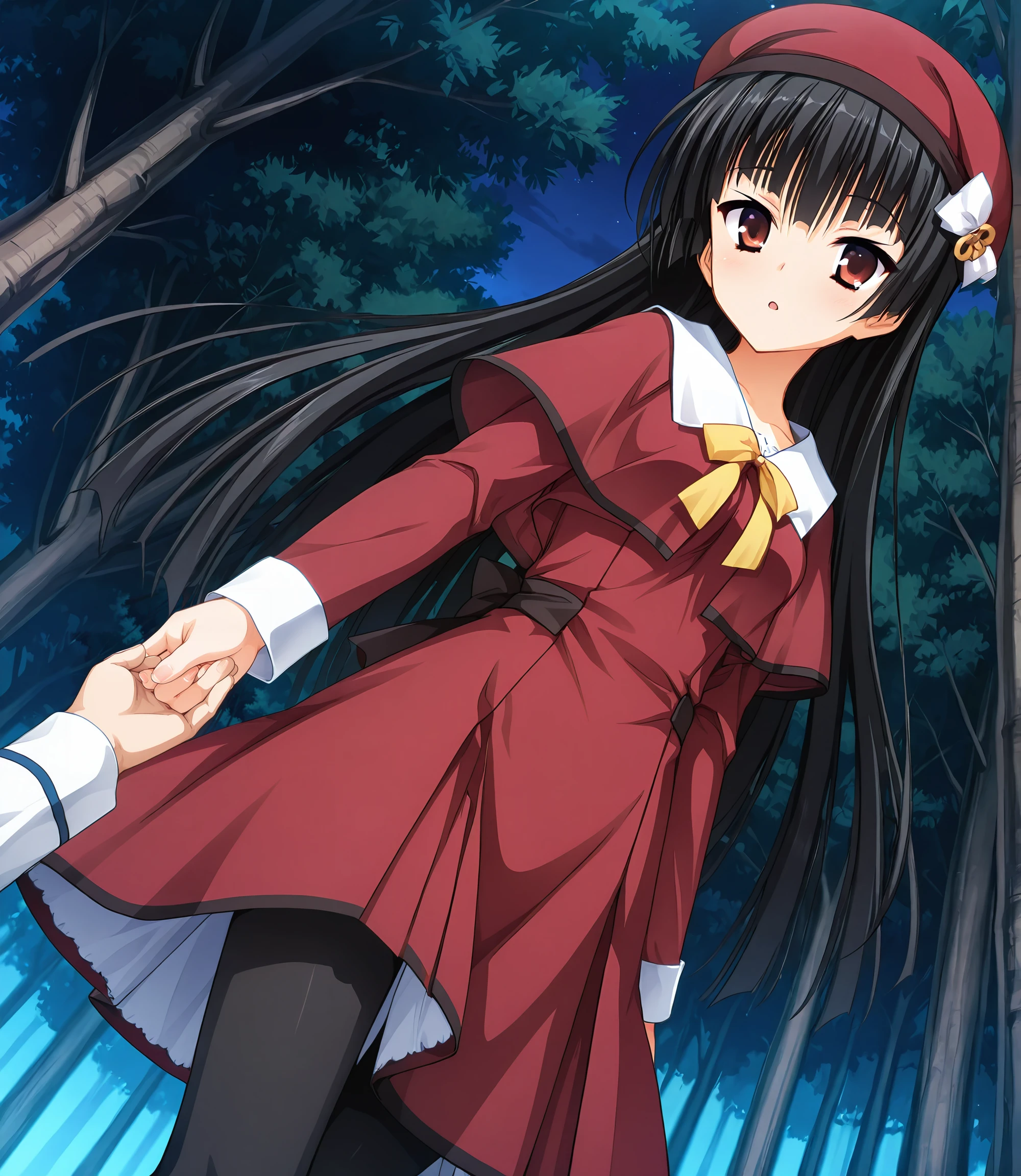 red beret, white bow hat ornament, knot ornament, red dress, capelet, white sailor collar, yellow bow, long sleeves, white cuffs, black trim, black waistband, black pantyhose, brown lace-up boots,