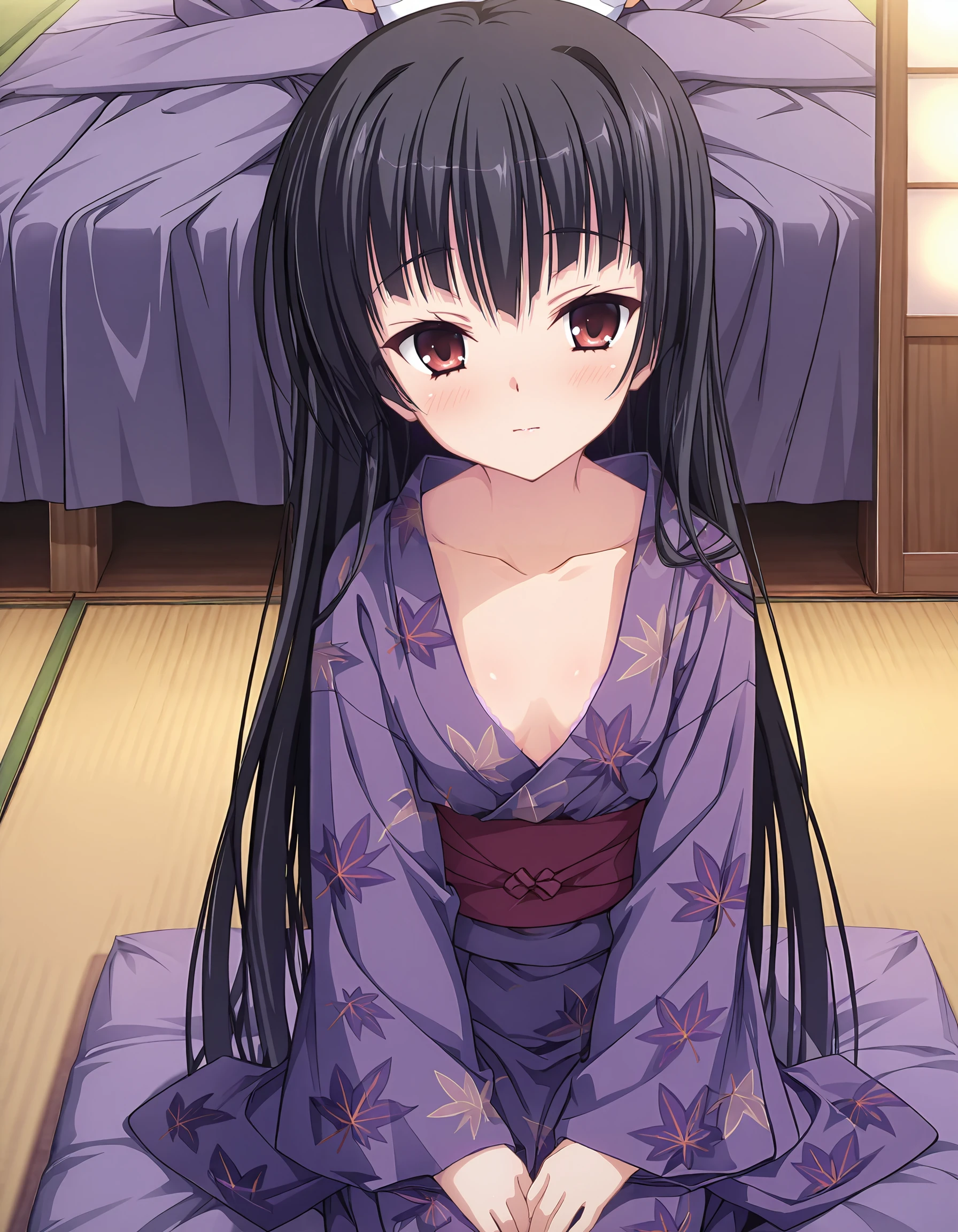 yukata,japanese clothes,purple yukata,leaf print,red obi,