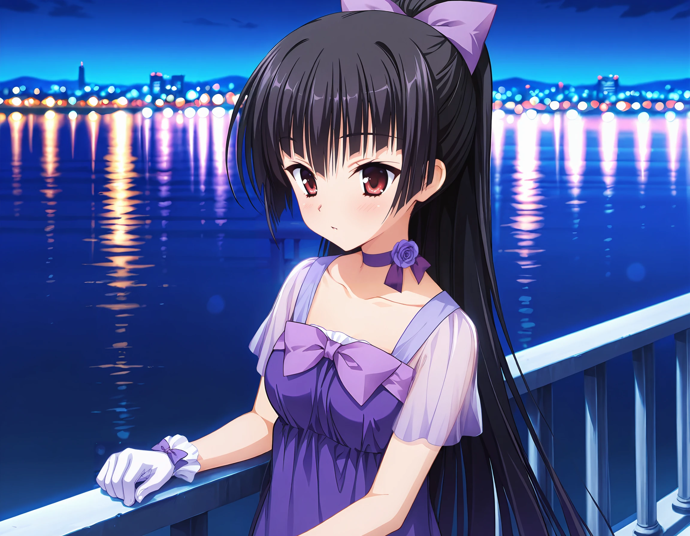 purple dress, purple bow, see-through sleeves, rose choker, white gloves, purple sandals, ponytail, purple hair bow,