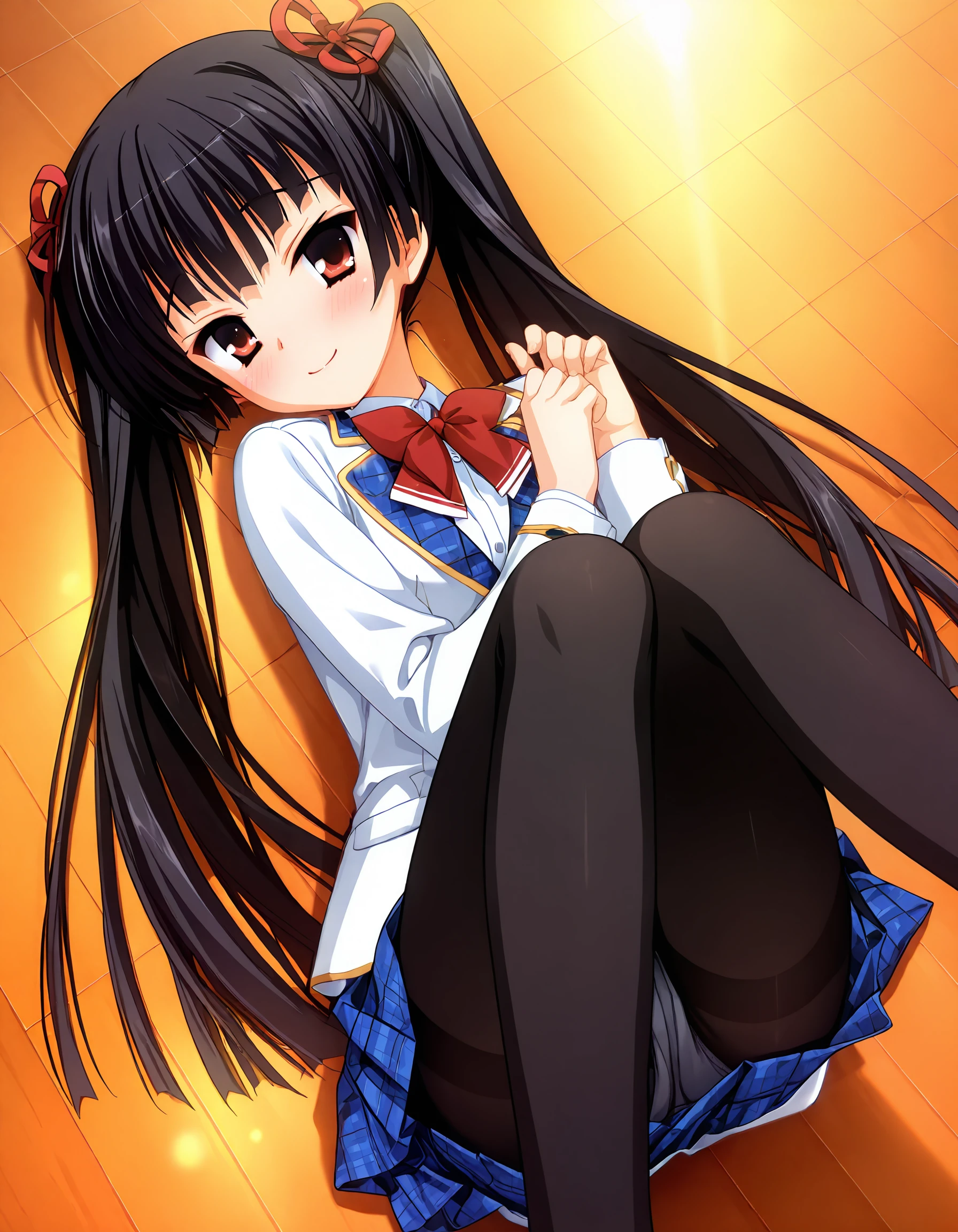 school uniform, white blazer, blue plaid trim, gold trim, emblem, white shirt, red bow, blue plaid pleated skirt, black pantyhose, brown loafers, twintails, red hair ribbons,