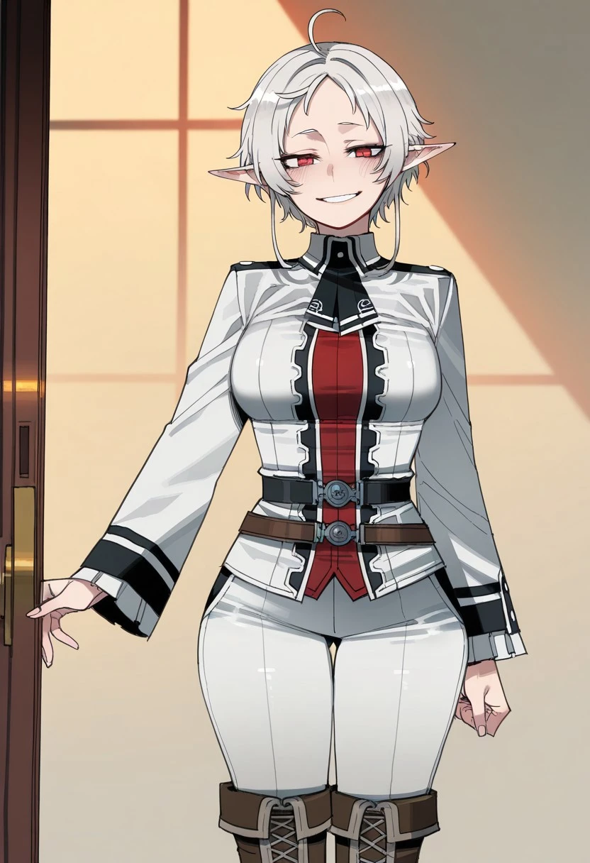Sylphiette Greyrat from mushoku tensei, short hair, ahoge, white hair, pointy ears, elf, red eyes, medium , long sleeves, boots, white pants, uniform, shirt, white shirt,