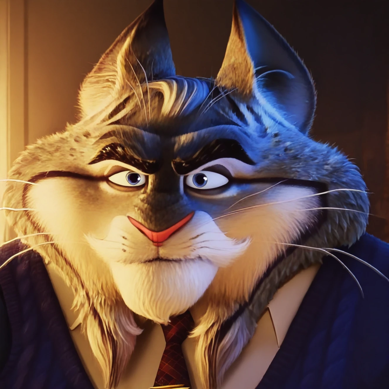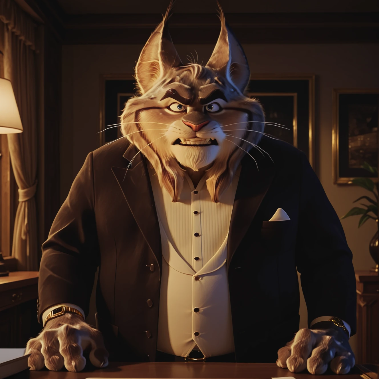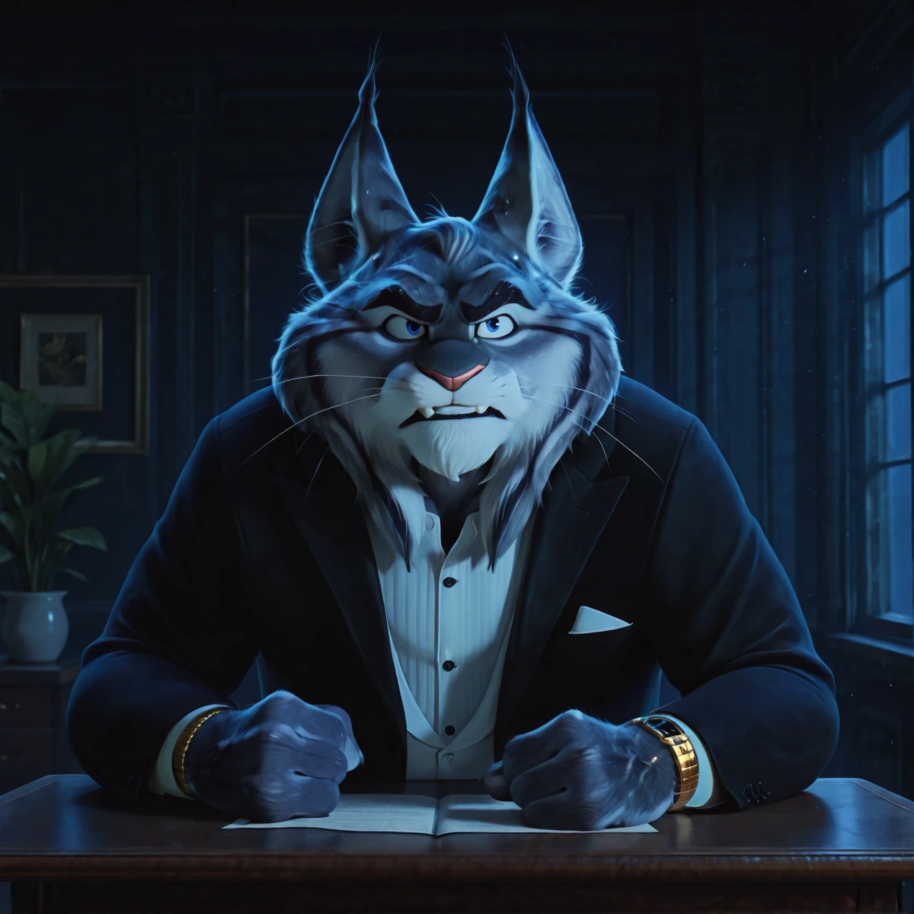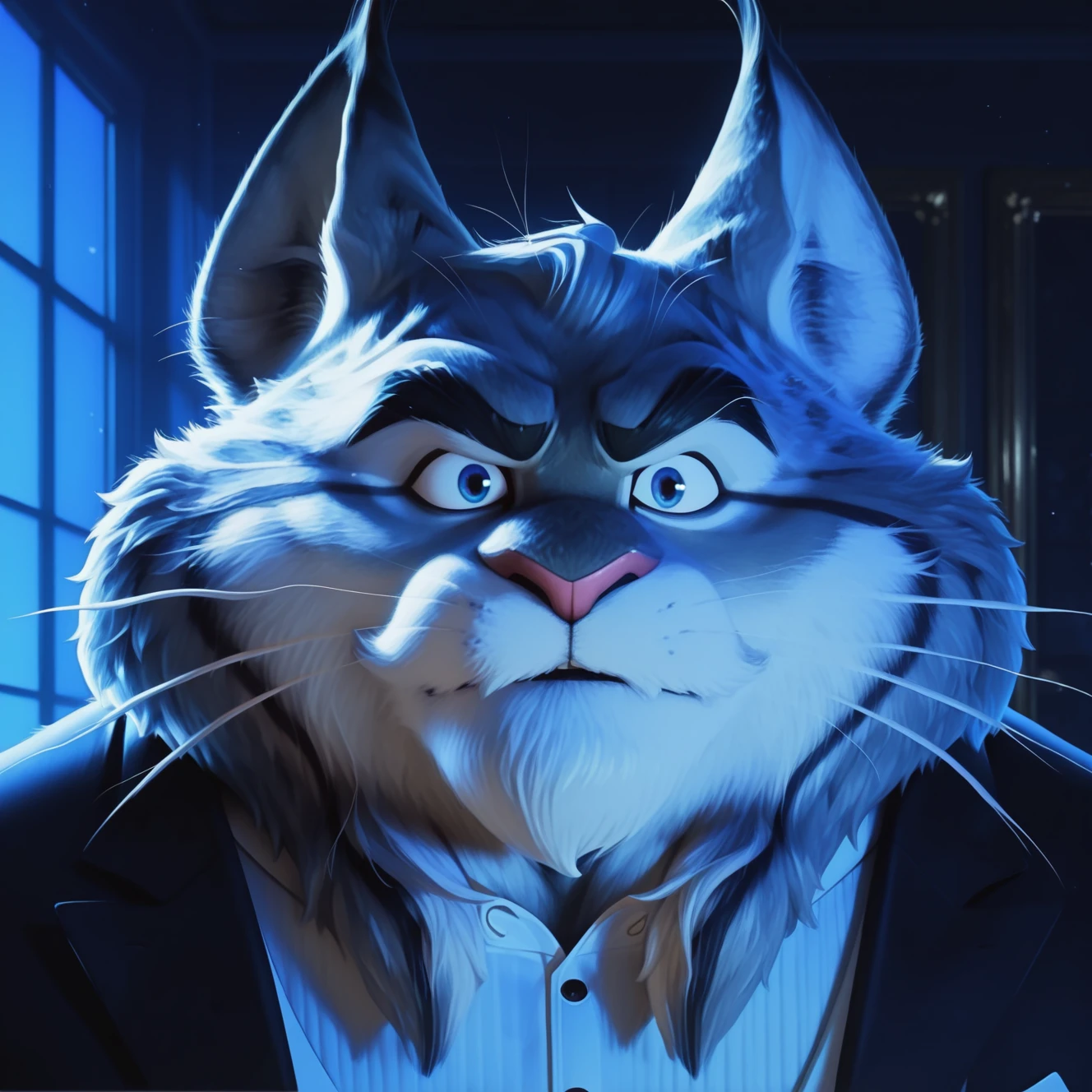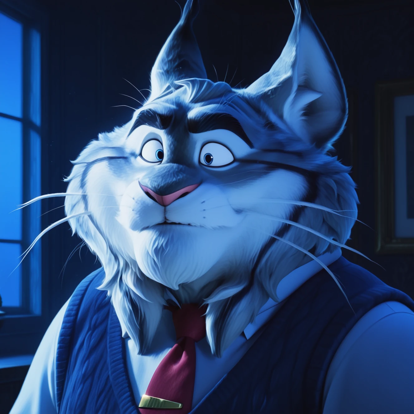 Milton, solo, furry male, 1boy, mature, thick eyebrows, lynx, white whiskers, white fur mustache and beard, black streaks surrounding cheeks eyes, gray fur, long tall ears with black fur protruding from the top, blue eyes, formal, black jacket, white undershirt, black buttons, white cloth in coat pocket, gold watch, black pants, white sleeve collars, blue sweater vest, red tie with gold clip, white collared undershirt, black pants,