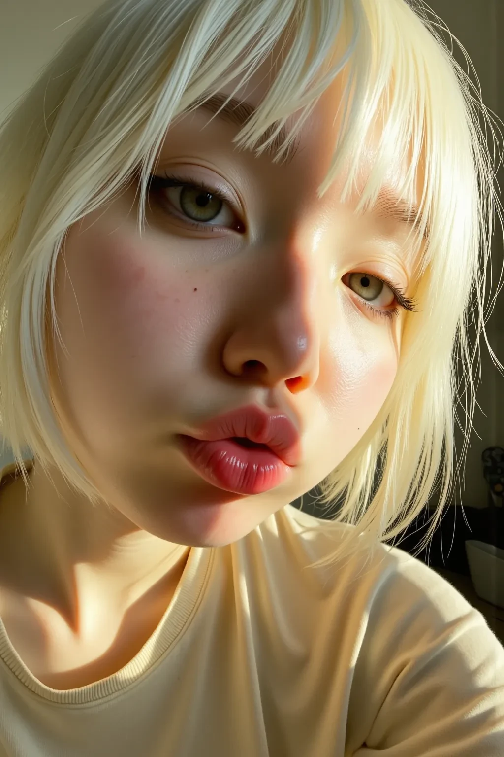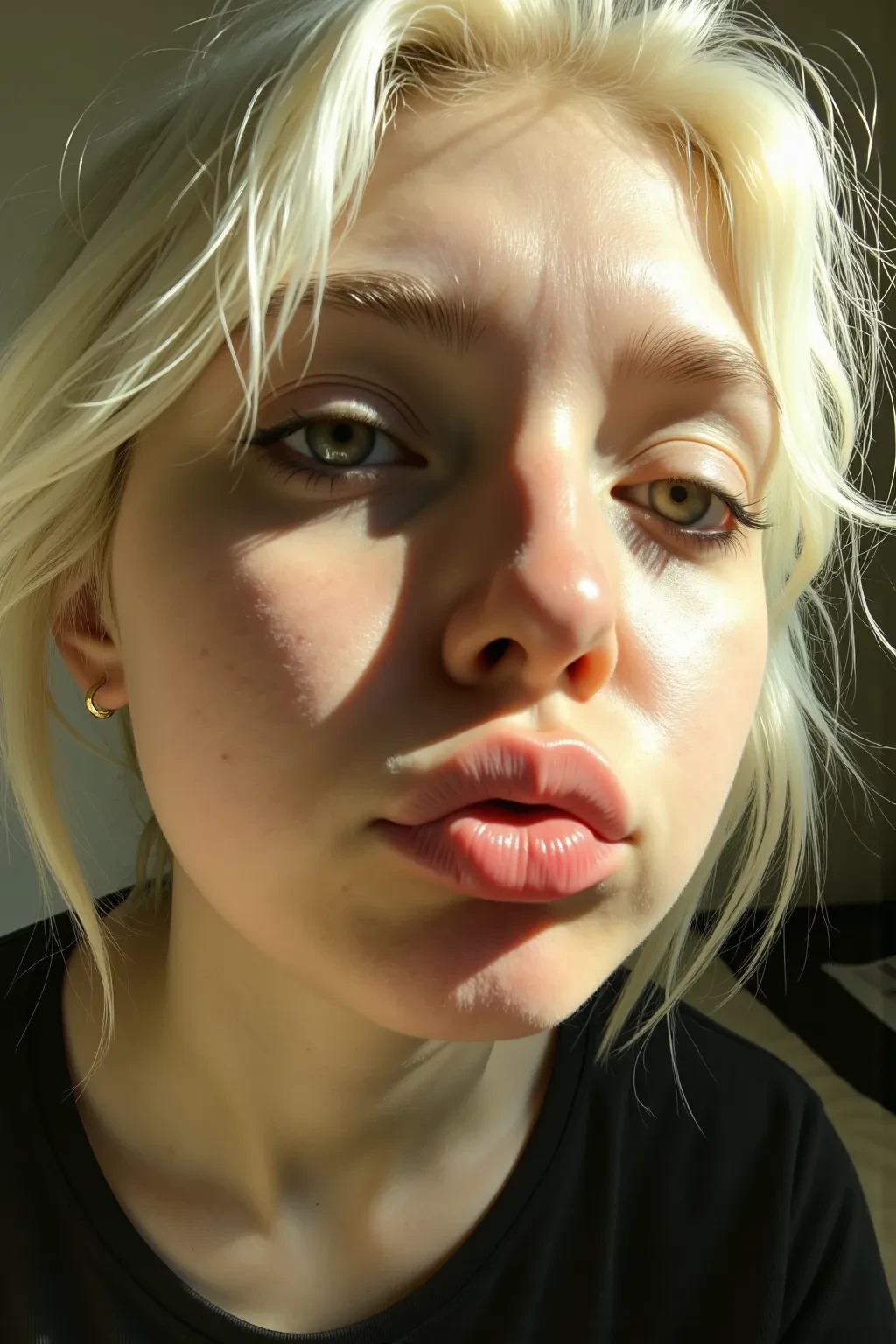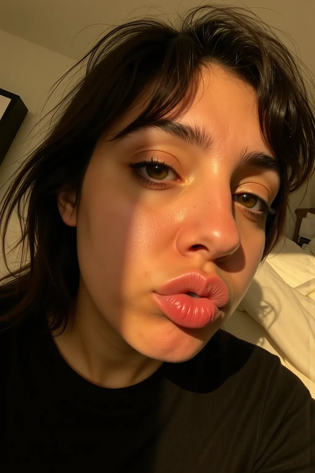 k1ssm3pl34s3, (poorly angled selfie:1.2) of a cute girl with (accidental duck face:1.3), messy hair falling over face, uneven lighting, slight blur, plain bedroom background, (pouty cute lips:1.4)
